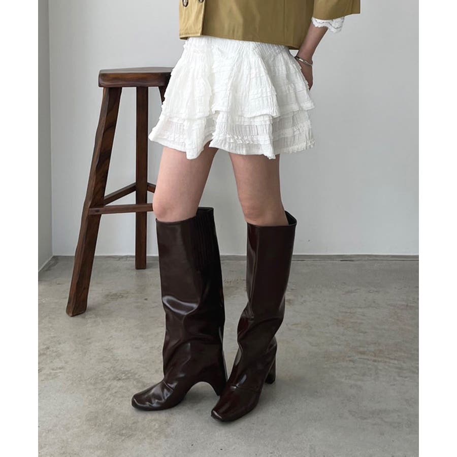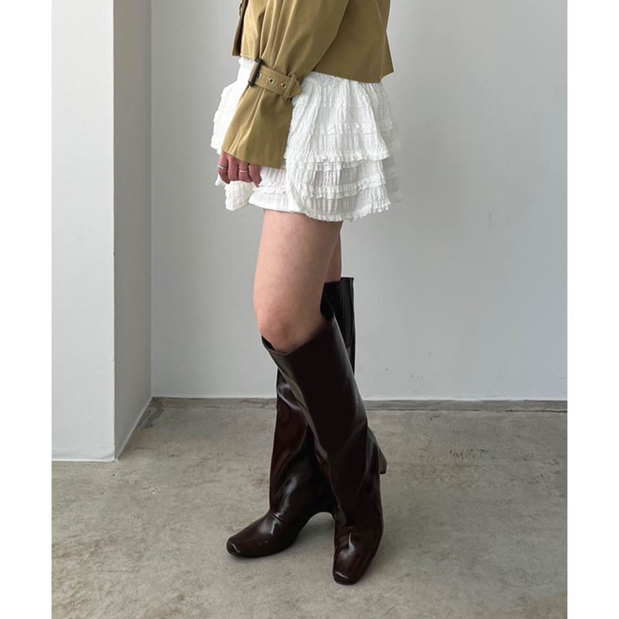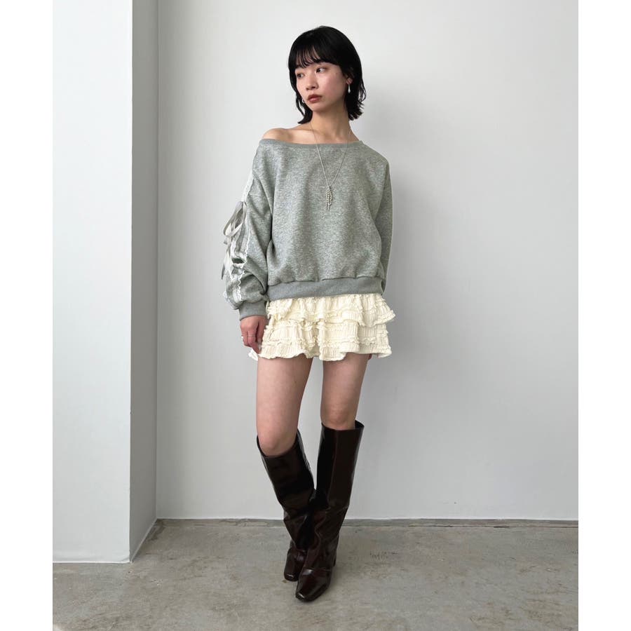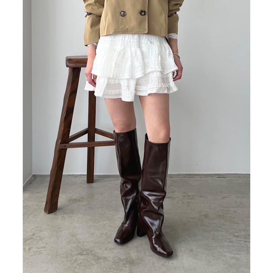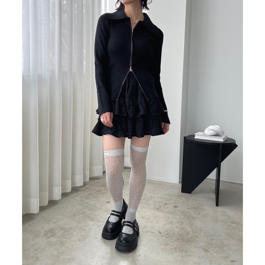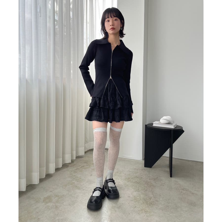 レースのようなフリルがついた生地で仕立てたミニスカート。