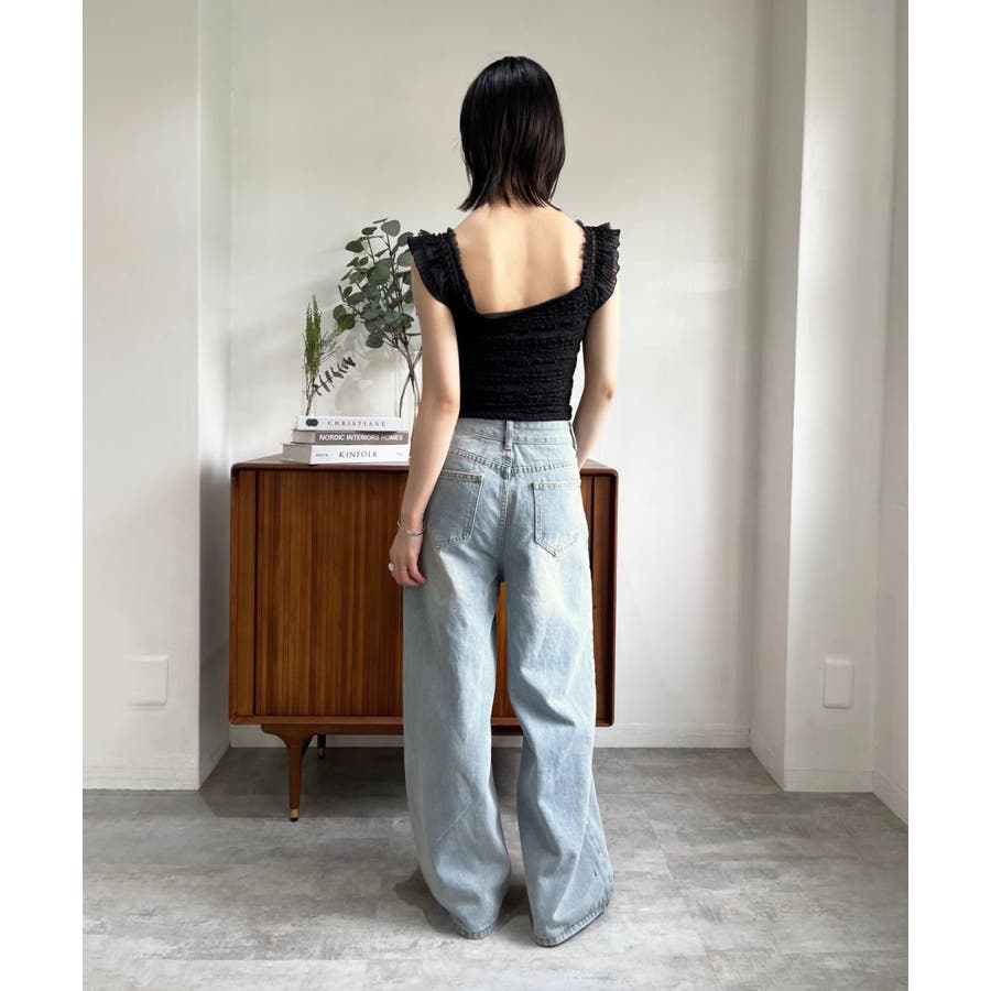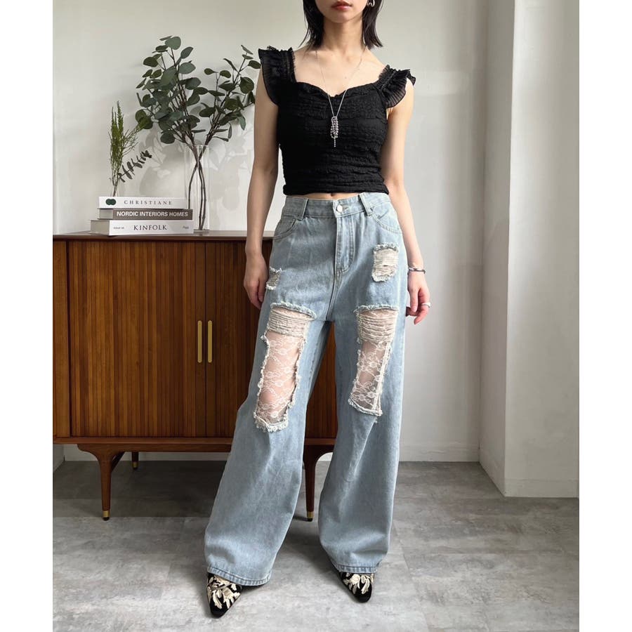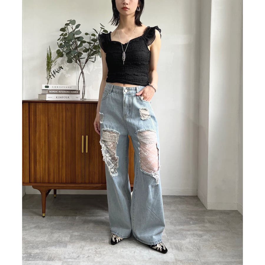 フリルトップスやシアーのレーストップスなどでガーリーに合わせたり