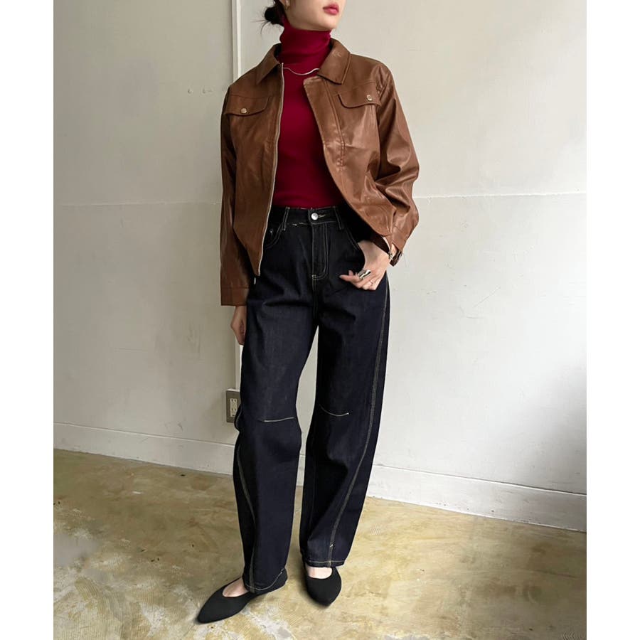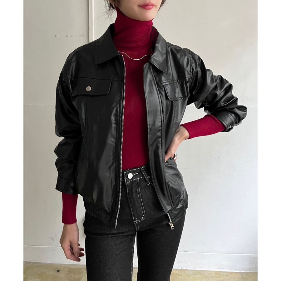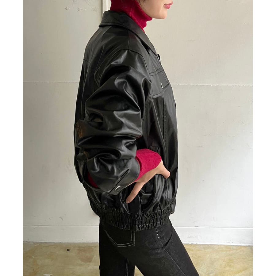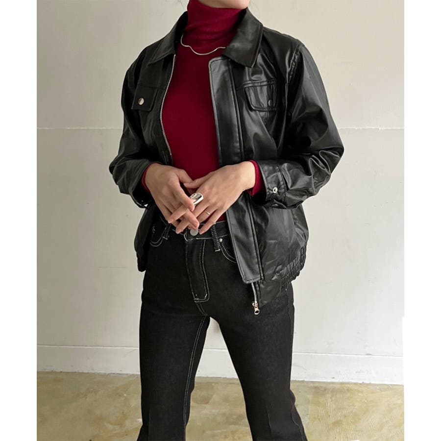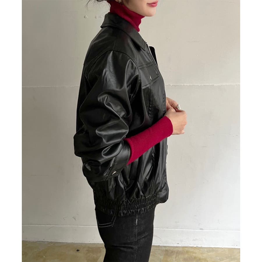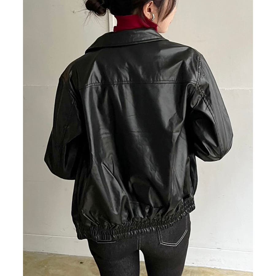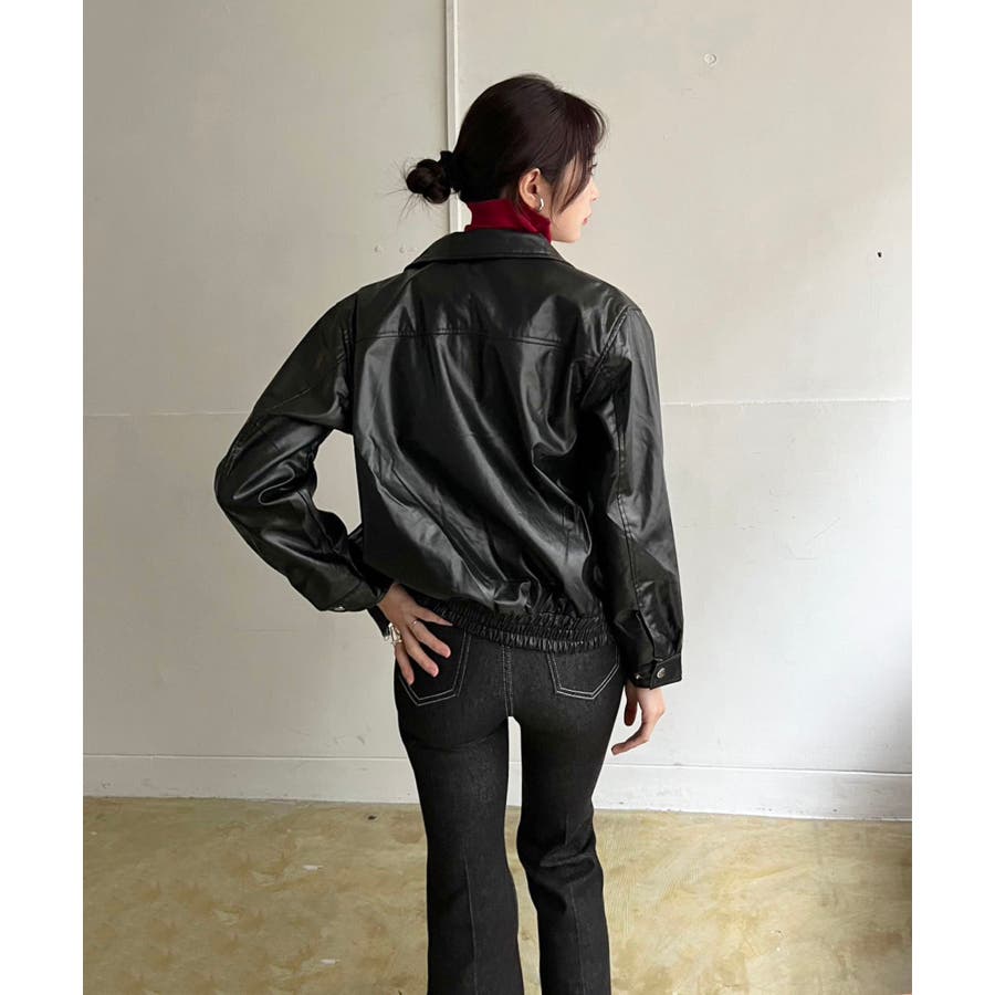 光沢感あるフェイクレザーを使用し、マニッシュな雰囲気に。