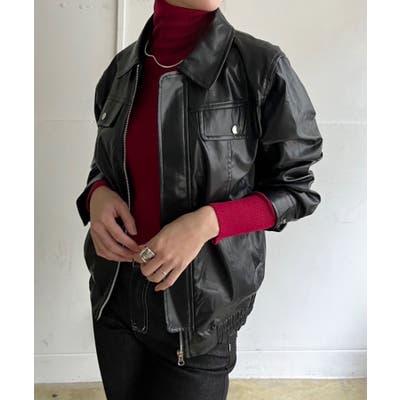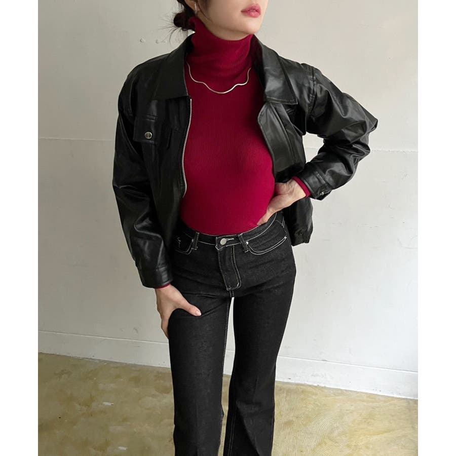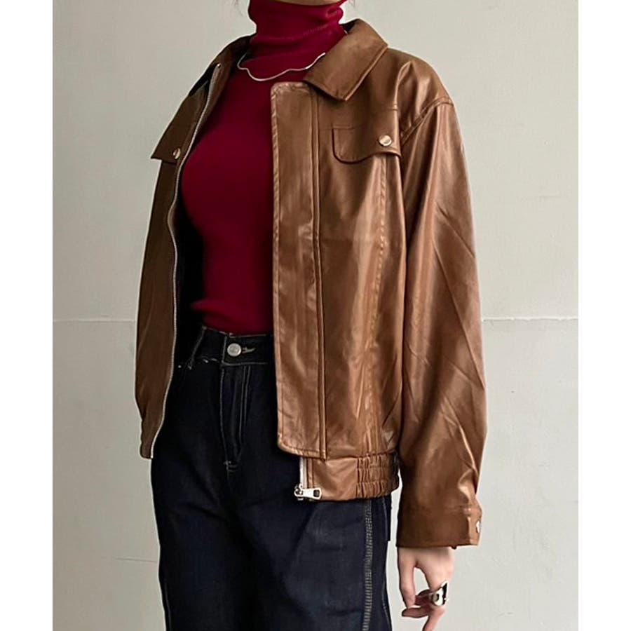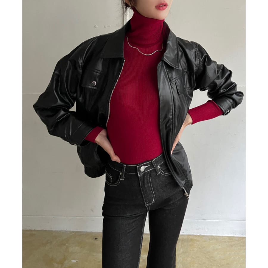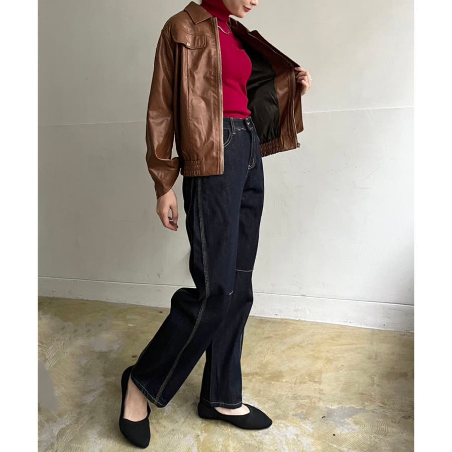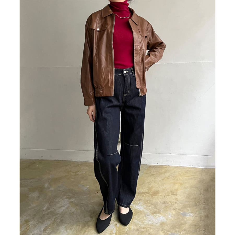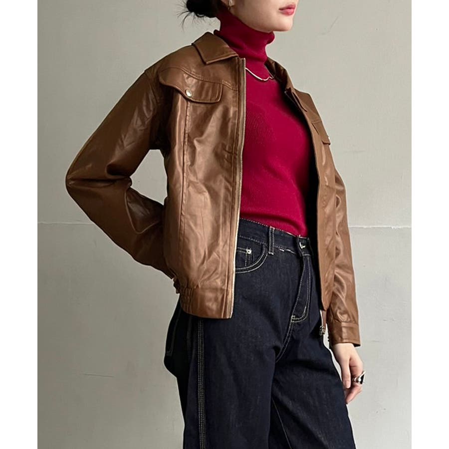 光沢感あるフェイクレザーを使用し、マニッシュな雰囲気に。