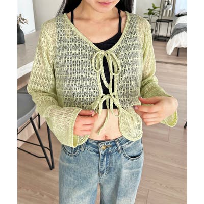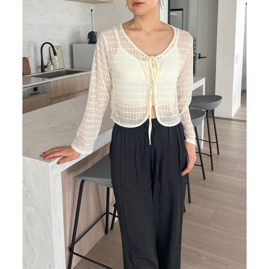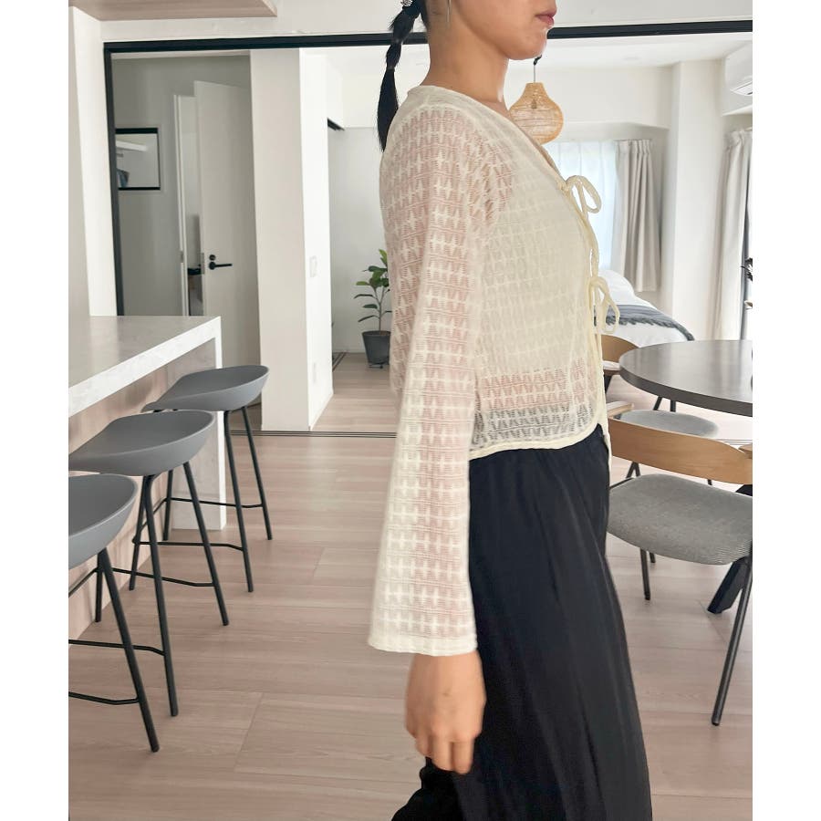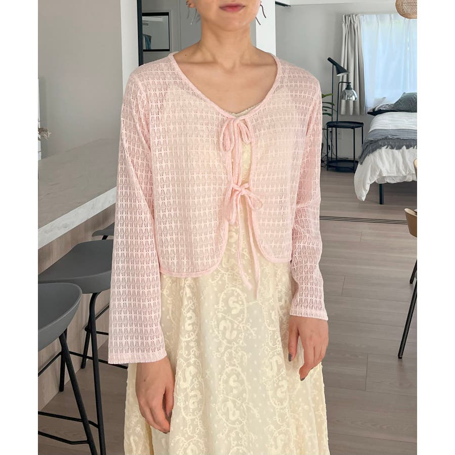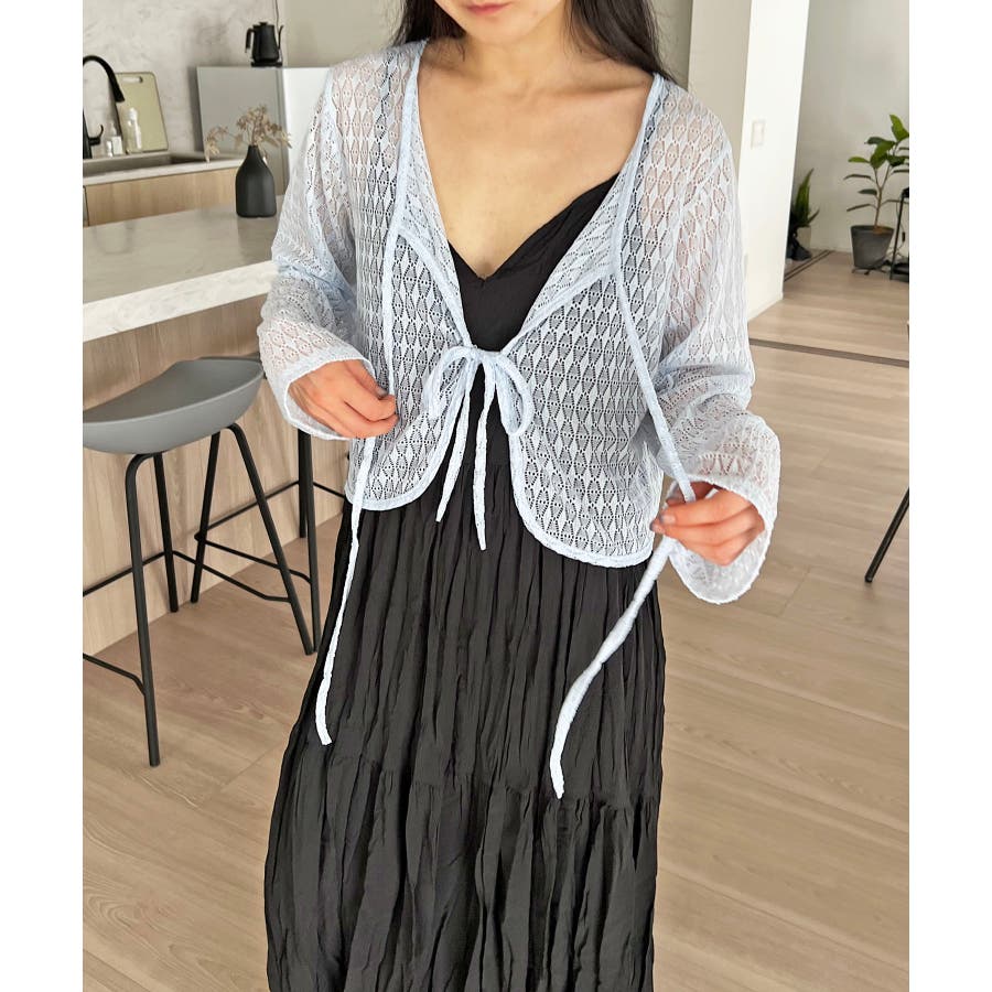 細かなダイヤ柄のような透かし編みが目を惹くショートカーディガン。