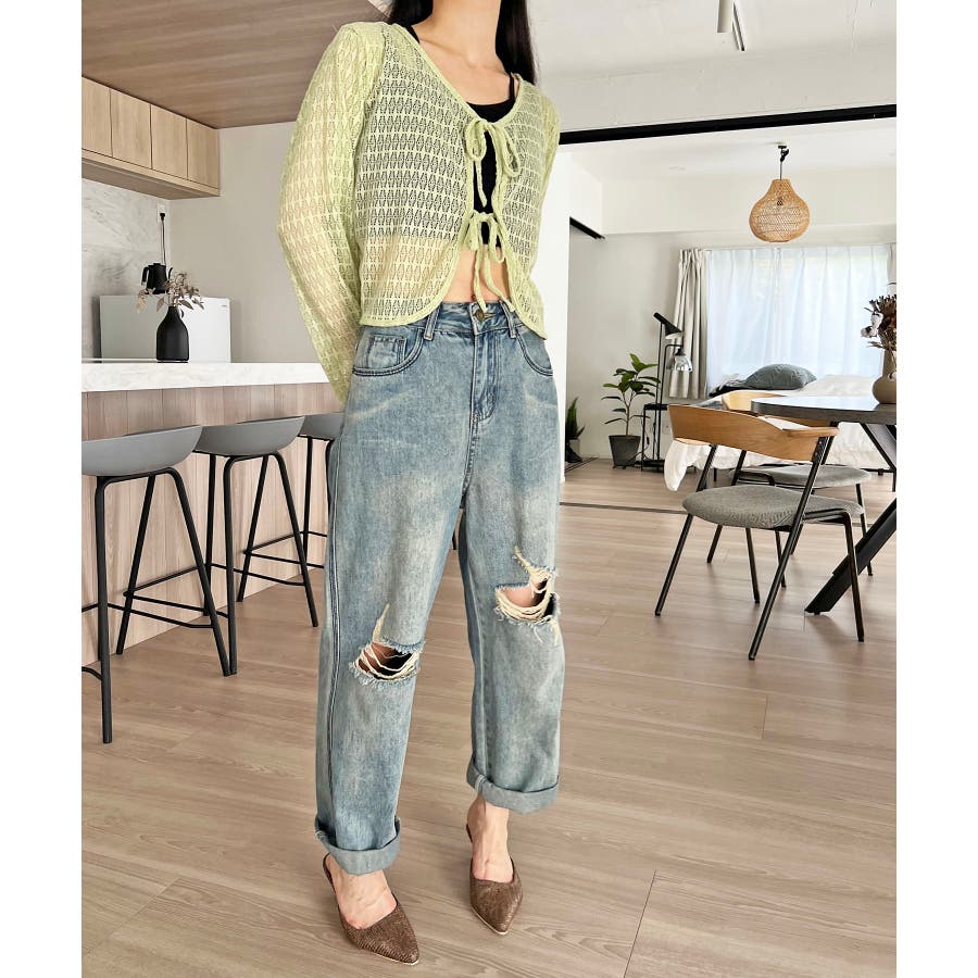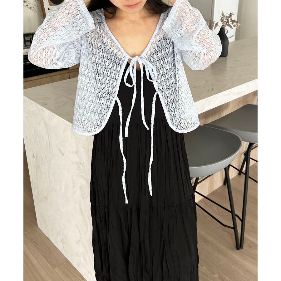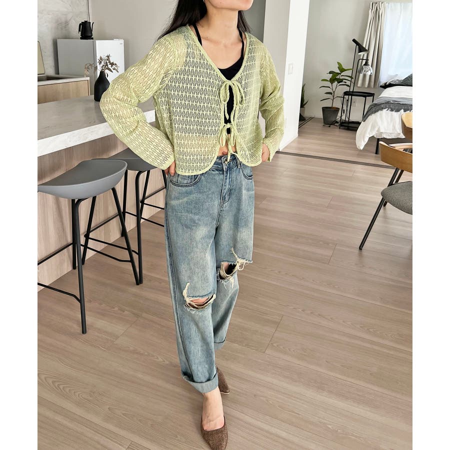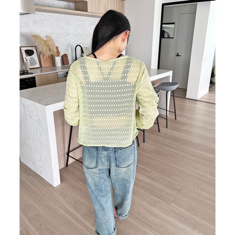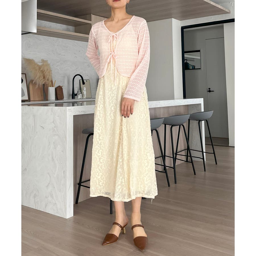 細かなダイヤ柄のような透かし編みが目を惹くショートカーディガン。