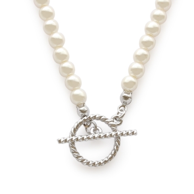 2種類のマンテル(留め具)がポイントになったパールネックレスです。