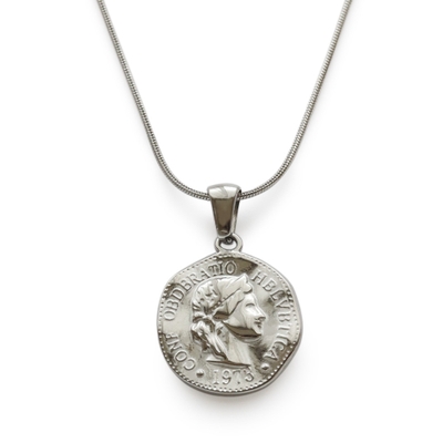 絶妙な歪みを効かせたコインモチーフに、さらっと着けやすいスネークチェーンを合わせたネックレスです。