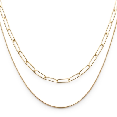 しなやかでシンプルな細めのスネークチェーンと、一つでも十分な存在感があるケーブルチェーンの2本セット。