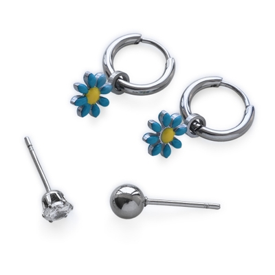 色んな組み合わせを楽しめる、一粒ストーン、メタルボール、フラワーピアスの3種セット。