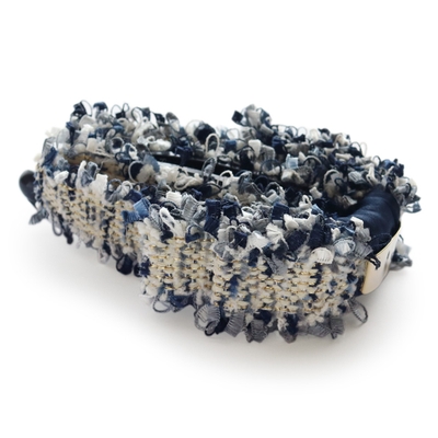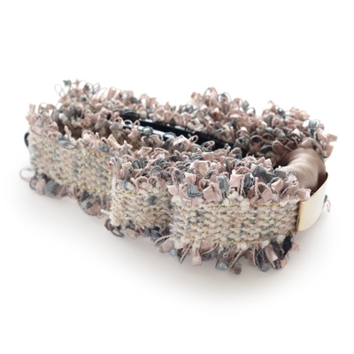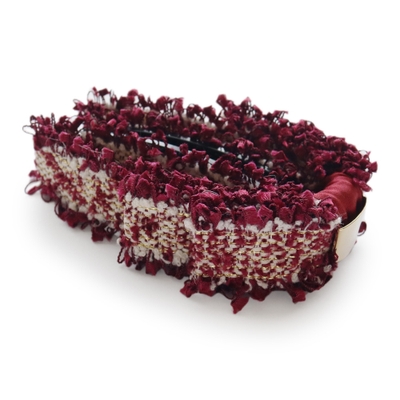ゴールドのラメ糸を織り込んだツイードと細かなフリルのような縁取り、そして後ろにはゴールドのプレートを合わせたとっても可愛いデザイン。