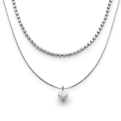 光の反射で煌めく2種類のチェーンが胸元に立体感を生み、上品な華やかさを演出します。