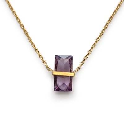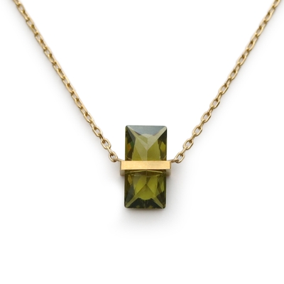 多面カットを施した煌めく縦長のキュービックジルコニアをスクエアプレートで挟み込んだスタイリッシュなモチーフ。