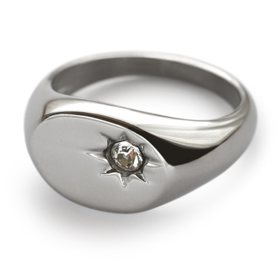 トップのフラットな面には星型の彫り加工を施し、中央には一粒のキュービックジルコニアがさりげなく輝きを放ちます。