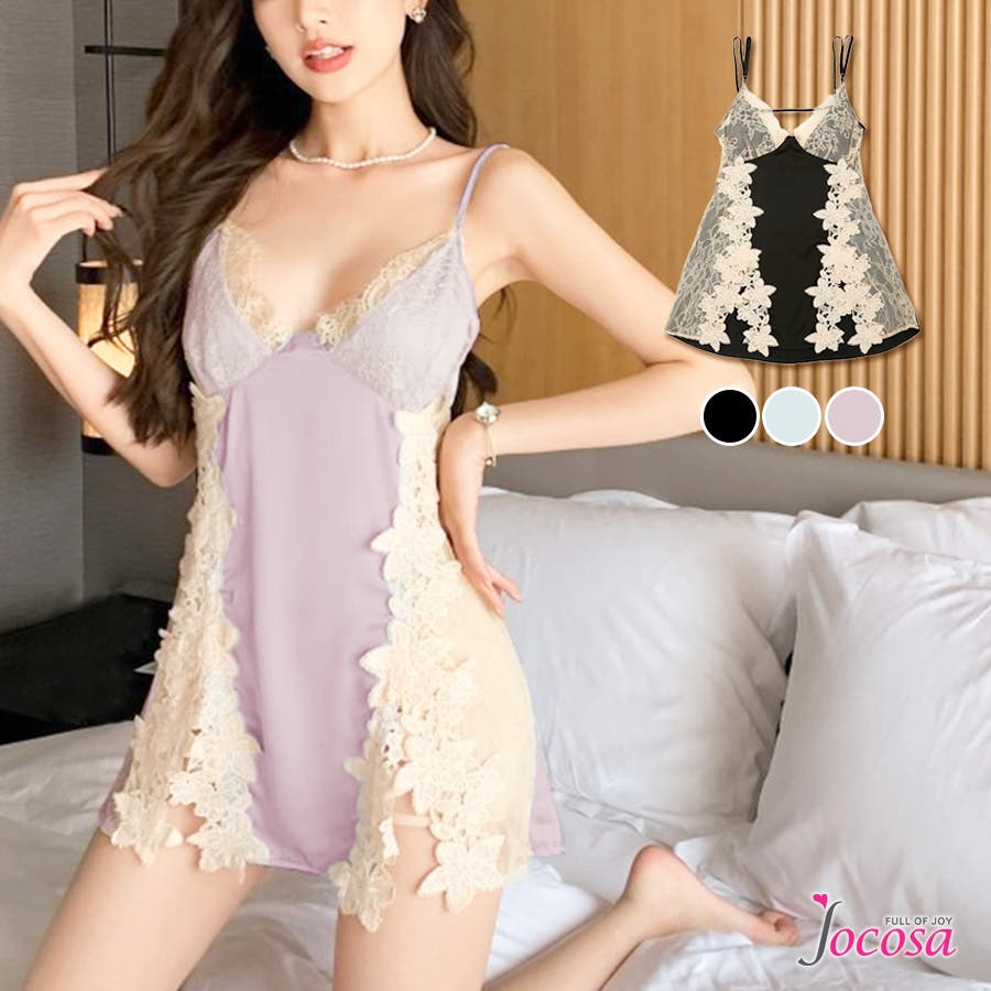 リラックスタイムが楽しみになるレースの透け感がセクシーなワンピースルームウェア。やさしい光沢感のあるなめらかな肌触りのサテン生地を使用。贅沢なレースデザインと透け感もあり、セクシーさを演出します。おうちでもおしゃれに過ごせるオススメのアイテム♪