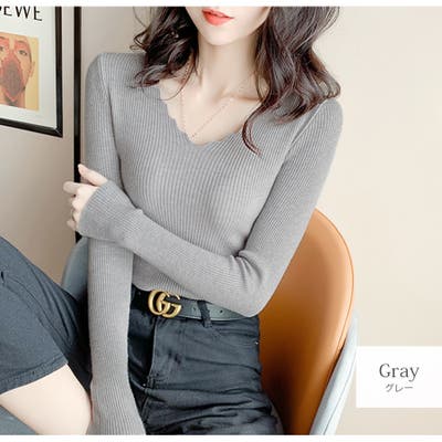 デコルテを綺麗にみせる波型Vネックの長袖ニット。伸縮性のあるリブニット素材で、伸縮性があるので着心地◎。シンプルデザインで、パンツにもスカートにも合わせやすいアイテム。