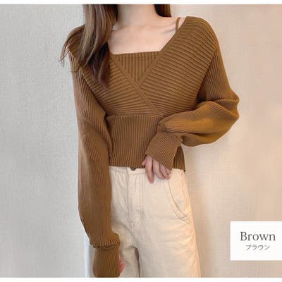 おしゃれ&セクシーなレイヤード風ニットトップス!これ1枚でおしゃれな着こなしに見せてくれます!伸縮性のある薄手のリブニット素材を使用。ざっくりあいたネック部分は肌みせしてセクシーな印象に!やや短めの丈感なので、ハイウエストのボトムスと相性抜群です◎
