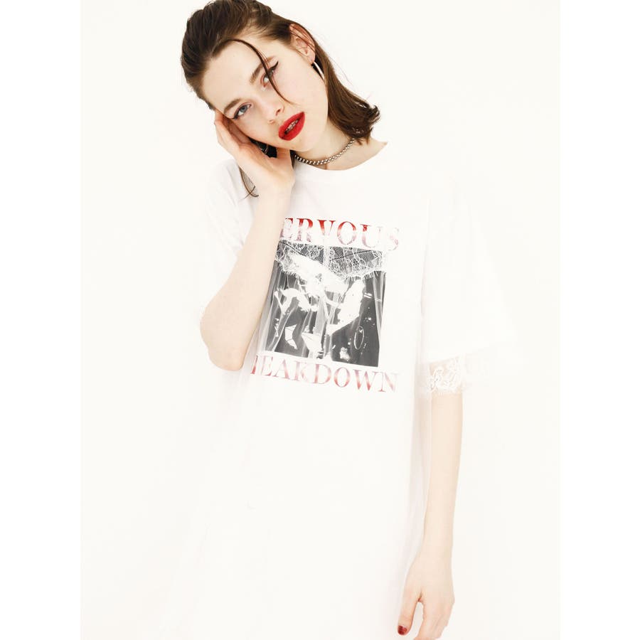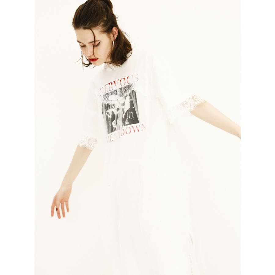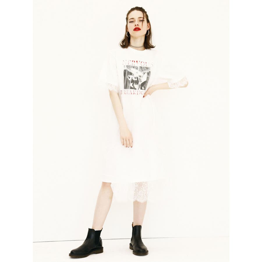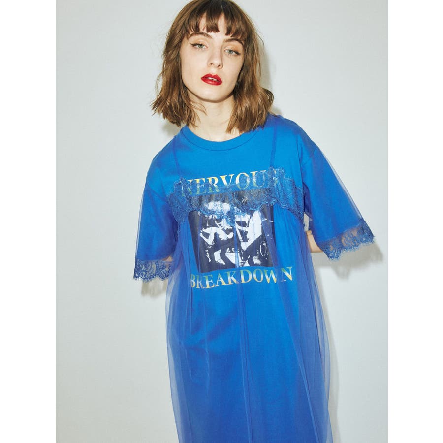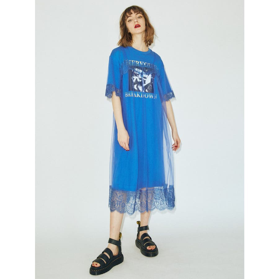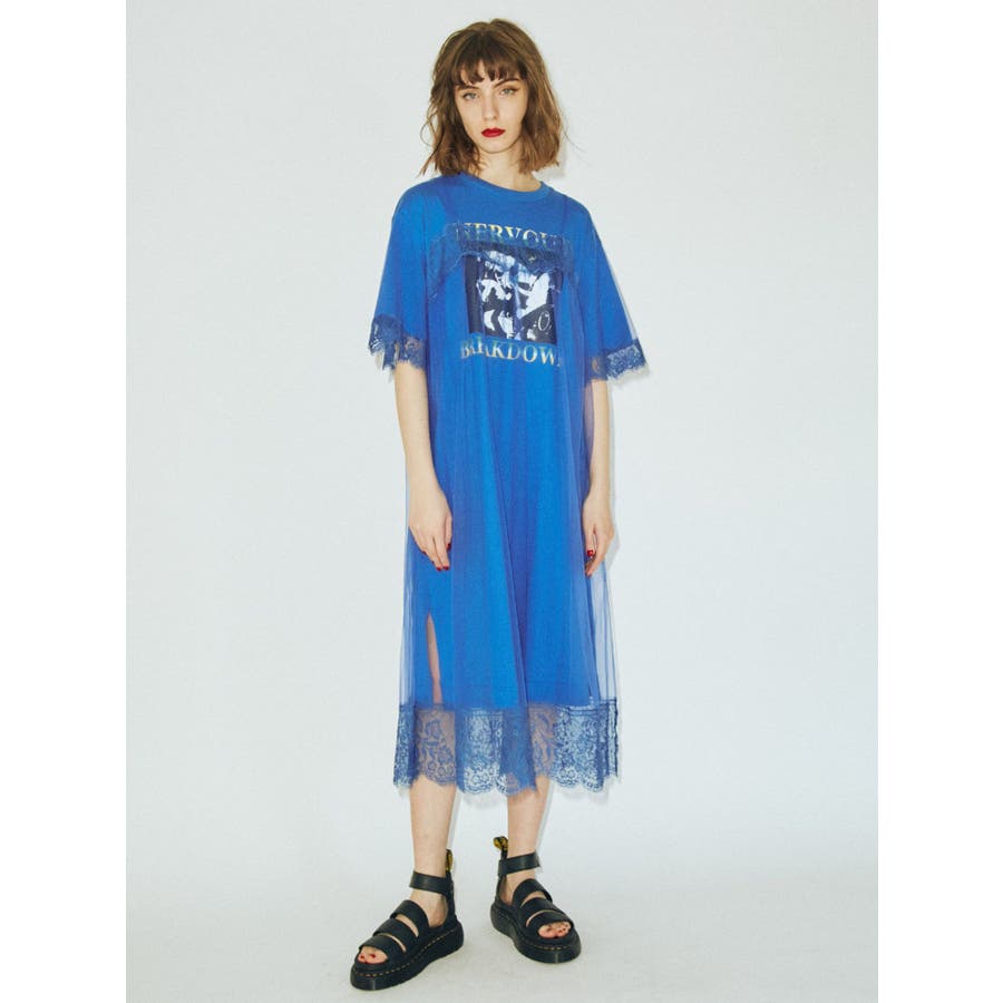 チュールとレースをドッキングしたリメイクワンピース。グランジテンションのグラフィックに甘めのチュールと、 レースレイヤード風の仕様で仕上げているのでMIXスタイルで楽しめる1枚。ベルトでウエストマークするスタイリングがおすすめ。