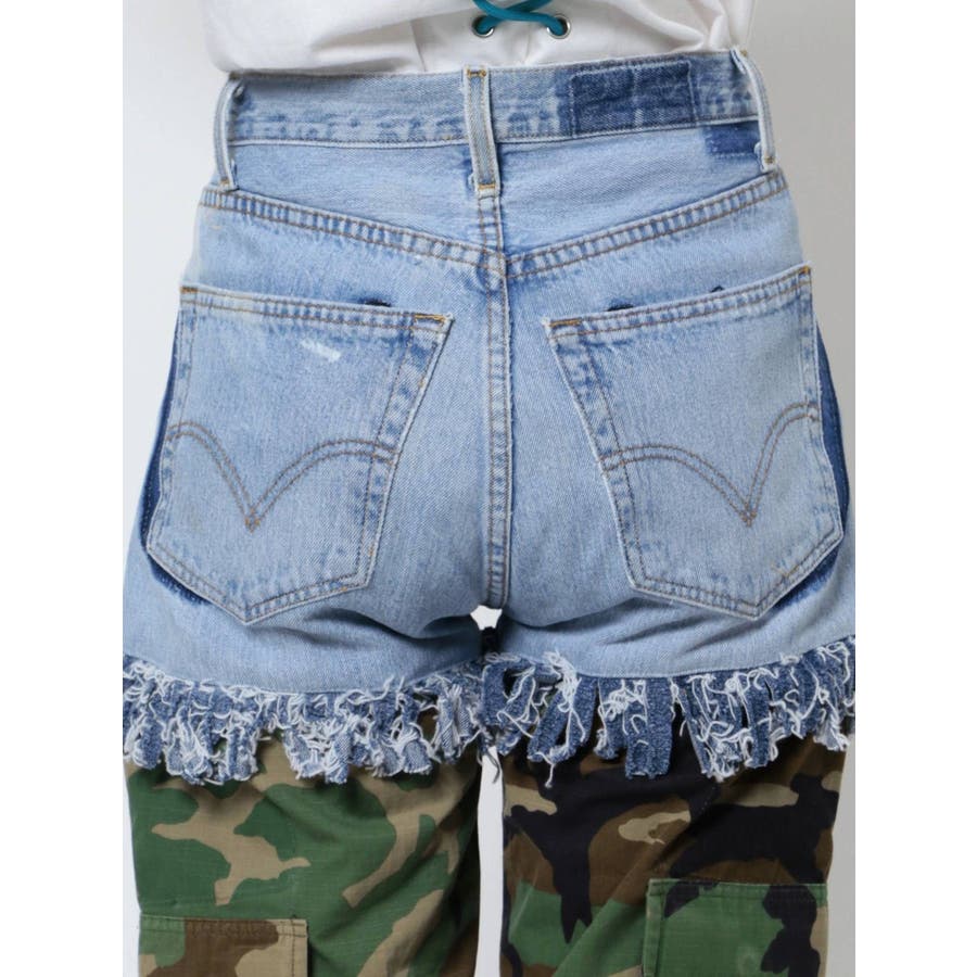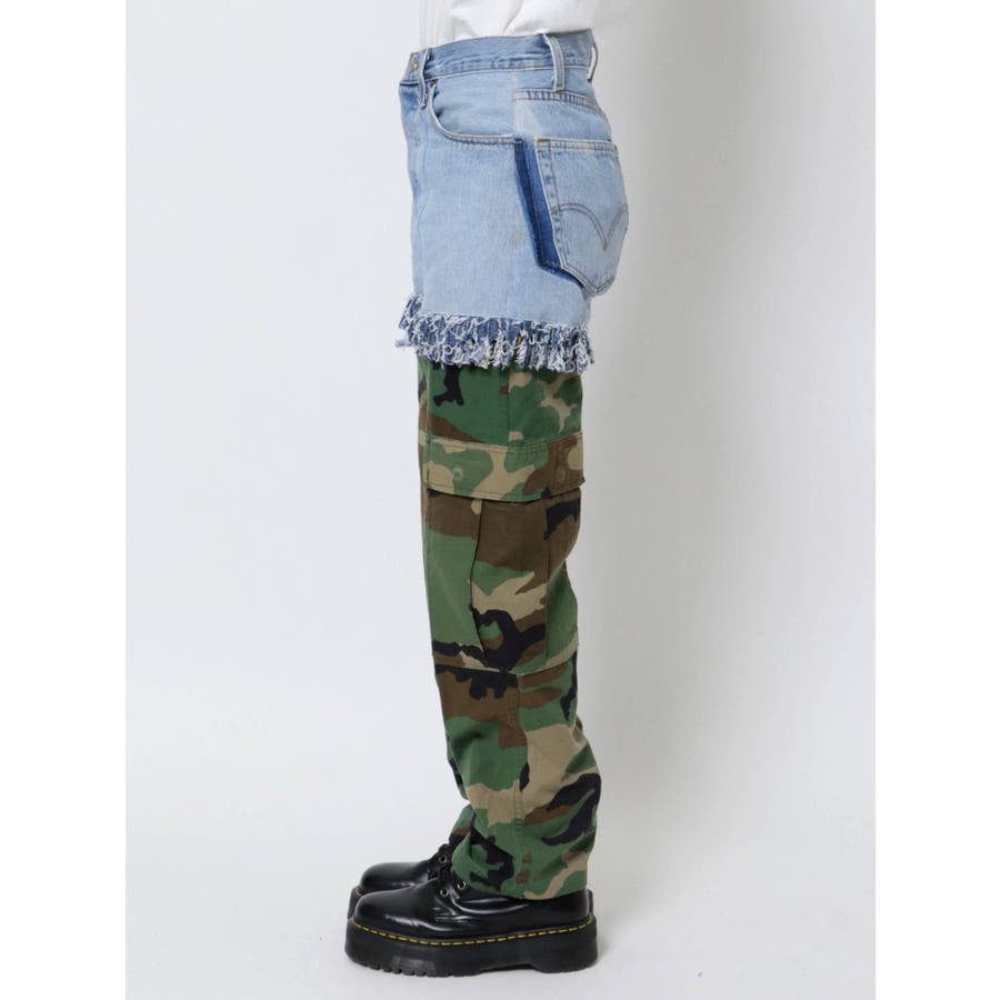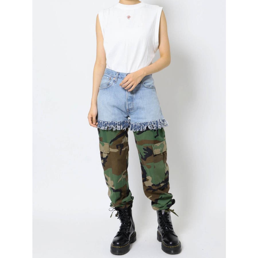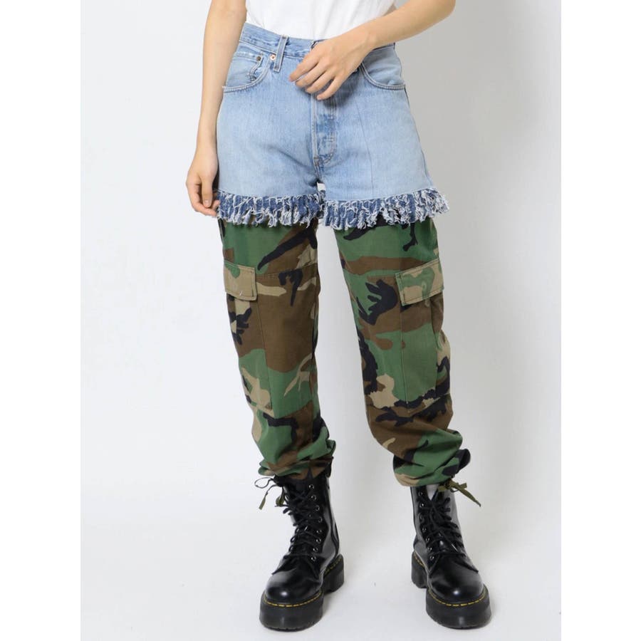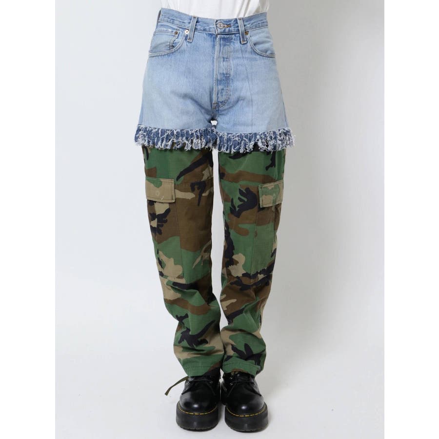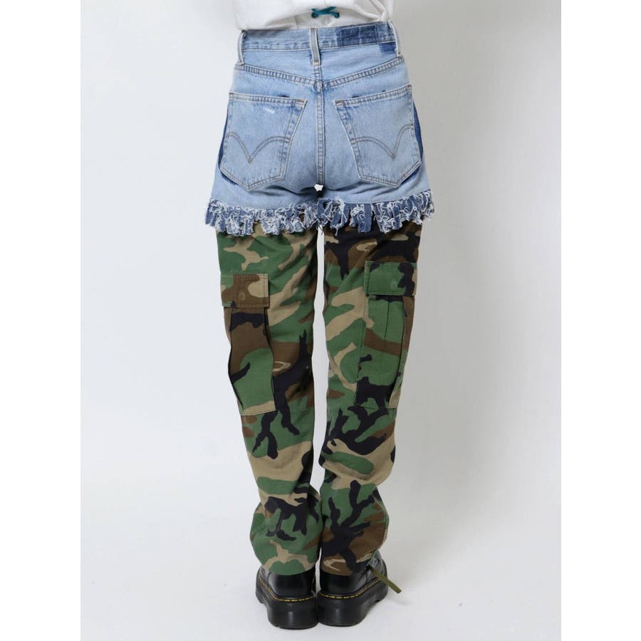 ポイント デニムパンツにカモフラミリタリーパンツをドッキングして、フリンジのディテールをプラスしたデザインがポイント。裾でストレートにしたりジョガーパンツシルエットにしたり、シルエット変化も楽しめるアイテム。 スタイリング パンツがデザインの凝った主役アイテムなので合わせるアイテムはシンプルでもスタイリングが完成するので、Tシャツやカットキャミなどのカジュアルな素材感のモノを合わせてストリートにまとめるスタイリングもオススメ。カラーがキャッチーなベーシックニットアイテムでもシンプルで可愛いスタイリングが楽しめます。