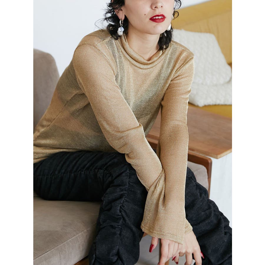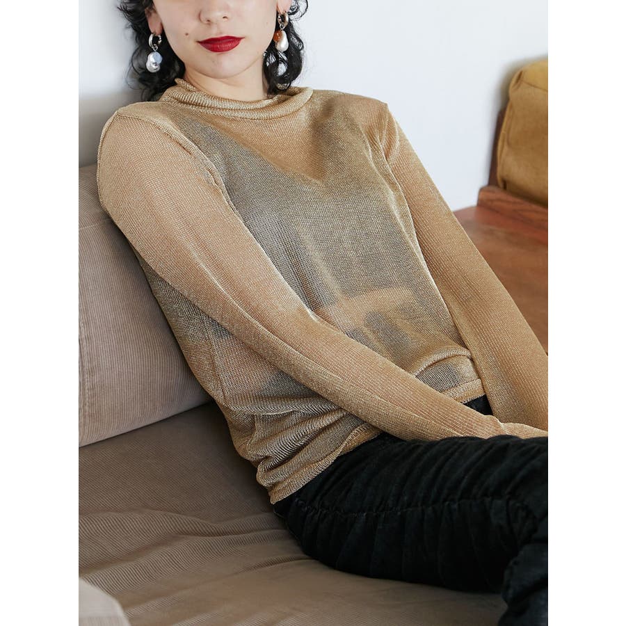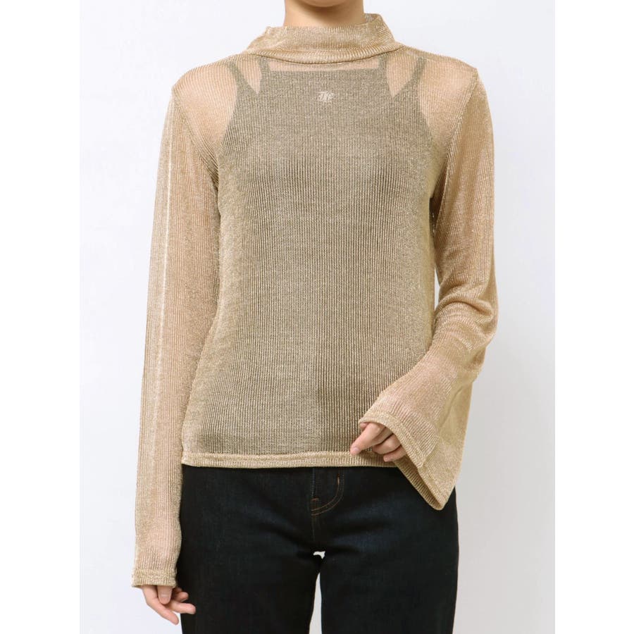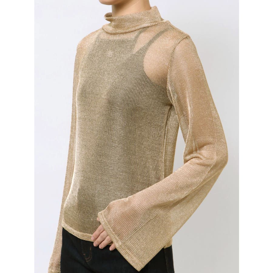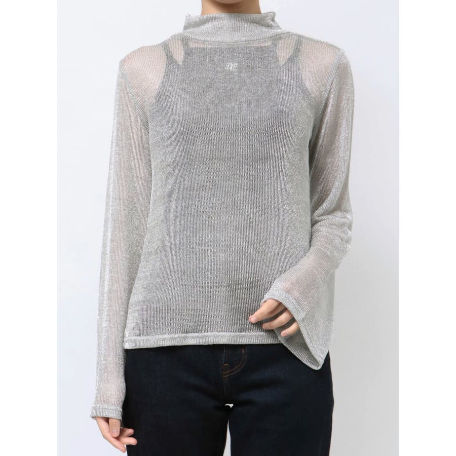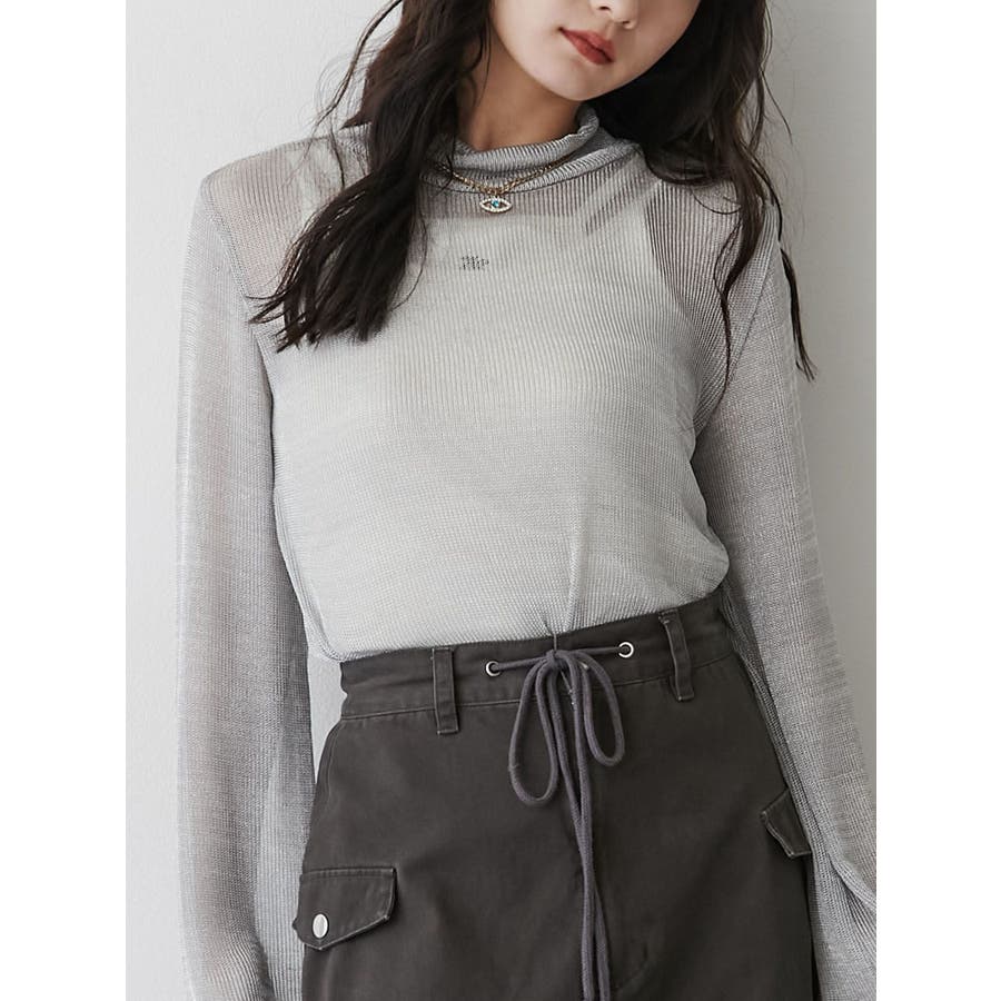 【ポイント】メタリックなメッシュ素材が他には無いシアートップス。体にフィットしすぎない程よいサイズ感とフレアスリーブデザインなのでトップスとしてもインナーとしても活躍するアイテムです。特に今季注目のシルバー、ゴールドは取り入れるだけでトレンド感MAXなコーディネートになります!【スタイリング】キャミワンピースやルーズTシャツとのレイヤードがおすすめです。キラキラとしたハイネックデザインが映えて今っぽくなります!※着用画像はフラッシュの加減で実際の製品と色味等が異なる場合がございますので、生地のズームアップ画像をご確認ください。※ご利用の端末画面の設定により実際の商品と色味が異なる場合がございます。※正しいサイズはアイテムサイズ表をご確認ください。※商品のお取り扱いについては、脇についている洗濯ネーム類をご確認下さい。【商品特徴】透け感:あり伸縮性:あり生地の厚さ:普通サイズ感:普通裏地:なしポケット:なし
