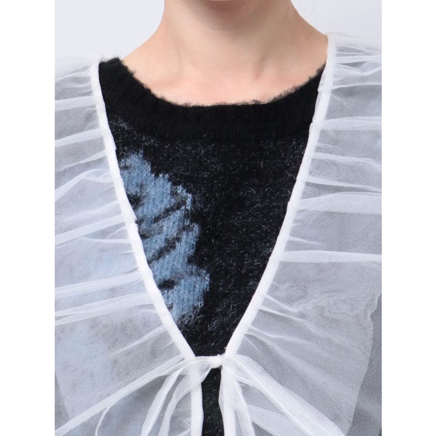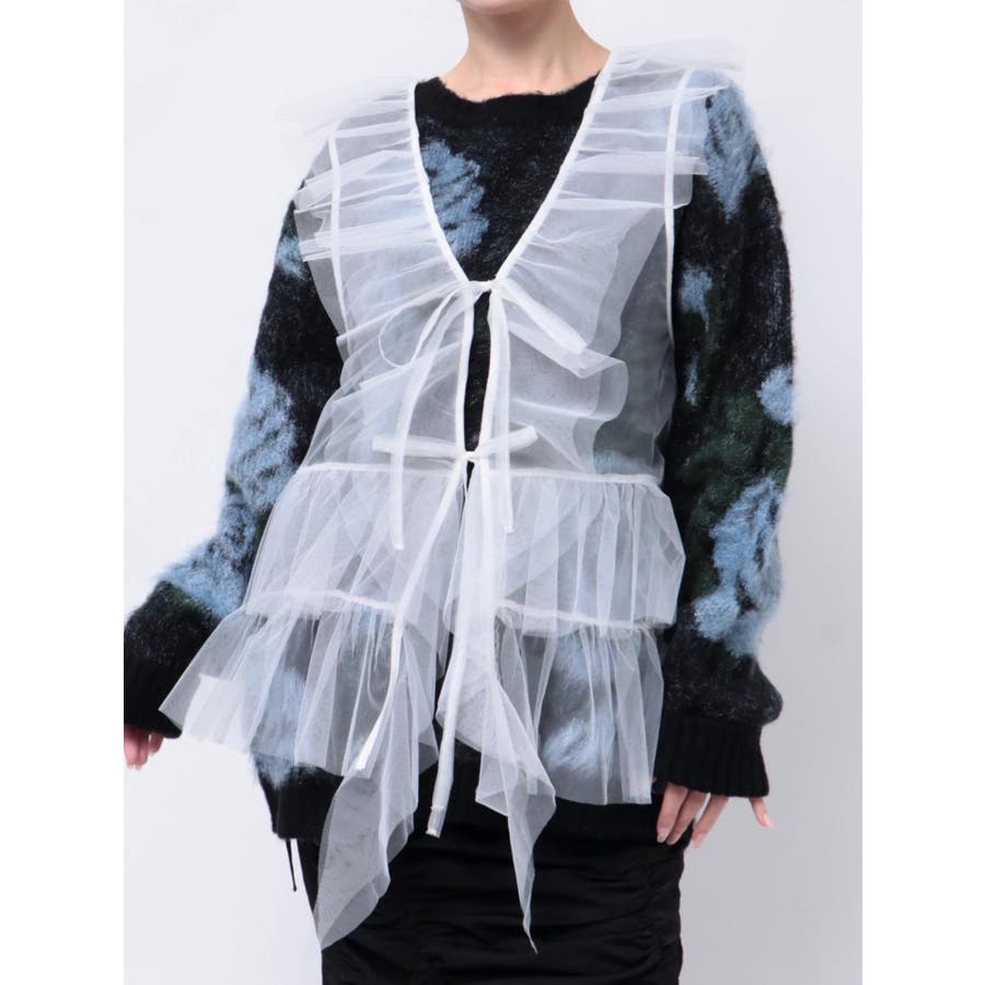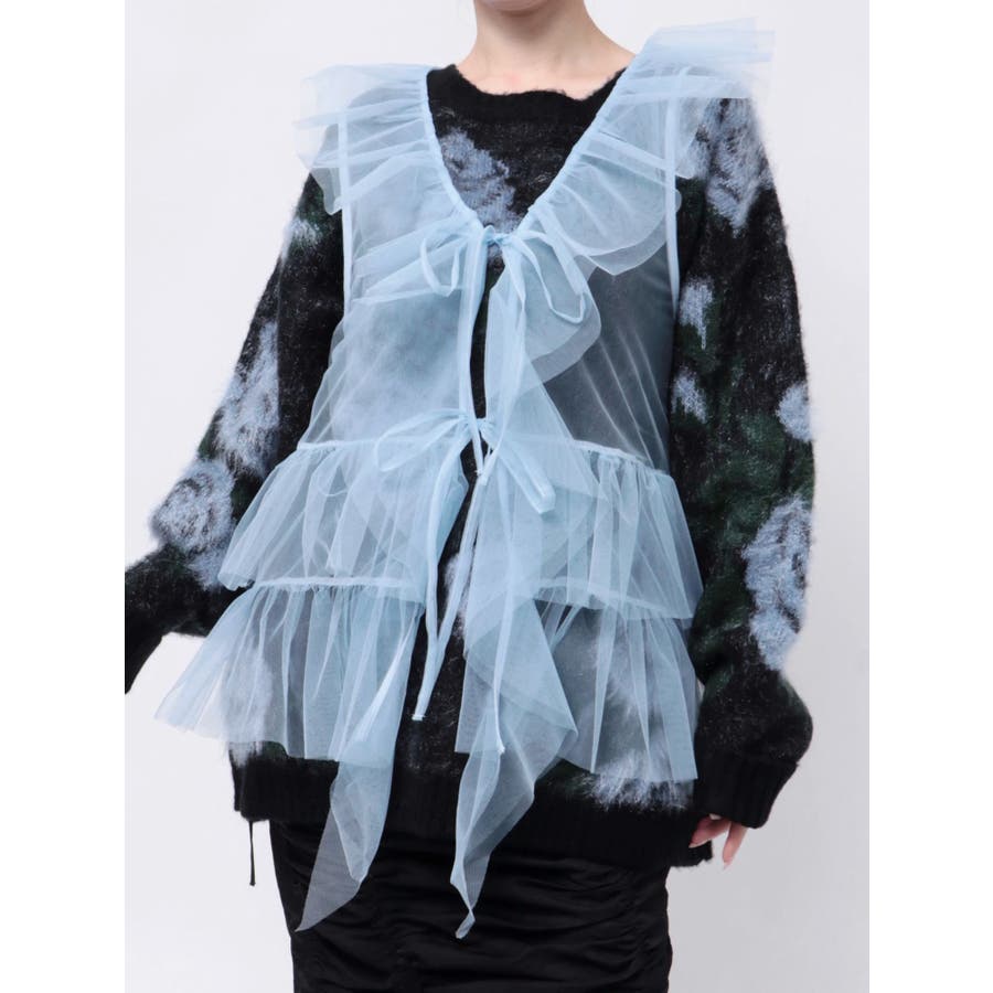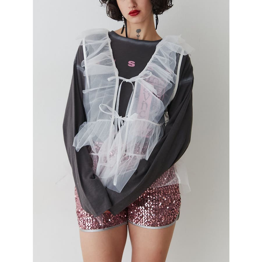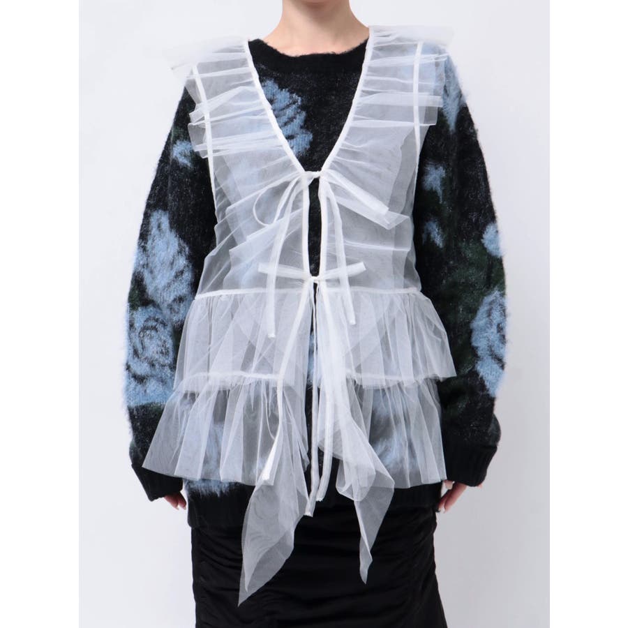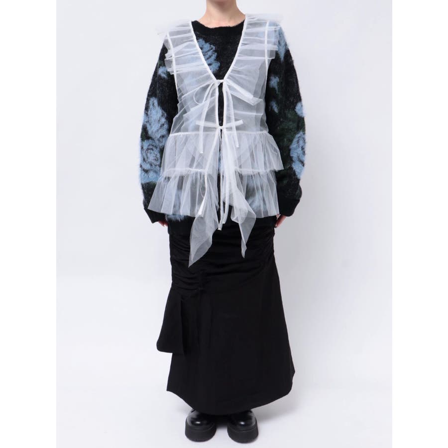 【ポイント】 ハリ感のあるチュール素材を使用し、ボリューム感のあるフォルムにこだわったベスト。 ドレープフリルとリボンでトレンド感がプラスされ、いつものコーディネートを華やかに見せてくれます。 【スタイリング】 ゆったりとした身幅で仕上げているので、秋冬のテーラードジャケットやルーズなサイジングのスウェット、 ニットプルオーバーなどにもレイヤード出来るのが他には無いおすすめポイント。 取り入れるだけでトレンドのバレエコアスタイルに!アウターや羽織の中からちらりとフリルを見せるのもおすすめで、どんなアイテムにも手軽に合わせられるオールシーズン大活躍の万能アイテムです! ※着丈、フリル襟が2cm長くなります。 ※着用画像はフラッシュの加減で実際の製品と色味等が異なる場合がございますので、生地のズームアップ画像をご確認ください。 ※ご利用の端末画面の設定により実際の商品と色味が異なる場合がございます。 ※正しいサイズはアイテムサイズ表をご確認ください。 ※商品のお取り扱いについては、脇についている洗濯ネーム類をご確認下さい。