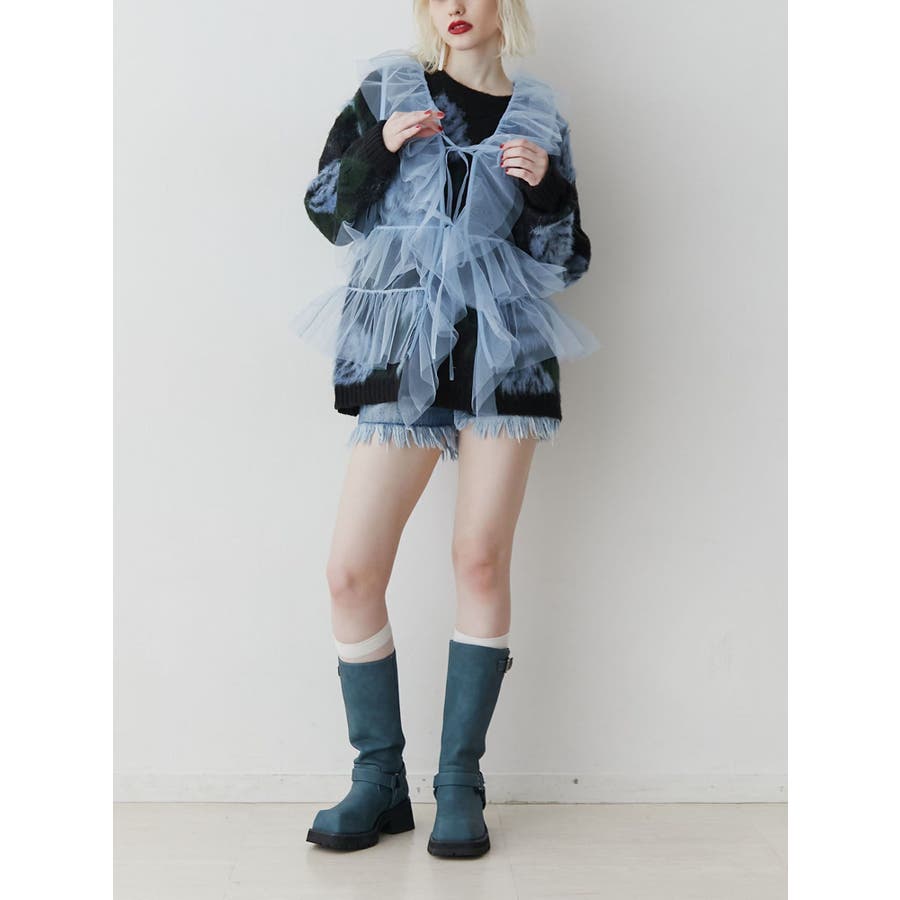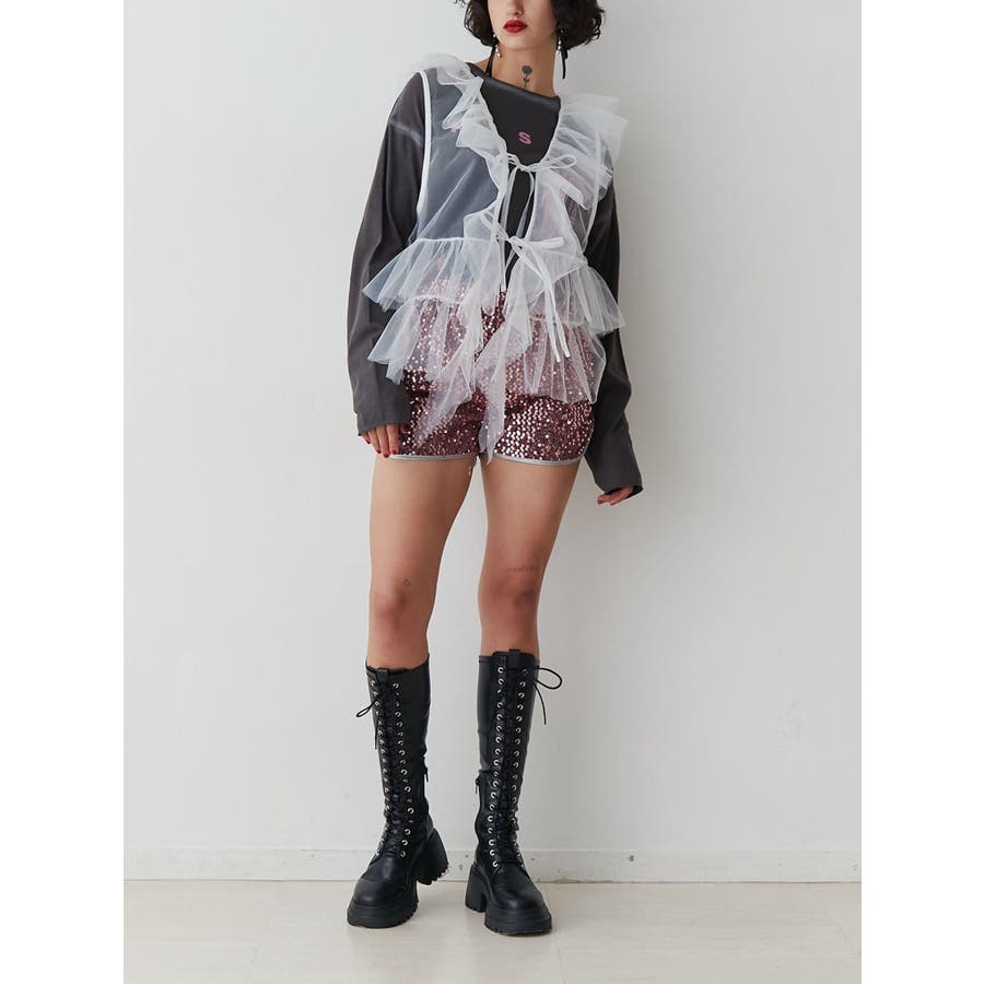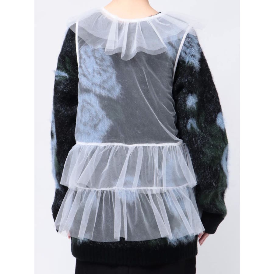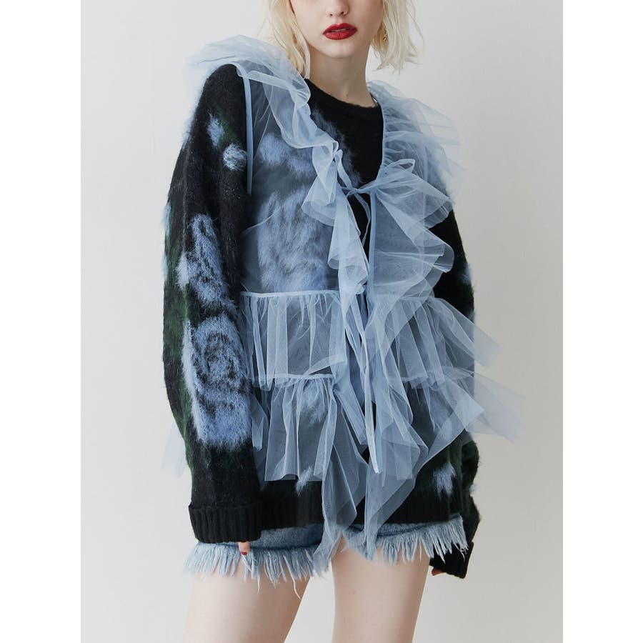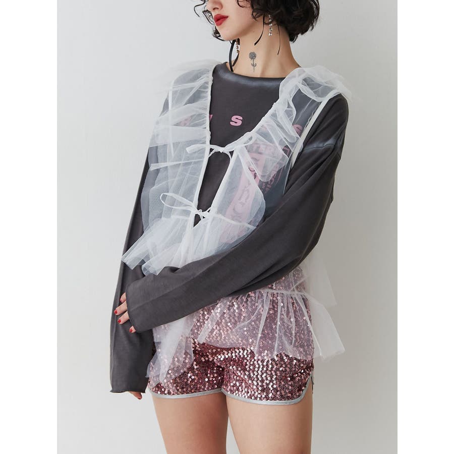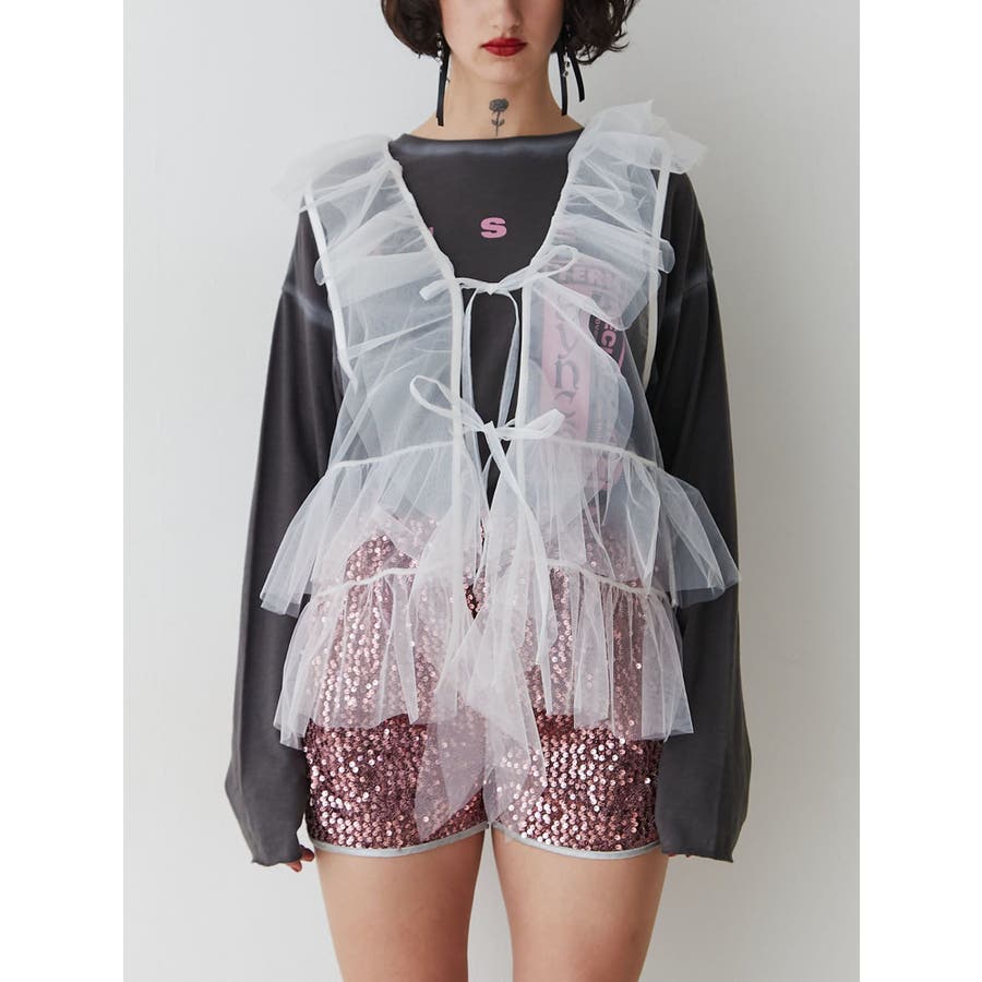 【ポイント】 ハリ感のあるチュール素材を使用し、ボリューム感のあるフォルムにこだわったベスト。 ドレープフリルとリボンでトレンド感がプラスされ、いつものコーディネートを華やかに見せてくれます。 【スタイリング】 ゆったりとした身幅で仕上げているので、秋冬のテーラードジャケットやルーズなサイジングのスウェット、 ニットプルオーバーなどにもレイヤード出来るのが他には無いおすすめポイント。 取り入れるだけでトレンドのバレエコアスタイルに!アウターや羽織の中からちらりとフリルを見せるのもおすすめで、どんなアイテムにも手軽に合わせられるオールシーズン大活躍の万能アイテムです! ※着丈、フリル襟が2cm長くなります。 ※着用画像はフラッシュの加減で実際の製品と色味等が異なる場合がございますので、生地のズームアップ画像をご確認ください。 ※ご利用の端末画面の設定により実際の商品と色味が異なる場合がございます。 ※正しいサイズはアイテムサイズ表をご確認ください。 ※商品のお取り扱いについては、脇についている洗濯ネーム類をご確認下さい。