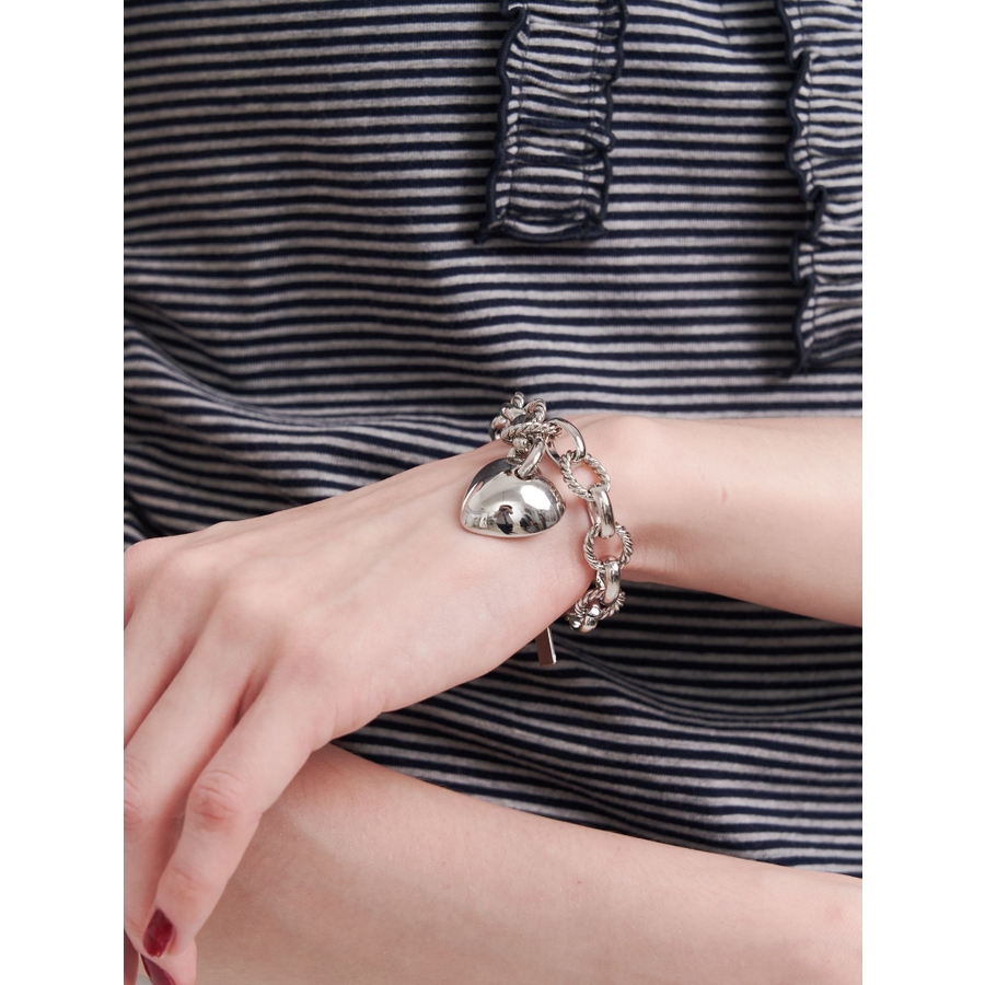 ハートモチーフがポイントのブレスレット。 ヴィンテージチェーン風のデザインがかわいいです! 手元が寂しくなりがちな夏のコーディネートのアクセントになります♪ ※着用画像はフラッシュの加減で実際の製品と色味等が異なる場合がございます。詳細画像をご参照ください。 ※ご利用の端末画面の設定により実際の商品と色味が異なる場合がございます。 ※正しいサイズはアイテムサイズ表をご確認ください。