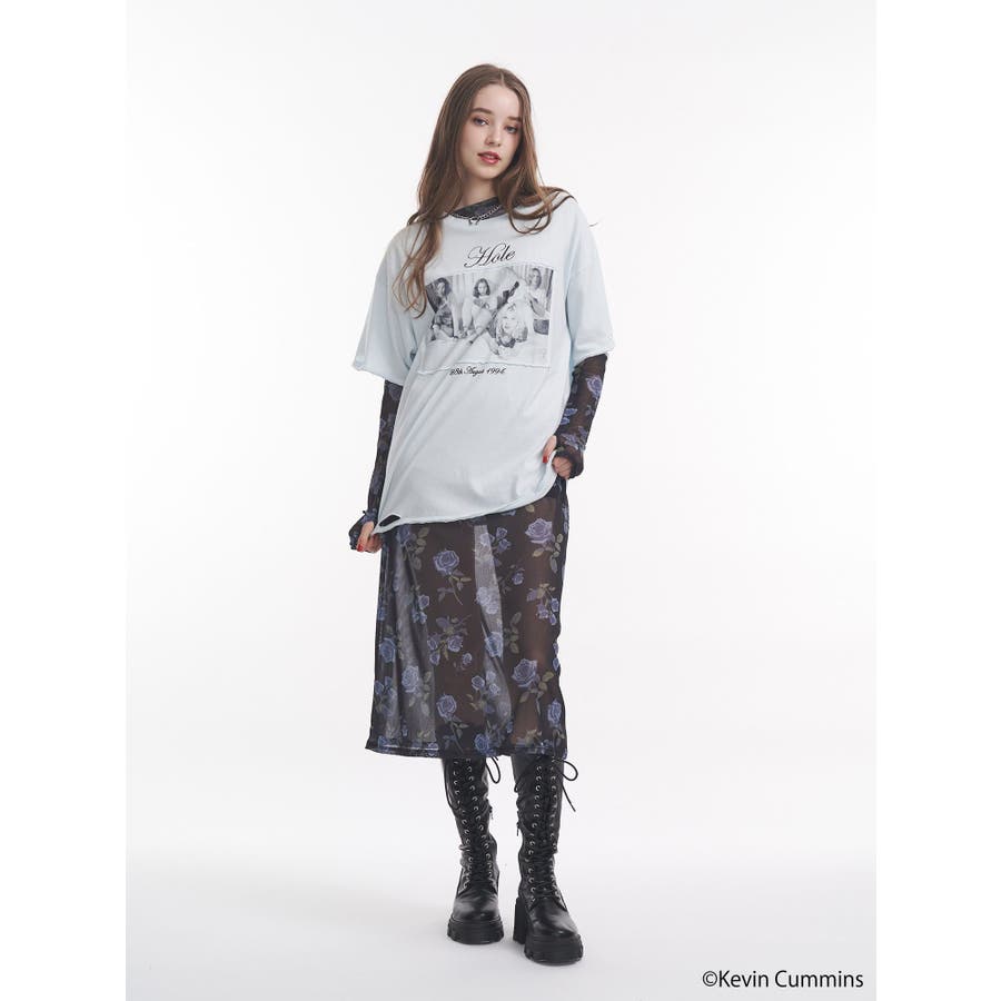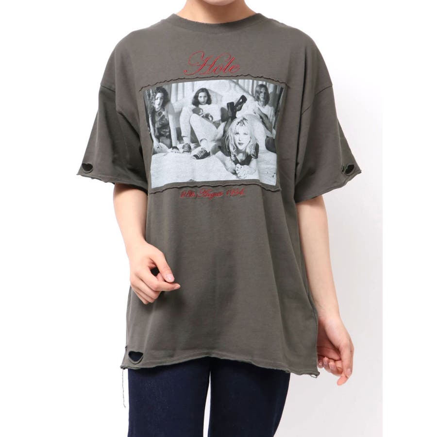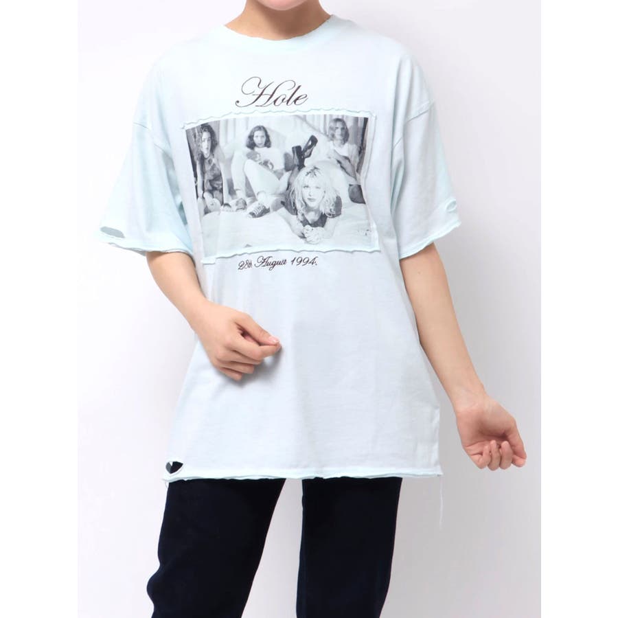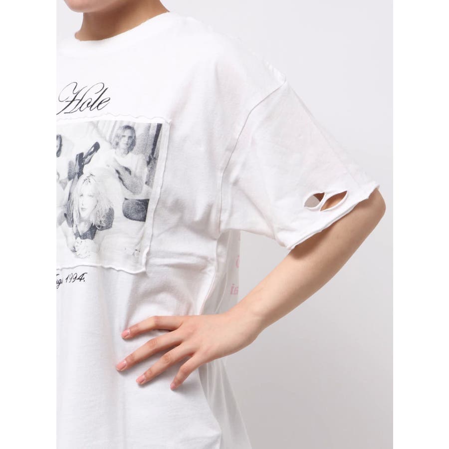 数多くのミュージシャンを撮りつづけた、音楽写真家Kevin Cummins(ケヴィン・カミンズ)とのコラボレーションアイテムが登場。1953年、マンチェスター生まれ。当時急成長をとげたマンチェスターのパンク・シーンに深くかかわりを持った伝説のフォトグラファー。""Joy Division""や""New Order""といった伝説のロック・アーティストのそのままの姿をリアルに撮り続け、その頃からドキュメンタリー・フォトグラファーとしての評価を得る。その後、UKのロック・ウィークリー紙『NME』にて10年間チーフ・フォトグラファーを務めた。【ポイント】フロントにはアメリカのロックグループ、HOLEをフォトプリント。叩き付けと刺繍ロゴで仕上げ、バックには26AWのjouetieのシーズンコンセプトの一部をロゴプリントで落とし込みました。BIGシルエットT×ダメージ加工でスタイリングが決まるjouetie(ジュエティ)定番のBIGTシャツです。ハイネックインナーやシアーアイテムとのレイヤードも映えます!【スタイリング】ルーズシルエットに仕上げたBIGTシャツは、ショートボトムを合わせたチュニック風スタイルが今っぽい!裾のダメージが抜け感と軽さを出してくれるのでバランスが良く、幅広いコーディネートをお楽しみいただけます。レースアイテムとの甘辛MIXなスタイリングが特におすすめです。※着用画像はフラッシュの加減で実際の製品と色味等が異なる場合がございますので、生地のズームアップ画像をご確認ください。※ご利用の端末画面の設定により実際の商品と色味が異なる場合がございます。※正しいサイズはアイテムサイズ表をご確認ください。※商品のお取り扱いについては、脇についている洗濯ネーム類をご確認下さい。【商品特徴】透け感:なし伸縮性:ややあり生地の厚さ:薄手サイズ感:ゆったり裏地:なしポケット:なし