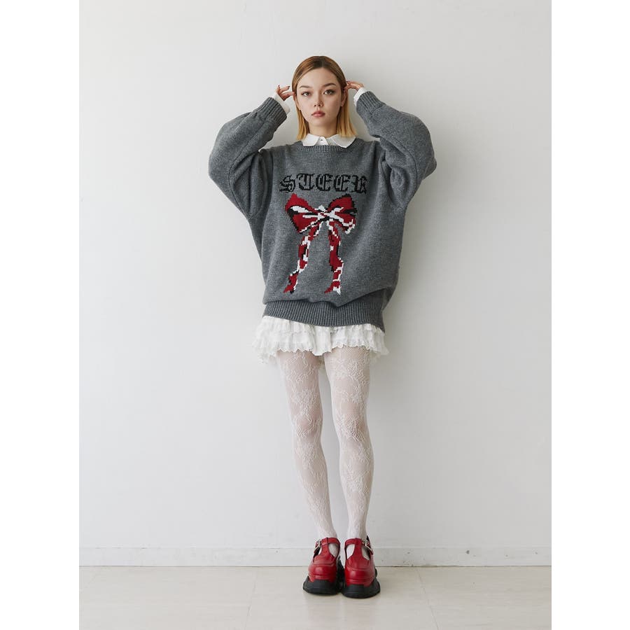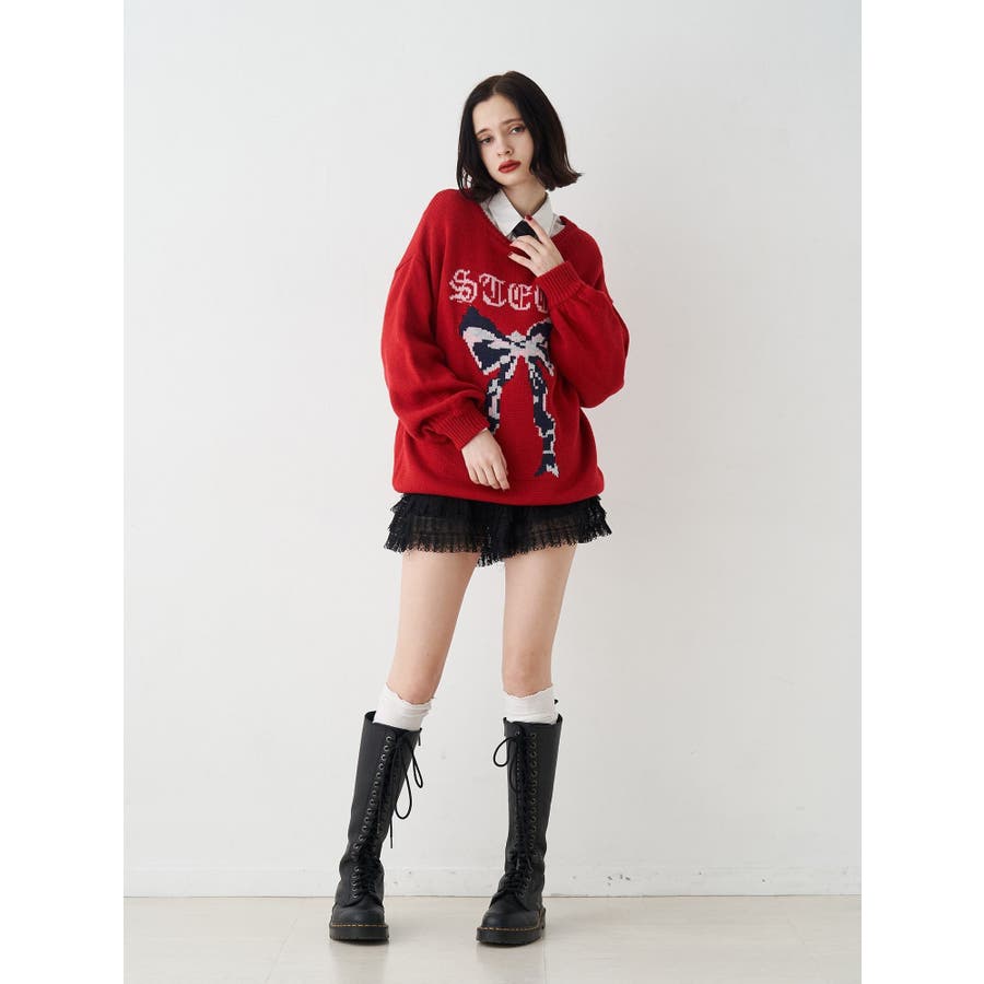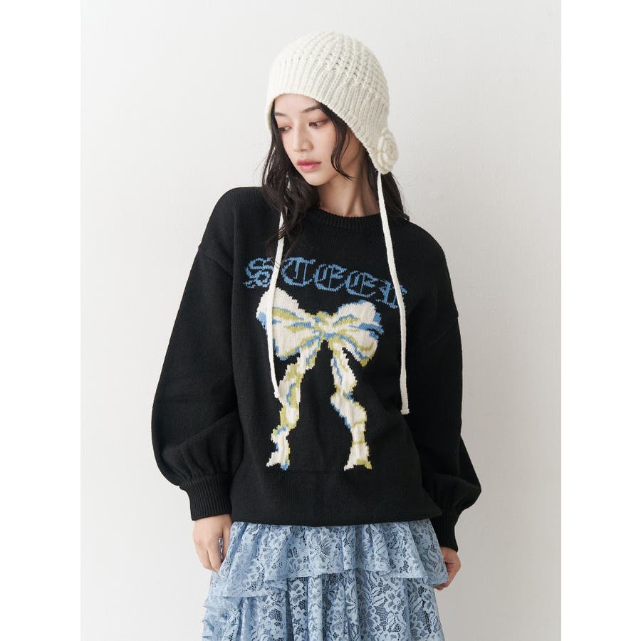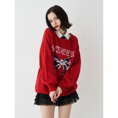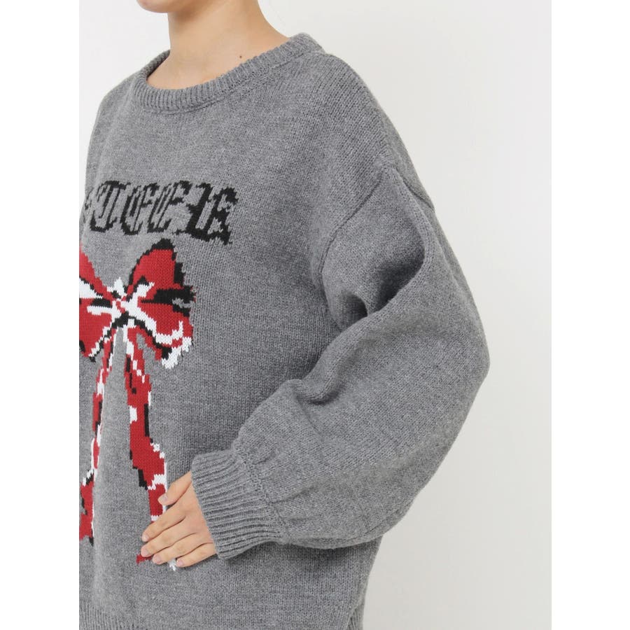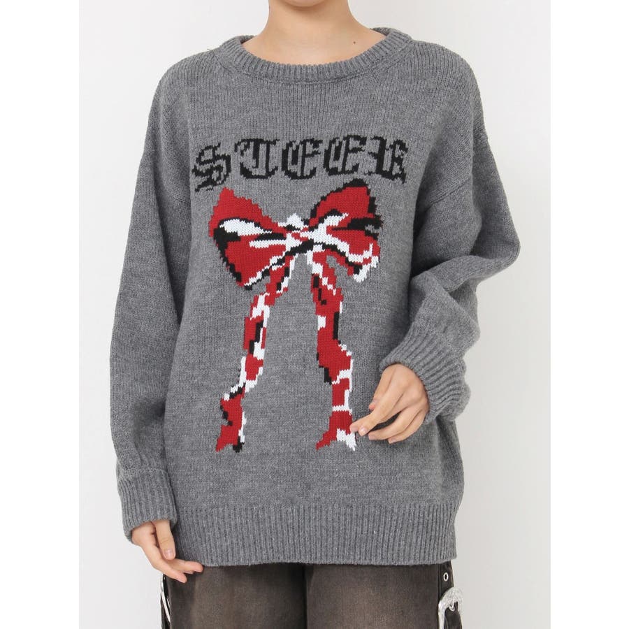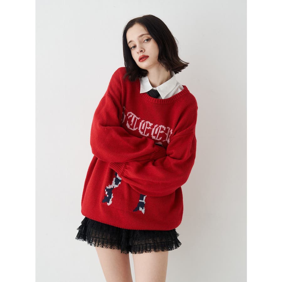 【ポイント】リボングラフィックが大胆に施されたされたジャガードルーズニット。甘めリボン×ストリートな印象のオールドイングリッシュロゴの組み合わせがjouetie(ジュエティ)らしい!この1枚で甘辛MIXスタイルが完成します!【スタイリング】おしりが隠れるゆったりとした丈感なので、ゆるっと1枚でチュニック風に着るのがかわいい!レースティアードショートパンツをちら見せすると甘辛MIXに決まるのでおすすめです♪足元はロングブーツを合わせると、トレンド感MAXなコーディネートが完成します。jouetieこだわりのサイズ感なのでタートルニットやシャツとのレイヤードもしやすいです。レースロングスカートをゆるっと合わせたり、ティアードミニスカートを裾からチラッと見せたり…甘めのスタイリングも今っぽくておすすめです。※編み地が変更になり、ジャガードグラフィックがより繊細に表現されます。※詳細画像が正しい仕様となります。※着用画像はフラッシュの加減で実際の製品と色味等が異なる場合がございますので、生地のズームアップ画像をご確認ください。※ご利用の端末画面の設定により実際の商品と色味が異なる場合がございます。※正しいサイズはアイテムサイズ表をご確認ください。※商品のお取り扱いについては、脇についている洗濯ネーム類をご確認下さい。【商品特徴】透け感:なし伸縮性:あり生地の厚さ:普通サイズ感:ゆったり裏地:なしポケット:なし