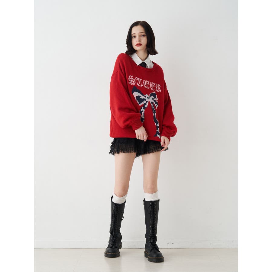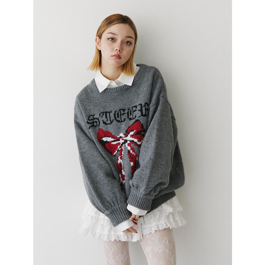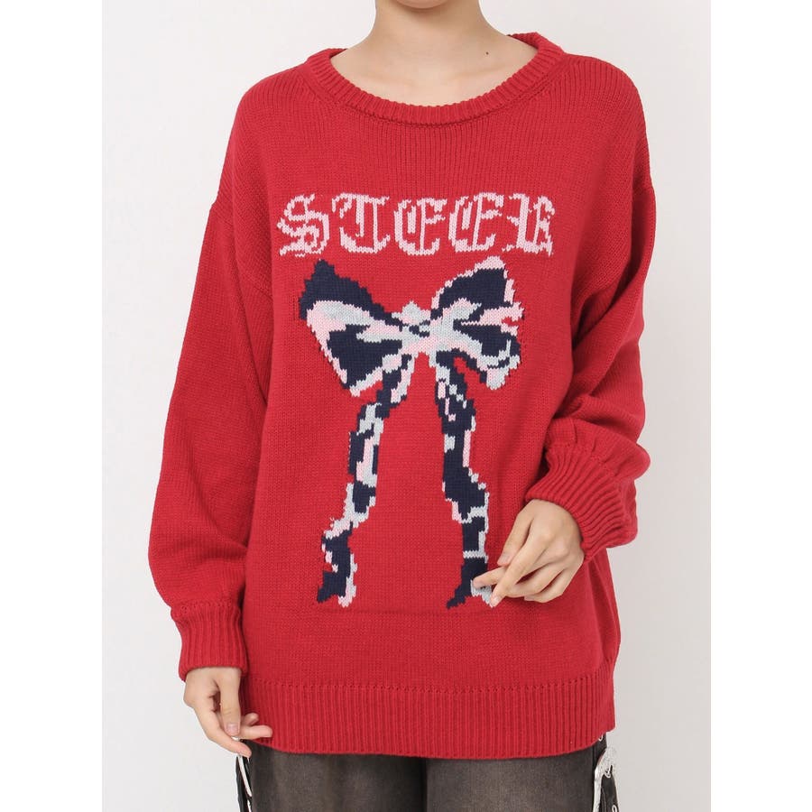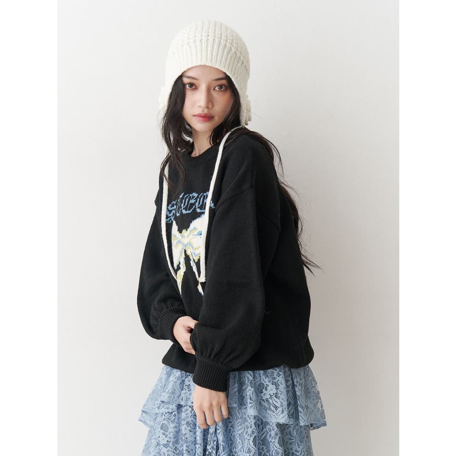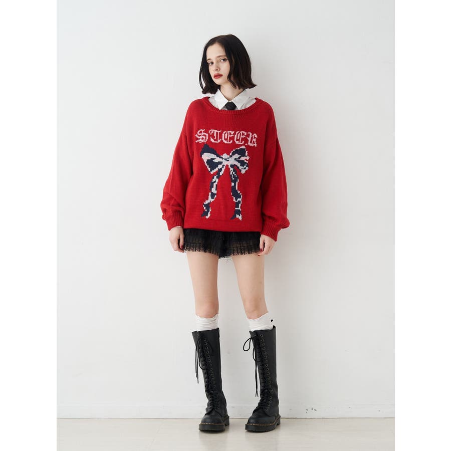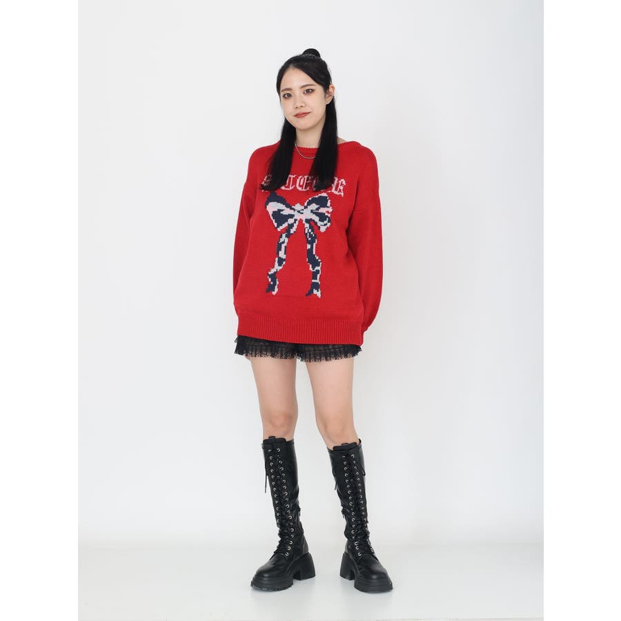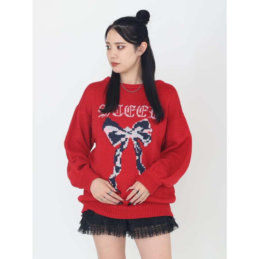【ポイント】リボングラフィックが大胆に施されたされたジャガードルーズニット。甘めリボン×ストリートな印象のオールドイングリッシュロゴの組み合わせがjouetie(ジュエティ)らしい!この1枚で甘辛MIXスタイルが完成します!【スタイリング】おしりが隠れるゆったりとした丈感なので、ゆるっと1枚でチュニック風に着るのがかわいい!レースティアードショートパンツをちら見せすると甘辛MIXに決まるのでおすすめです♪足元はロングブーツを合わせると、トレンド感MAXなコーディネートが完成します。jouetieこだわりのサイズ感なのでタートルニットやシャツとのレイヤードもしやすいです。レースロングスカートをゆるっと合わせたり、ティアードミニスカートを裾からチラッと見せたり…甘めのスタイリングも今っぽくておすすめです。※編み地が変更になり、ジャガードグラフィックがより繊細に表現されます。※詳細画像が正しい仕様となります。※着用画像はフラッシュの加減で実際の製品と色味等が異なる場合がございますので、生地のズームアップ画像をご確認ください。※ご利用の端末画面の設定により実際の商品と色味が異なる場合がございます。※正しいサイズはアイテムサイズ表をご確認ください。※商品のお取り扱いについては、脇についている洗濯ネーム類をご確認下さい。【商品特徴】透け感:なし伸縮性:あり生地の厚さ:普通サイズ感:ゆったり裏地:なしポケット:なし