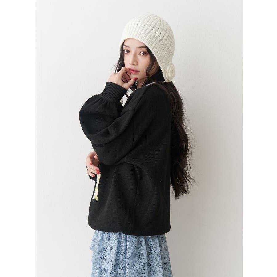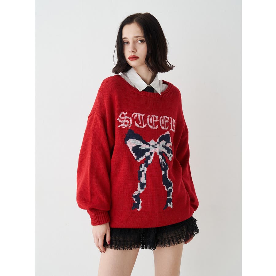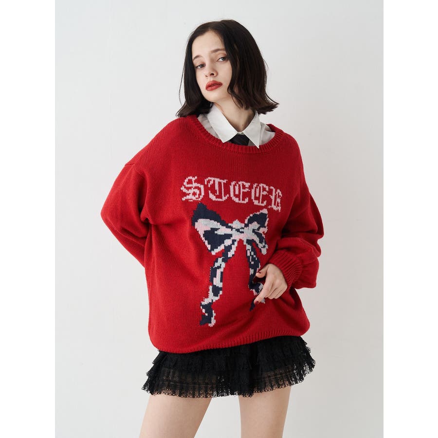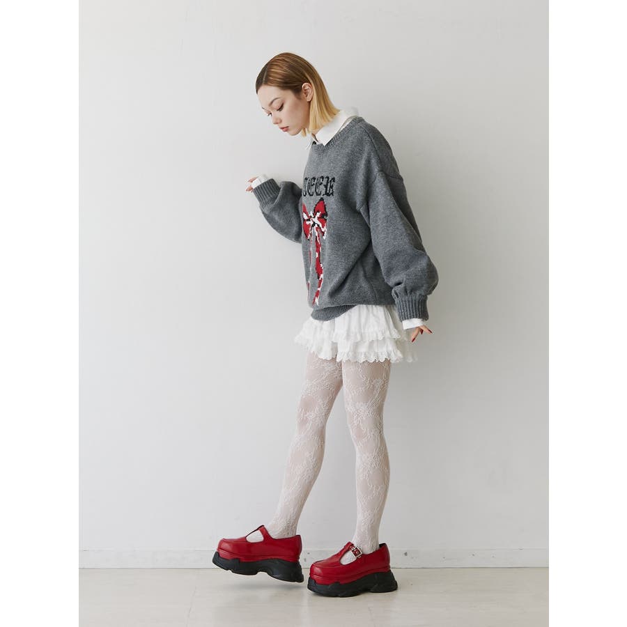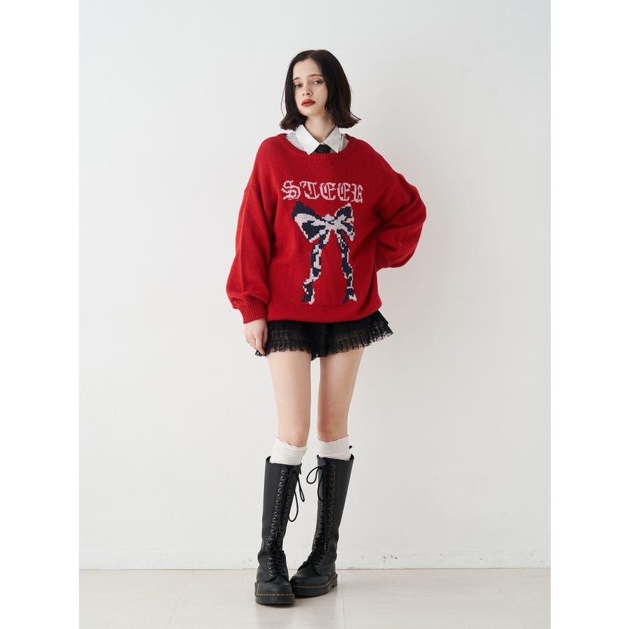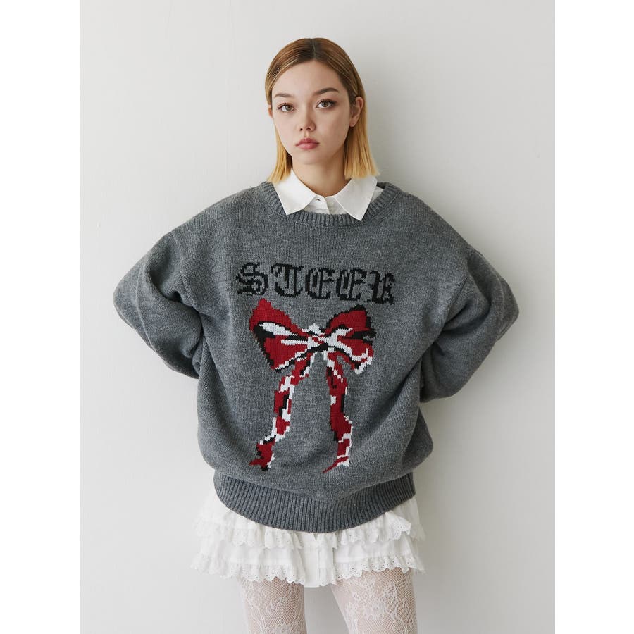 【ポイント】リボングラフィックが大胆に施されたされたジャガードルーズニット。甘めリボン×ストリートな印象のオールドイングリッシュロゴの組み合わせがjouetie(ジュエティ)らしい!この1枚で甘辛MIXスタイルが完成します!【スタイリング】おしりが隠れるゆったりとした丈感なので、ゆるっと1枚でチュニック風に着るのがかわいい!レースティアードショートパンツをちら見せすると甘辛MIXに決まるのでおすすめです♪足元はロングブーツを合わせると、トレンド感MAXなコーディネートが完成します。jouetieこだわりのサイズ感なのでタートルニットやシャツとのレイヤードもしやすいです。レースロングスカートをゆるっと合わせたり、ティアードミニスカートを裾からチラッと見せたり…甘めのスタイリングも今っぽくておすすめです。※編み地が変更になり、ジャガードグラフィックがより繊細に表現されます。※詳細画像が正しい仕様となります。※着用画像はフラッシュの加減で実際の製品と色味等が異なる場合がございますので、生地のズームアップ画像をご確認ください。※ご利用の端末画面の設定により実際の商品と色味が異なる場合がございます。※正しいサイズはアイテムサイズ表をご確認ください。※商品のお取り扱いについては、脇についている洗濯ネーム類をご確認下さい。【商品特徴】透け感:なし伸縮性:あり生地の厚さ:普通サイズ感:ゆったり裏地:なしポケット:なし