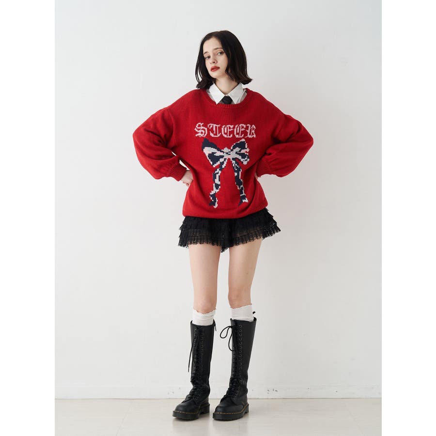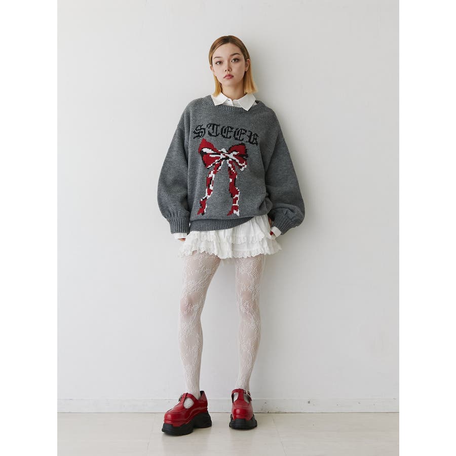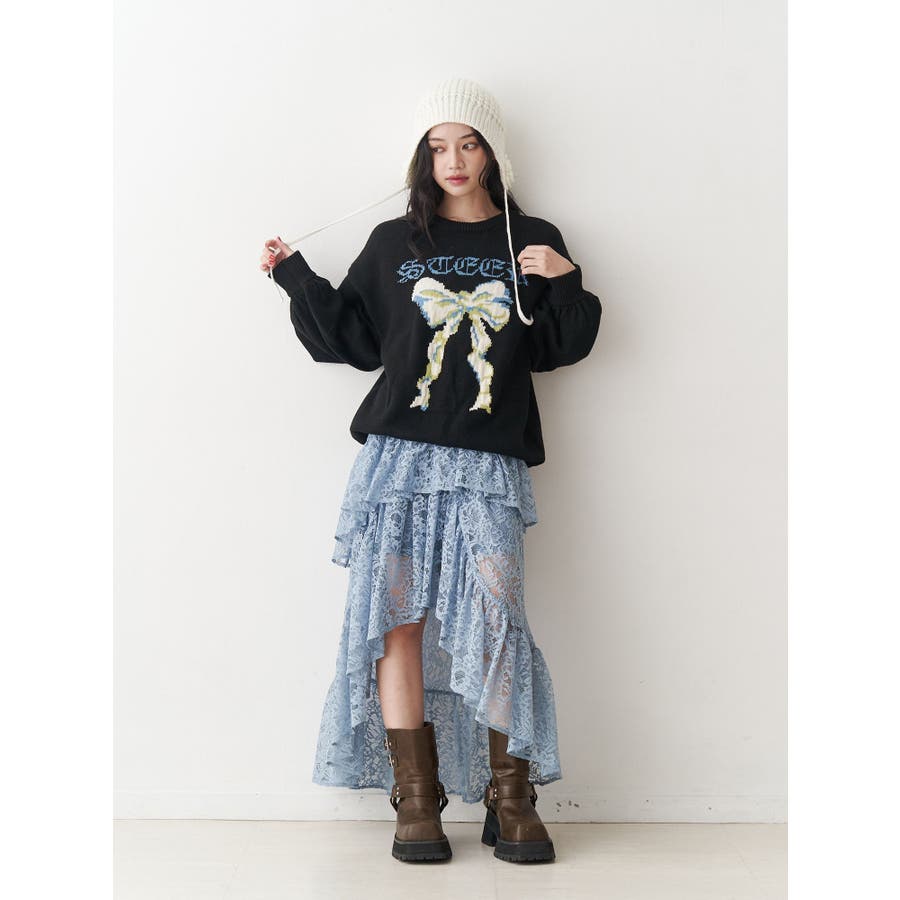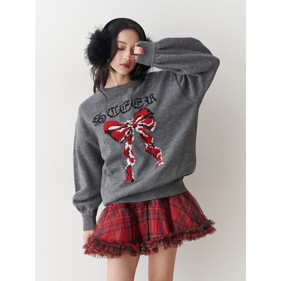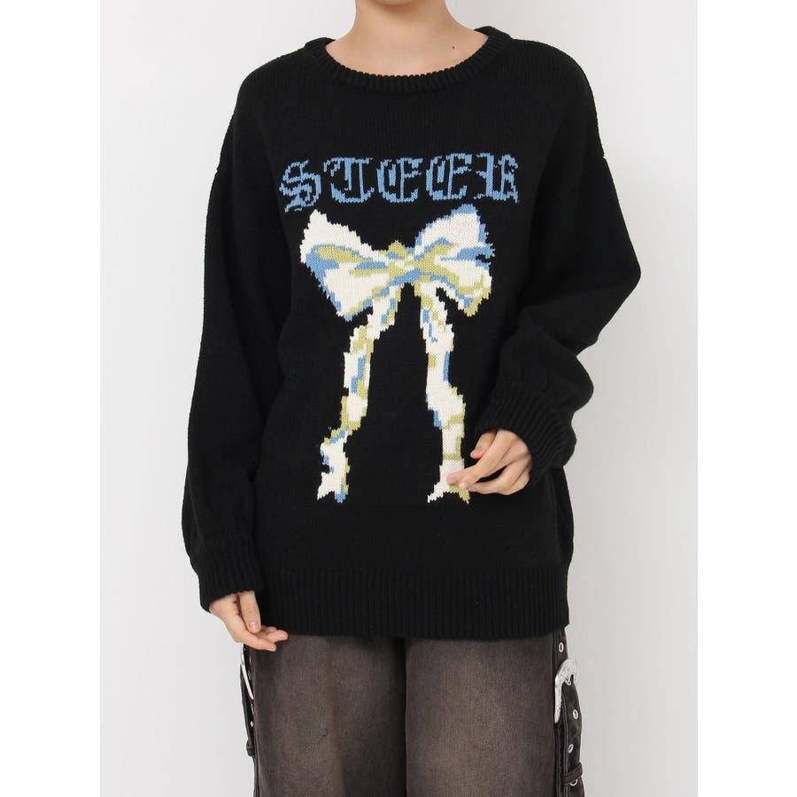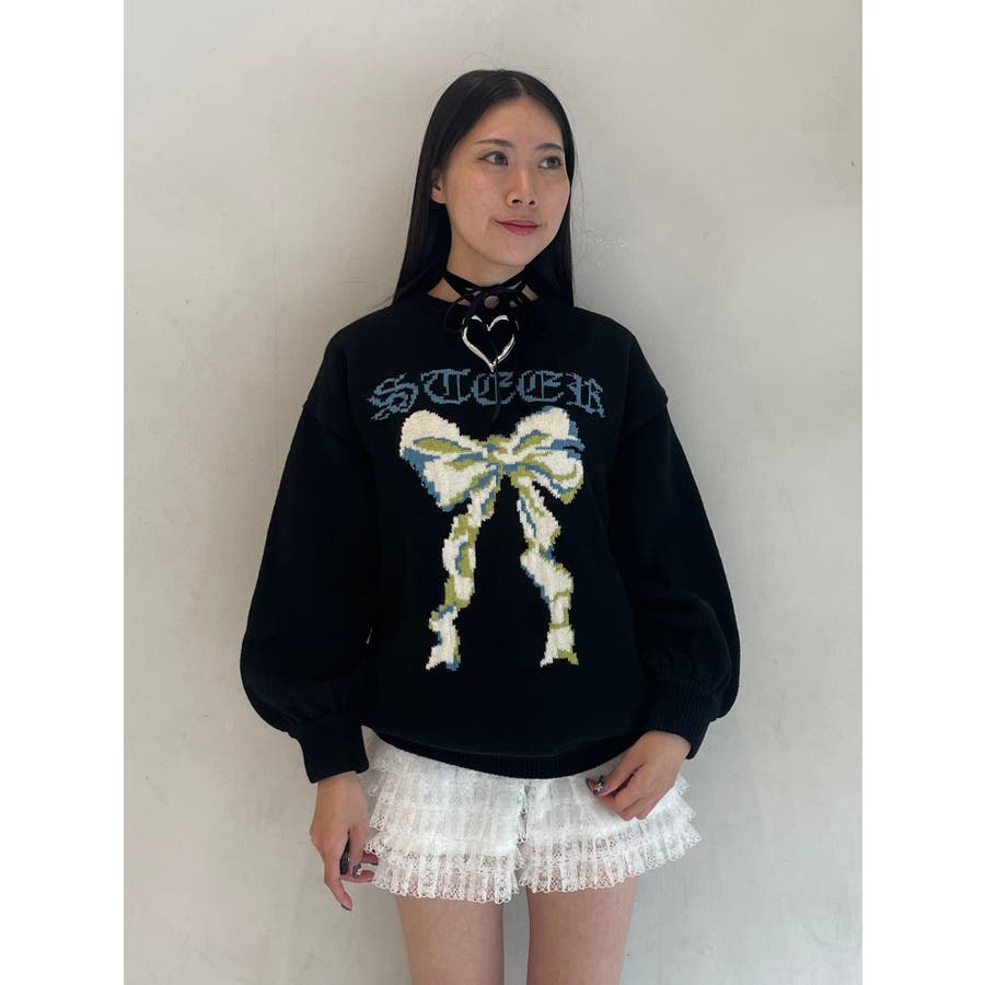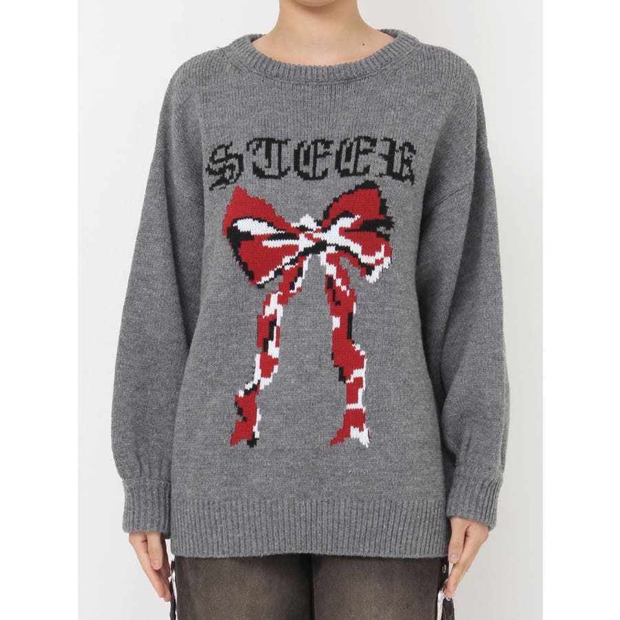 【ポイント】リボングラフィックが大胆に施されたされたジャガードルーズニット。甘めリボン×ストリートな印象のオールドイングリッシュロゴの組み合わせがjouetie(ジュエティ)らしい!この1枚で甘辛MIXスタイルが完成します!【スタイリング】おしりが隠れるゆったりとした丈感なので、ゆるっと1枚でチュニック風に着るのがかわいい!レースティアードショートパンツをちら見せすると甘辛MIXに決まるのでおすすめです♪足元はロングブーツを合わせると、トレンド感MAXなコーディネートが完成します。jouetieこだわりのサイズ感なのでタートルニットやシャツとのレイヤードもしやすいです。レースロングスカートをゆるっと合わせたり、ティアードミニスカートを裾からチラッと見せたり…甘めのスタイリングも今っぽくておすすめです。※編み地が変更になり、ジャガードグラフィックがより繊細に表現されます。※詳細画像が正しい仕様となります。※着用画像はフラッシュの加減で実際の製品と色味等が異なる場合がございますので、生地のズームアップ画像をご確認ください。※ご利用の端末画面の設定により実際の商品と色味が異なる場合がございます。※正しいサイズはアイテムサイズ表をご確認ください。※商品のお取り扱いについては、脇についている洗濯ネーム類をご確認下さい。【商品特徴】透け感:なし伸縮性:あり生地の厚さ:普通サイズ感:ゆったり裏地:なしポケット:なし