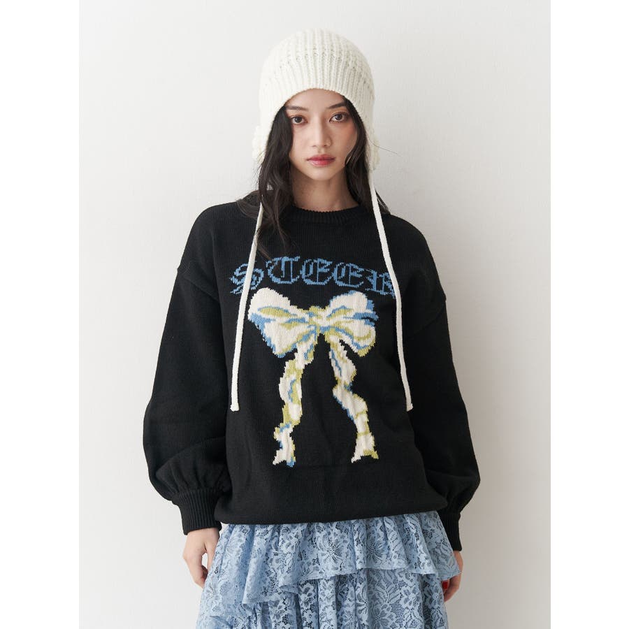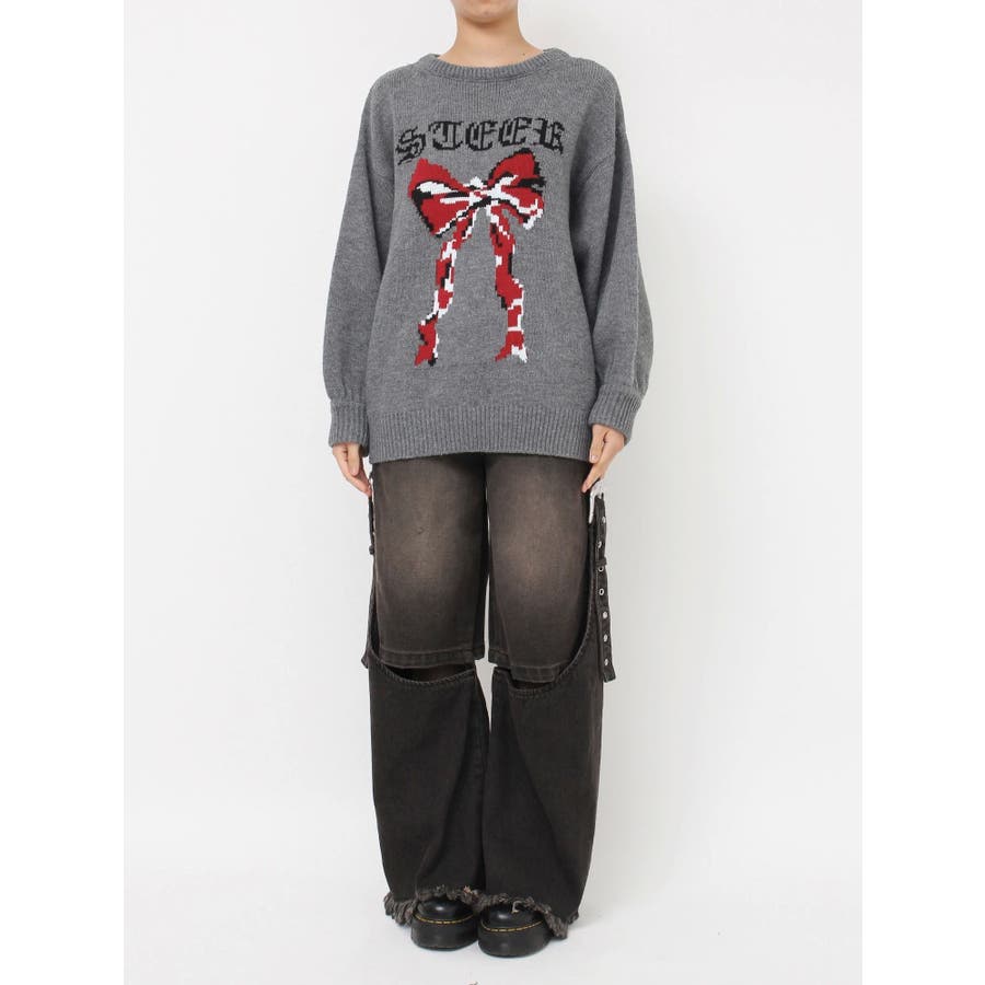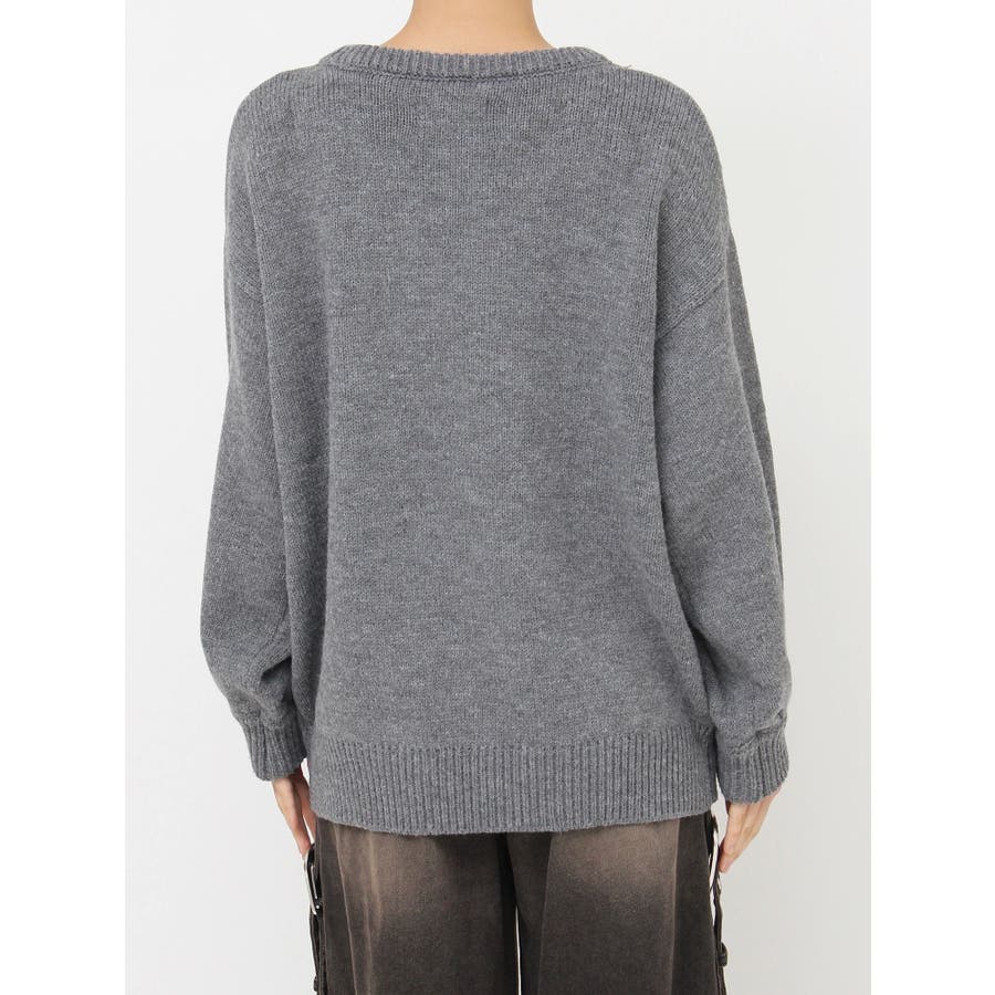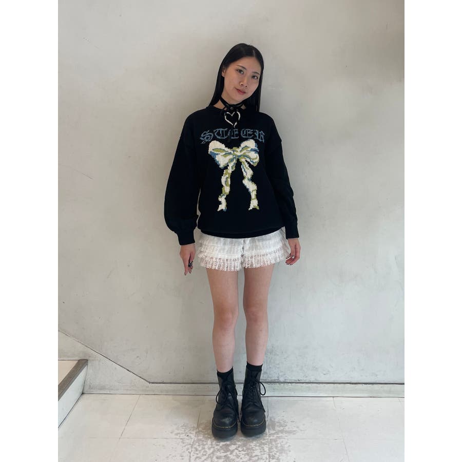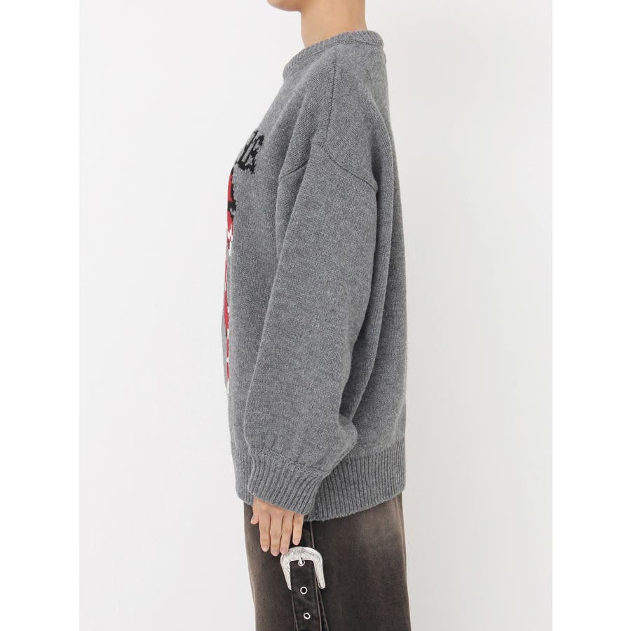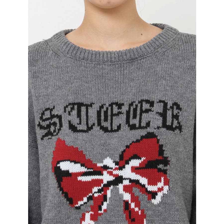 【ポイント】リボングラフィックが大胆に施されたされたジャガードルーズニット。甘めリボン×ストリートな印象のオールドイングリッシュロゴの組み合わせがjouetie(ジュエティ)らしい!この1枚で甘辛MIXスタイルが完成します!【スタイリング】おしりが隠れるゆったりとした丈感なので、ゆるっと1枚でチュニック風に着るのがかわいい!レースティアードショートパンツをちら見せすると甘辛MIXに決まるのでおすすめです♪足元はロングブーツを合わせると、トレンド感MAXなコーディネートが完成します。jouetieこだわりのサイズ感なのでタートルニットやシャツとのレイヤードもしやすいです。レースロングスカートをゆるっと合わせたり、ティアードミニスカートを裾からチラッと見せたり…甘めのスタイリングも今っぽくておすすめです。※編み地が変更になり、ジャガードグラフィックがより繊細に表現されます。※詳細画像が正しい仕様となります。※着用画像はフラッシュの加減で実際の製品と色味等が異なる場合がございますので、生地のズームアップ画像をご確認ください。※ご利用の端末画面の設定により実際の商品と色味が異なる場合がございます。※正しいサイズはアイテムサイズ表をご確認ください。※商品のお取り扱いについては、脇についている洗濯ネーム類をご確認下さい。【商品特徴】透け感:なし伸縮性:あり生地の厚さ:普通サイズ感:ゆったり裏地:なしポケット:なし