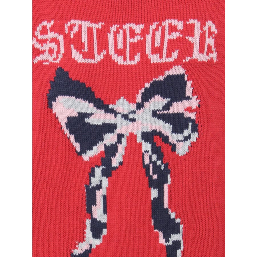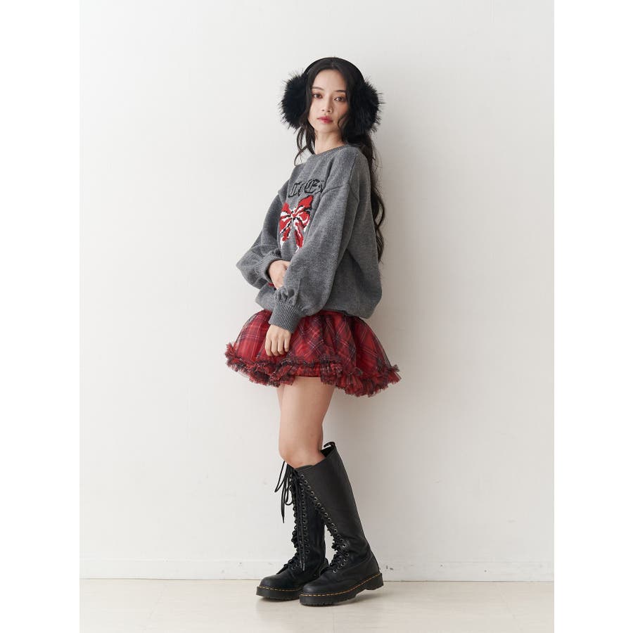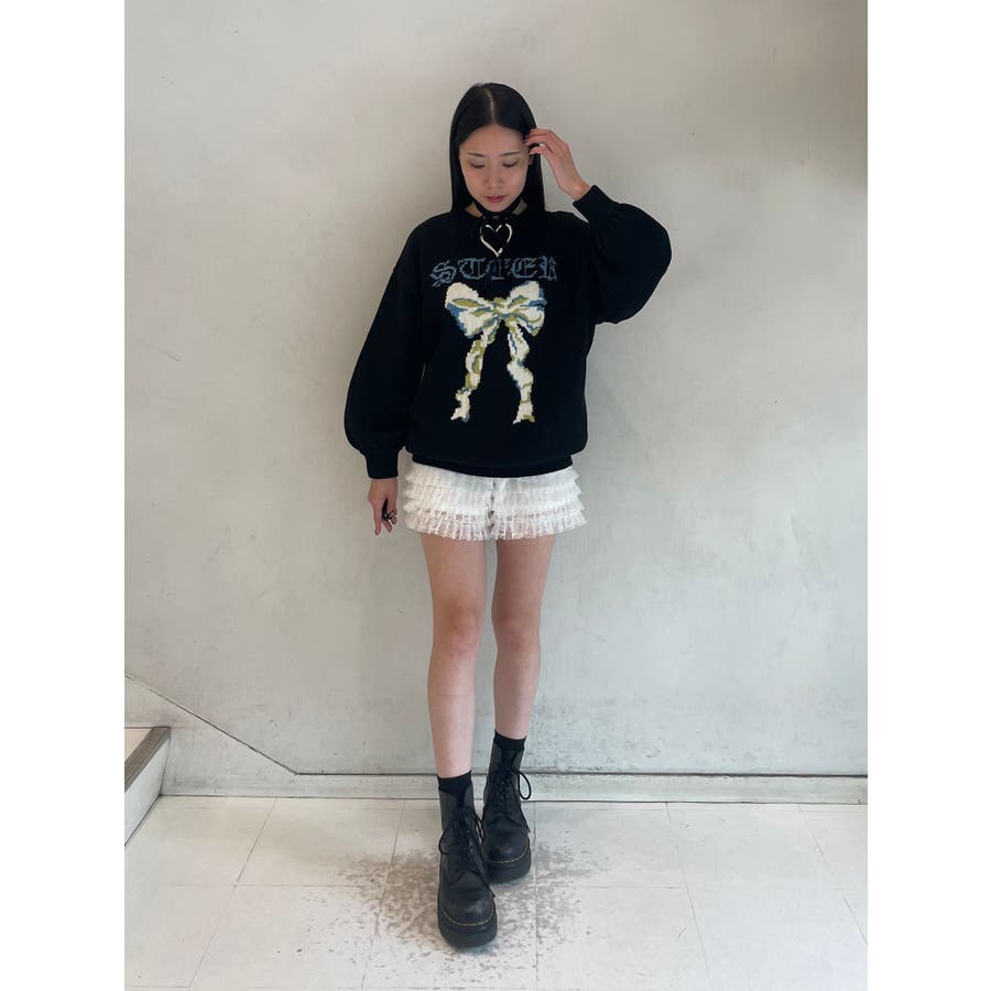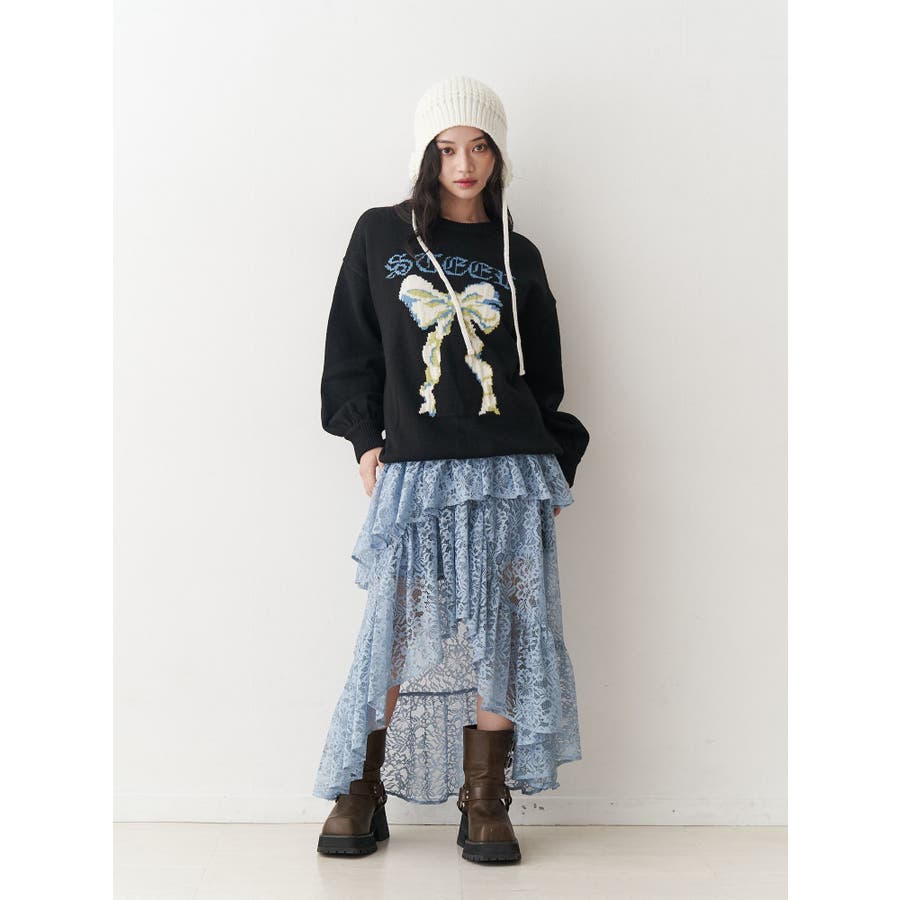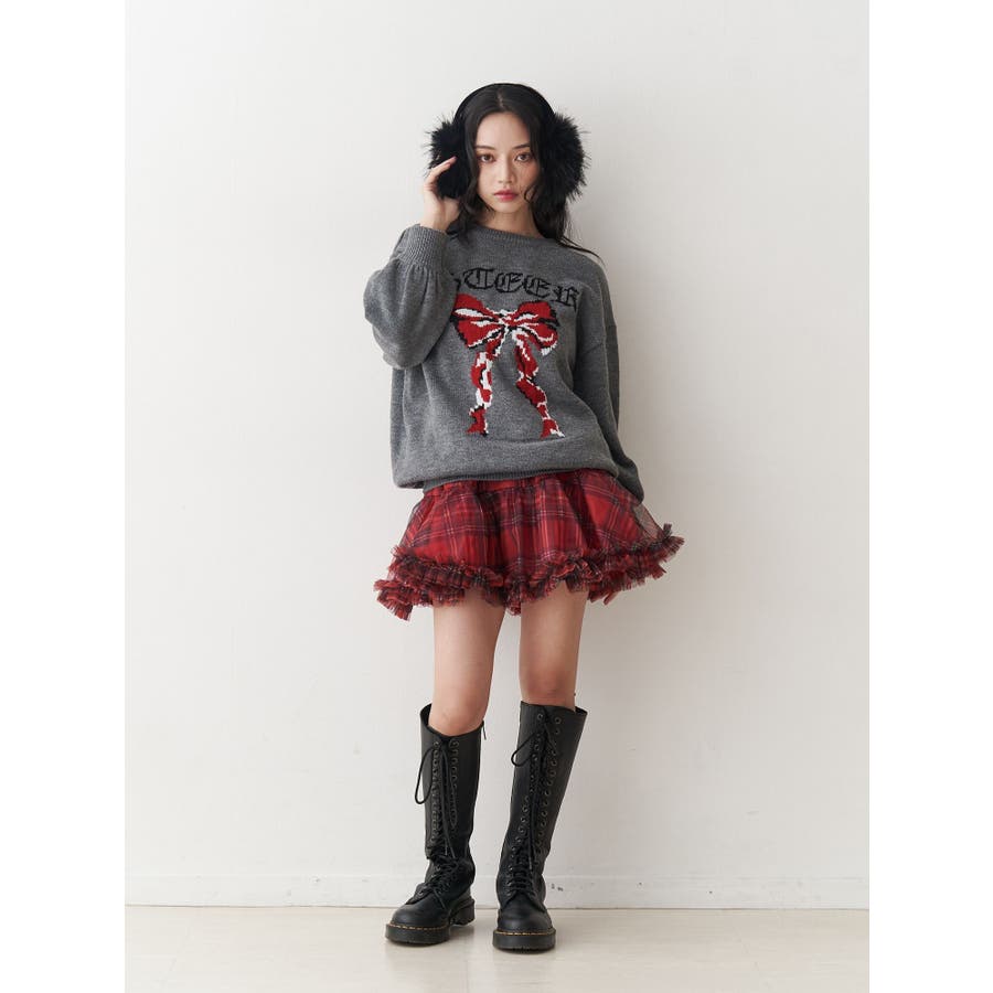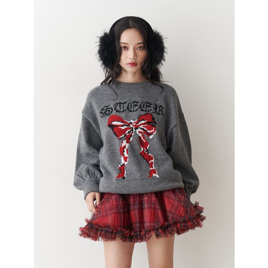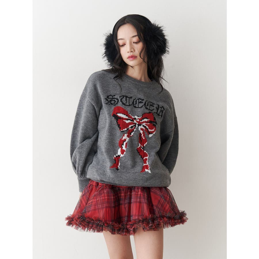 【ポイント】リボングラフィックが大胆に施されたされたジャガードルーズニット。甘めリボン×ストリートな印象のオールドイングリッシュロゴの組み合わせがjouetie(ジュエティ)らしい!この1枚で甘辛MIXスタイルが完成します!【スタイリング】おしりが隠れるゆったりとした丈感なので、ゆるっと1枚でチュニック風に着るのがかわいい!レースティアードショートパンツをちら見せすると甘辛MIXに決まるのでおすすめです♪足元はロングブーツを合わせると、トレンド感MAXなコーディネートが完成します。jouetieこだわりのサイズ感なのでタートルニットやシャツとのレイヤードもしやすいです。レースロングスカートをゆるっと合わせたり、ティアードミニスカートを裾からチラッと見せたり…甘めのスタイリングも今っぽくておすすめです。※編み地が変更になり、ジャガードグラフィックがより繊細に表現されます。※詳細画像が正しい仕様となります。※着用画像はフラッシュの加減で実際の製品と色味等が異なる場合がございますので、生地のズームアップ画像をご確認ください。※ご利用の端末画面の設定により実際の商品と色味が異なる場合がございます。※正しいサイズはアイテムサイズ表をご確認ください。※商品のお取り扱いについては、脇についている洗濯ネーム類をご確認下さい。【商品特徴】透け感:なし伸縮性:あり生地の厚さ:普通サイズ感:ゆったり裏地:なしポケット:なし