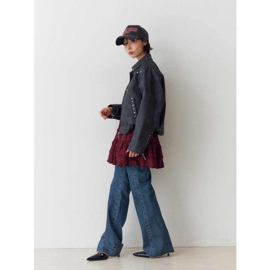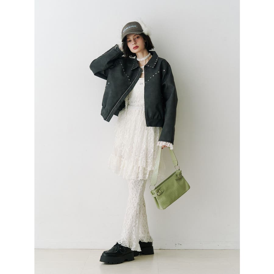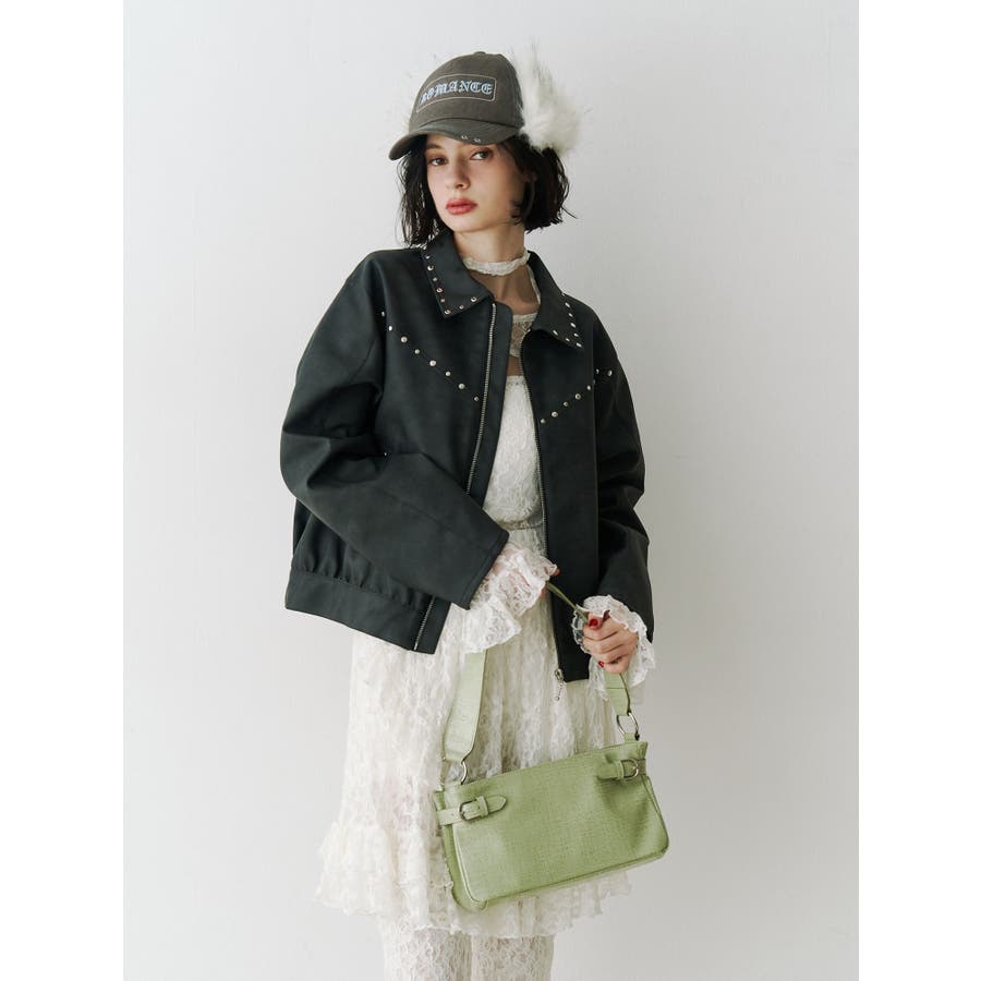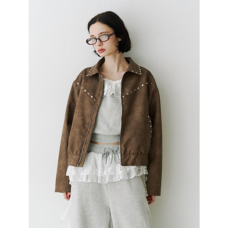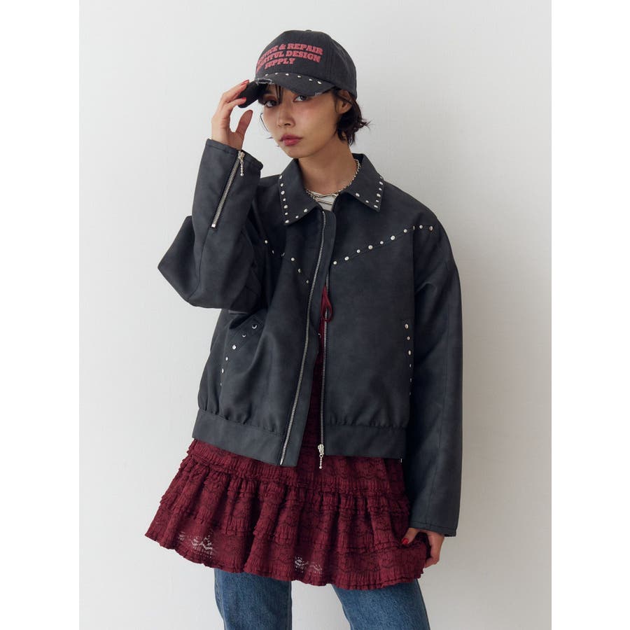 【ポイント】 スタッズ使いがハード×ヴィンテージライクなjouetie(ジュエティ)らしいブルゾン。 特にブラウンとピンクはウォッシュ加工風の生地でよりこなれた印象に。 オーバーサイズ過ぎず、ちょうど良い丈感なのでミニ丈やロング丈ワンピースなど様々なコーディネートに合わせやすいです。 【スタイリング】 レースワンピースなど、ガーリーなアイテムと合わせた甘辛バランスのコーディネートがjouetieっぽい! スウェットパンツなどラフなアイテムと合わせるとコーディネートがグッと引き締まります。 ※着用画像はフラッシュの加減で実際の製品と色味等が異なる場合がございますので、生地のズームアップ画像をご確認ください。 ※ご利用の端末画面の設定により実際の商品と色味が異なる場合がございます。 ※正しいサイズはアイテムサイズ表をご確認ください。 ※商品のお取り扱いについては、脇についている洗濯ネーム類をご確認下さい。【商品特徴】透け感:なし伸縮性:なし生地の厚さ:普通サイズ感:普通裏地: ありポケット:あり(前)