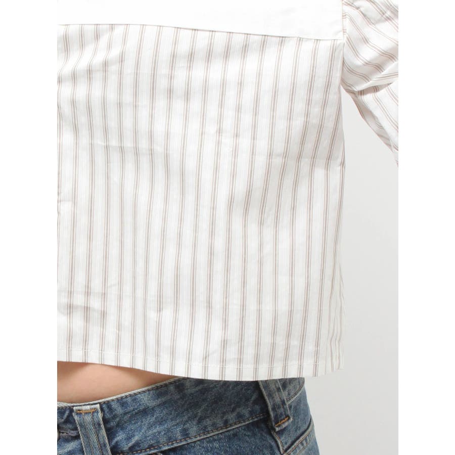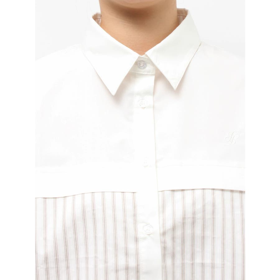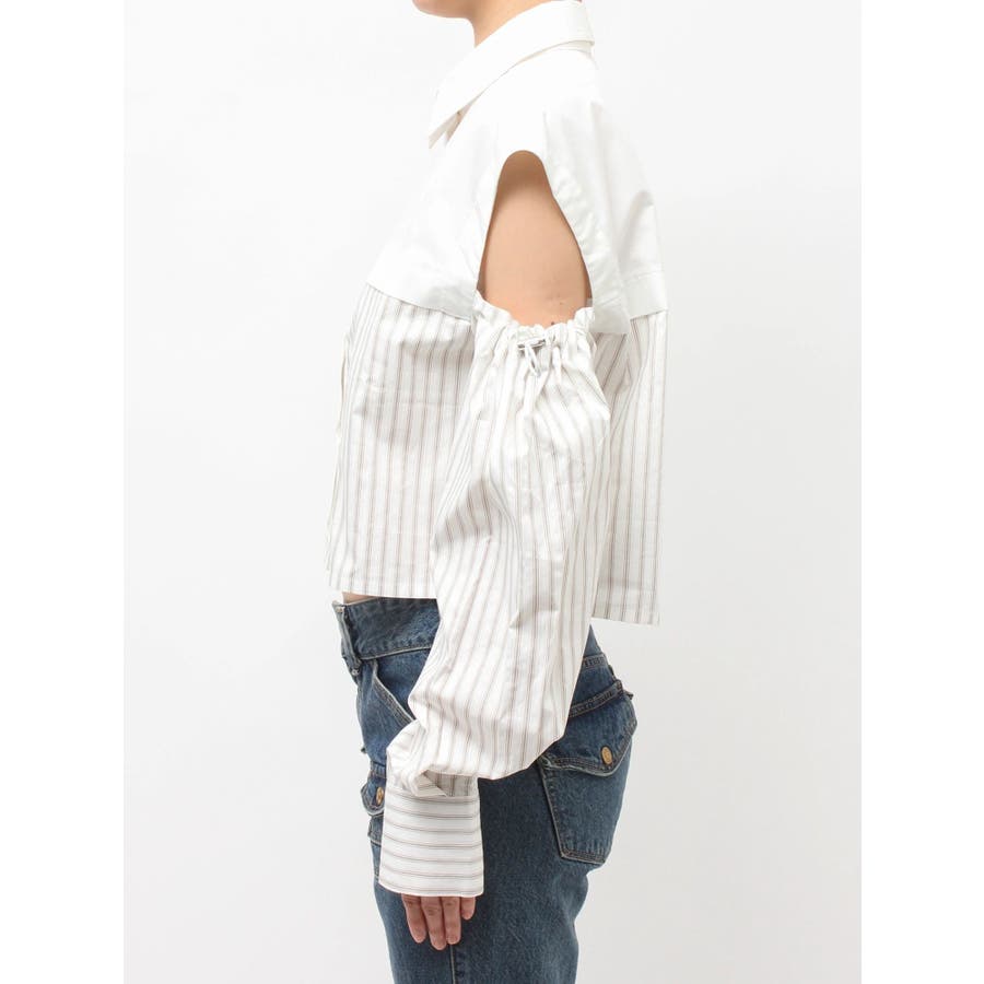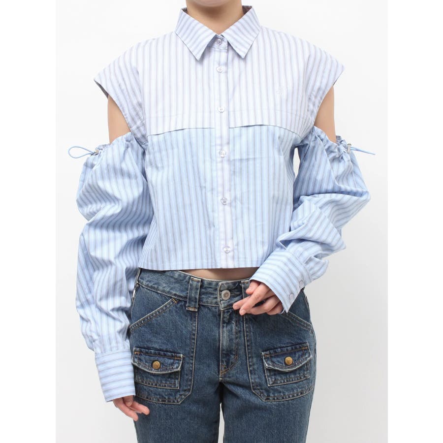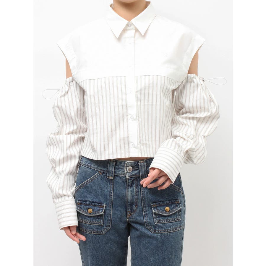 【ポイント】 肩のスリットデザインが印象的な、jouetieらしいクロップドシャツ。 メンズライクなストライプシャツをベースに、大胆なスリーブカットとショート丈で抜け感と女性らしさをプラスしました。 上下の素材違いでモード感もプラスされた1着。 スタイリングや気分に合わせて、ドロストを絞って袖のボリュームを調整できます! 【スタイリング】 コンパクトな丈感は、ミニボトムとの相性抜群です。 ネクタイを合わせてスクールガール風のコーディネートもかわいい! ※ピンクは他カラーと同様、無地が上身頃、ストライプ柄が下身頃に変更になります。 ※着用画像はフラッシュの加減で実際の製品と色味等が異なる場合がございますので、生地のズームアップ画像をご確認ください。 ※ご利用の端末画面の設定により実際の商品と色味が異なる場合がございます。 ※正しいサイズはアイテムサイズ表をご確認ください。 ※商品のお取り扱いについては、脇についている洗濯ネーム類をご確認下さい。