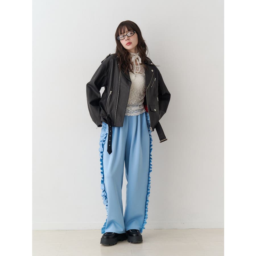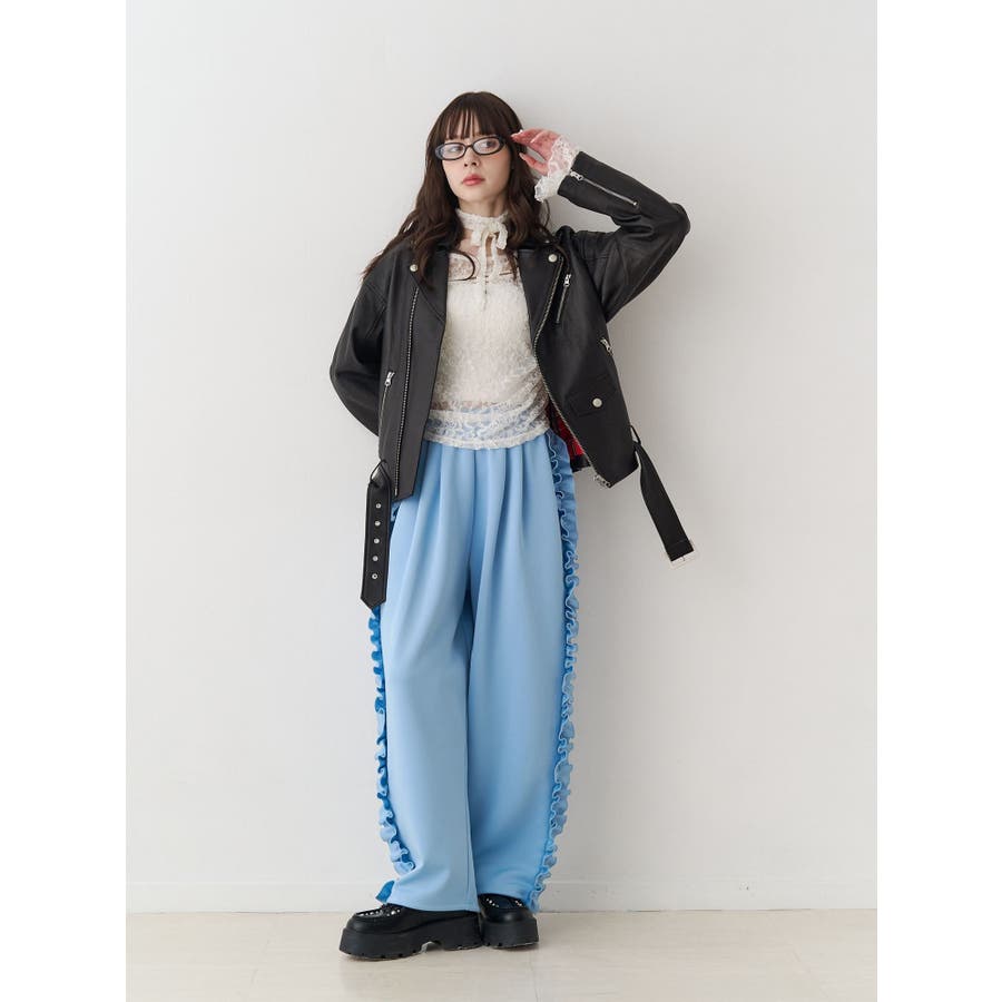 【ポイント】 人気のアイテムに春らしい新色が登場!! スポーティなトラックパンツ×サイドフリルの甘さのMIX感がjouetie(ジュエティ)らしいアイテム。 お尻から裾にかけての丸いラインがボディラインをカバーしてくれるバレルレッグシルエットです。 すっきりとしたハイウエストデザインなのでメリハリが効き、スタイルアップ効果抜群です。 裾のドロストで絞ると足首でたまるので、低身長の方も気にせず穿けるのが嬉しいポイント! 【スタイリング】 今シーズンは少し腰を落とした着こなしがこなれ感アップ! カジュアルなワイドトラックパンツにはクロップド丈のブラウスやシアートップスなどを合わせ、 メリハリを効かせたコーディネートがよりトレンド感のあるのあるスタイリングに。 厚底のブーツやローファーで足元にアクセントをプラスするとバランス良く仕上がります! 同素材のルーズフリルトラックジャケットを合わせたとことんストリートなスタイリングもおすすめです! 【セットアップ対応アイテム】 0826129002 フリルトラックジャケット【セットアップ対応】 ※着用画像はフラッシュの加減で実際の製品と色味等が異なる場合がございますので、生地のズームアップ画像をご確認ください。 ※ご利用の端末画面の設定により実際の商品と色味が異なる場合がございます。 ※正しいサイズはアイテムサイズ表をご確認ください。 ※商品のお取り扱いについては、脇についている洗濯ネーム類をご確認下さい。【商品特徴】透け感:なし伸縮性:ややあり生地の厚さ:普通サイズ感:ゆったり裏地:なしポケット:あり(横)