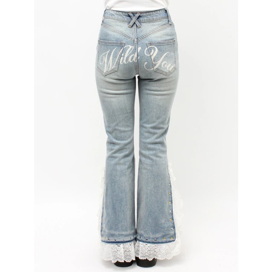 【ポイント】 フェミニンなレースとエッジィなスタッズを掛け合わせた、jouetieらしいMIXデザインのフレアデニム。 裾にレースをドッキングし、動くたびに揺れる繊細なディテールが存在感を放ちます。 サイドにはスタッズを施し、甘さの中にスパイスをプラス。 バックには「Wild You」のロゴプリントをあしらい、後ろ姿まで抜かりないデザインです。 【スタイリング】 ハイウエストのフレアシルエットが脚を長く美しく見せ、スタイルアップ効果抜群! スウェットやニット、シャツとの相性も良く、シーズンレスで活躍する主役級デニムです。 ※着用画像はフラッシュの加減で実際の製品と色味等が異なる場合がございますので、生地のズームアップ画像をご確認ください。 ※ご利用の端末画面の設定により実際の商品と色味が異なる場合がございます。 ※正しいサイズはアイテムサイズ表をご確認ください。 ※商品のお取り扱いについては、脇についている洗濯ネーム類をご確認下さい。