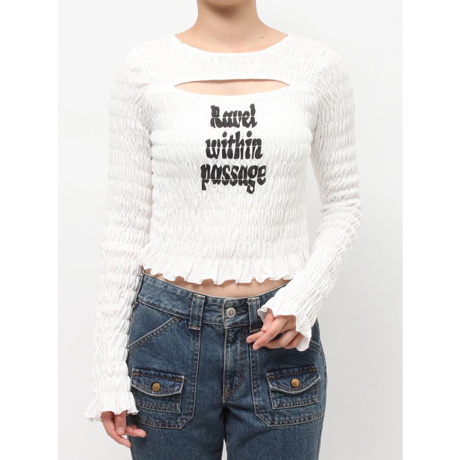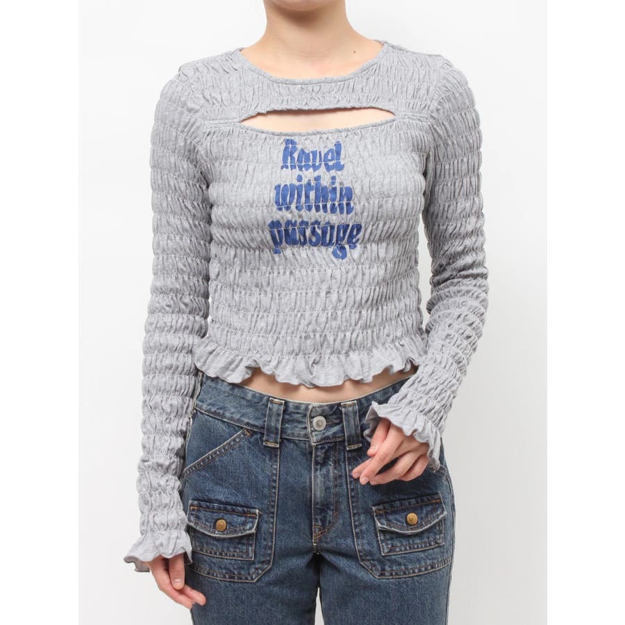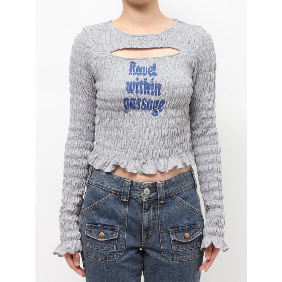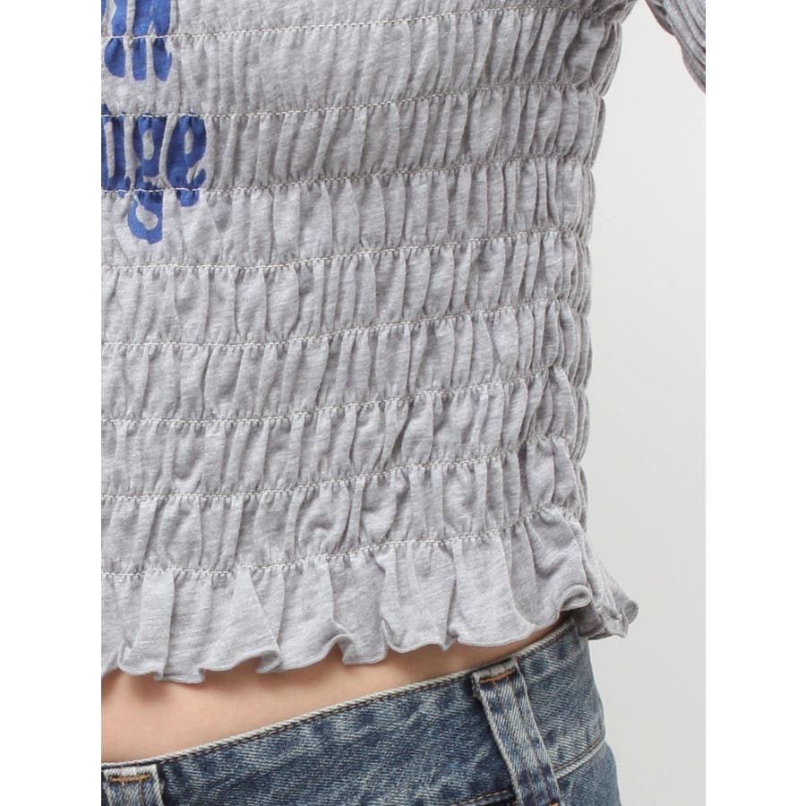 【ポイント】全面にシャーリングを施し、インナーでも1枚でも使いやすいロゴプリントTシャツ。タイトなシルエットですが、シャーリングがボディーラインをカバーしてくれるのでスタイルアップして見えるアイテムです。伸縮性のあるシャーリングで着心地も抜群!ヘルシーさのある胸元のカットアウトがポイントです。【スタイリング】1枚ではもちろん、ロゴやカットアウトのフロントデザインでジャケットなどアウターのインナーとしても大活躍!裾のフリルをいかしたローウエストボトムなどを合わせたスタイリングがおすすめです。【修正コメント】(1)グラフィックが横に3cm程長くなるよう修正します。