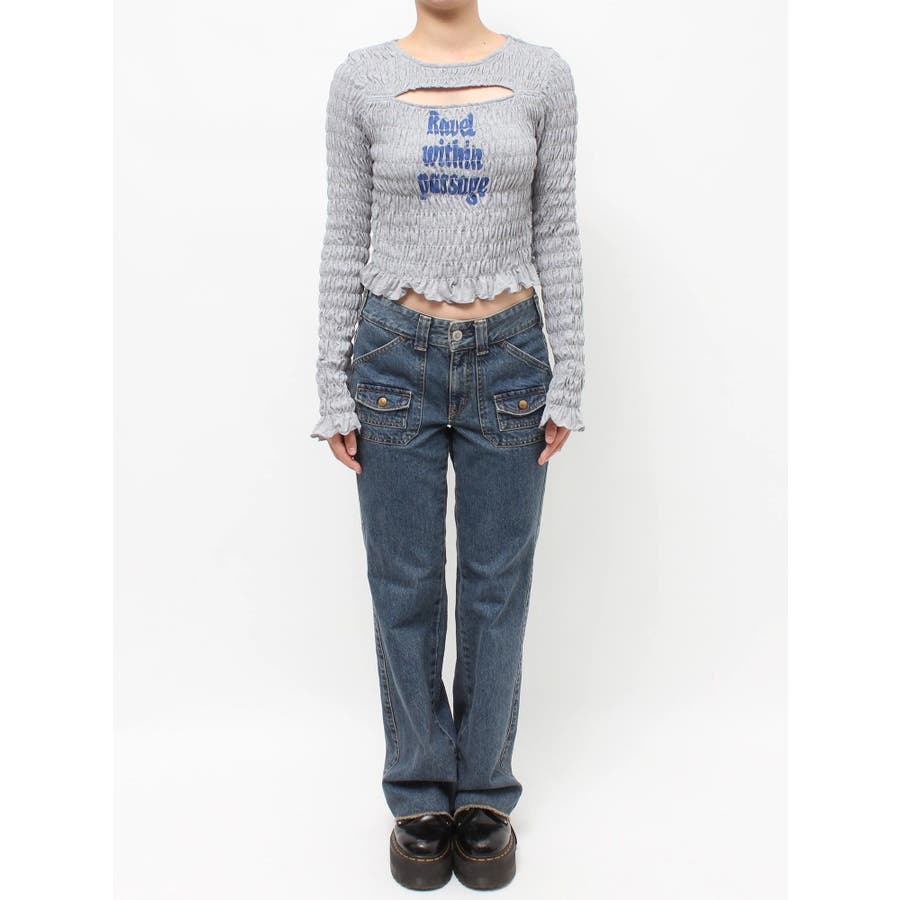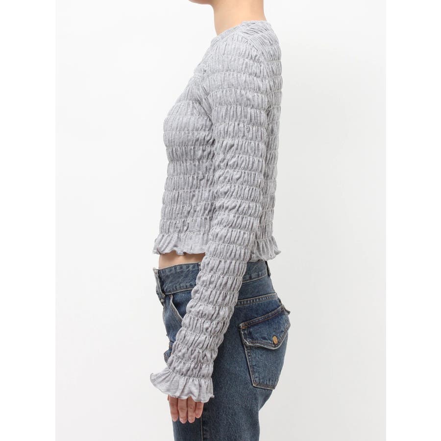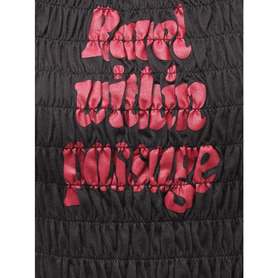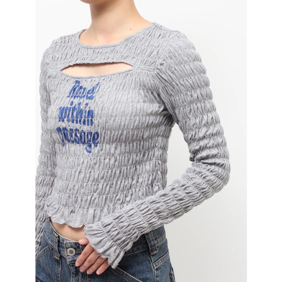 【ポイント】全面にシャーリングを施し、インナーでも1枚でも使いやすいロゴプリントTシャツ。タイトなシルエットですが、シャーリングがボディーラインをカバーしてくれるのでスタイルアップして見えるアイテムです。伸縮性のあるシャーリングで着心地も抜群!ヘルシーさのある胸元のカットアウトがポイントです。【スタイリング】1枚ではもちろん、ロゴやカットアウトのフロントデザインでジャケットなどアウターのインナーとしても大活躍!裾のフリルをいかしたローウエストボトムなどを合わせたスタイリングがおすすめです。【修正コメント】(1)グラフィックが横に3cm程長くなるよう修正します。