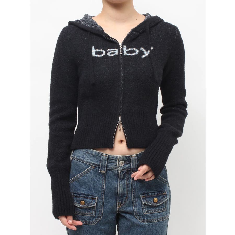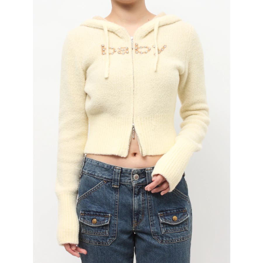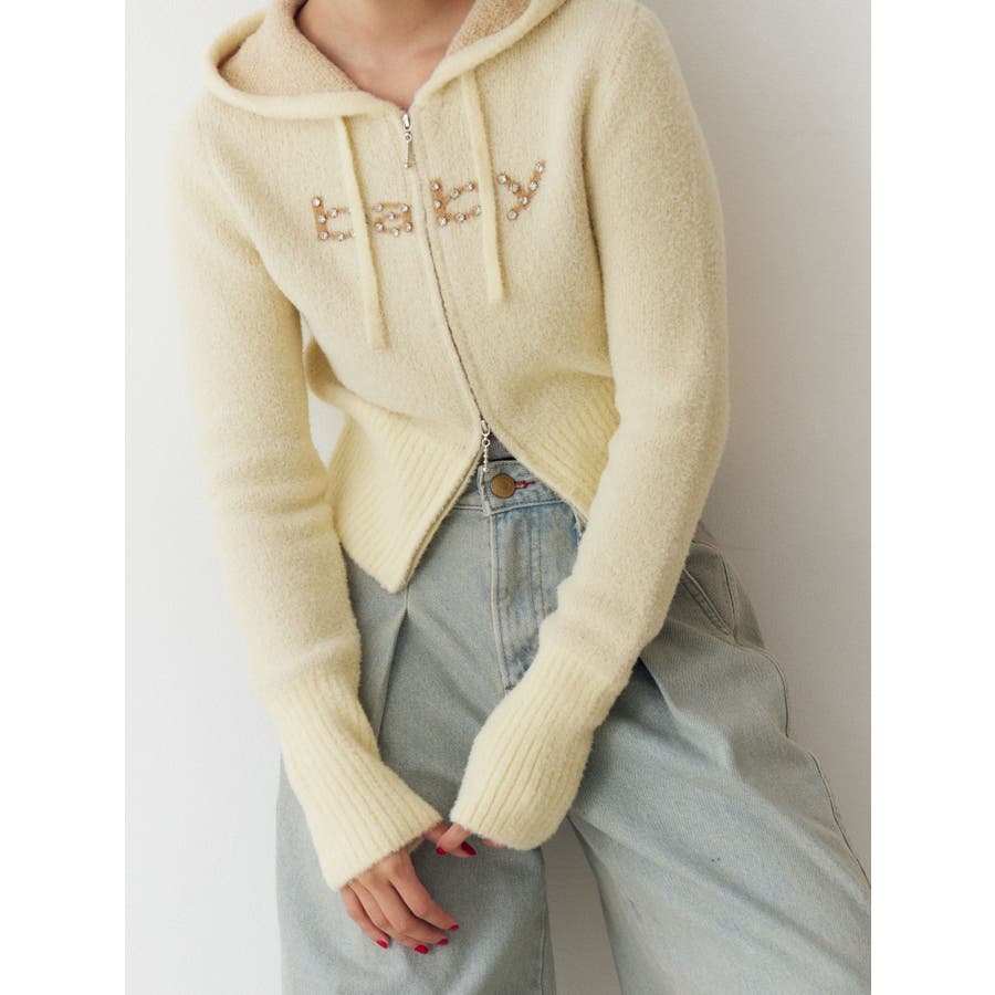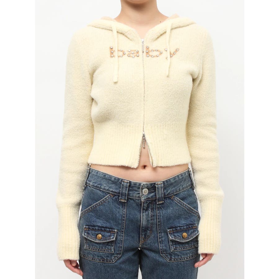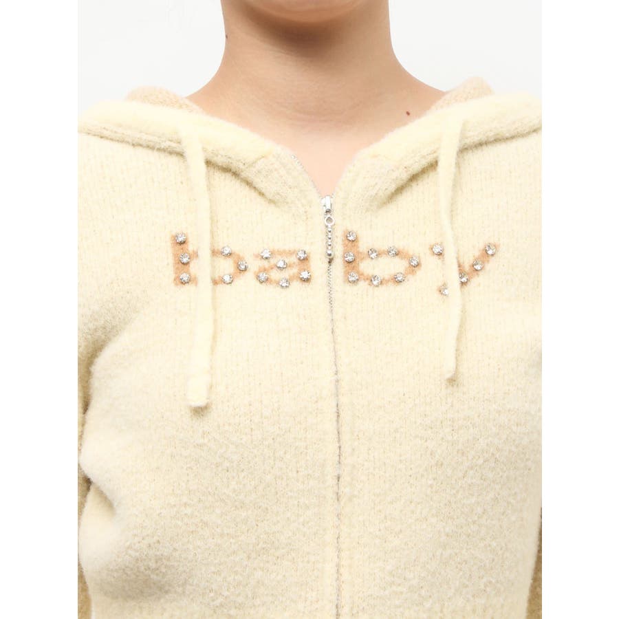【ポイント】 柔らかくふわふわとした、肌触りの良いニット素材で仕上げたフーディ。 着心地見た目も暖かく、春を予感させる淡いカラーリングが可愛らしいニット。 フロントには「baby」ロゴをラインストーンでデコレーションし、カジュアルな中にきらめきをプラス。 【スタイリング】 コンパクトな丈感とリブ切り替えで、スタイルアップ効果も抜群。 ワンピースやレーススカートに合わせた甘めスタイリングはもちろん、デニムやカーゴパンツでストリートに振るのもおすすめです。 ※着用画像はフラッシュの加減で実際の製品と色味等が異なる場合がございますので、生地のズームアップ画像をご確認ください。 ※ご利用の端末画面の設定により実際の商品と色味が異なる場合がございます。 ※正しいサイズはアイテムサイズ表をご確認ください。 ※商品のお取り扱いについては、脇についている洗濯ネーム類をご確認下さい。【商品特徴】透け感:なし伸縮性:あり生地の厚さ:普通サイズ感:細身裏地:なしポケット:なし