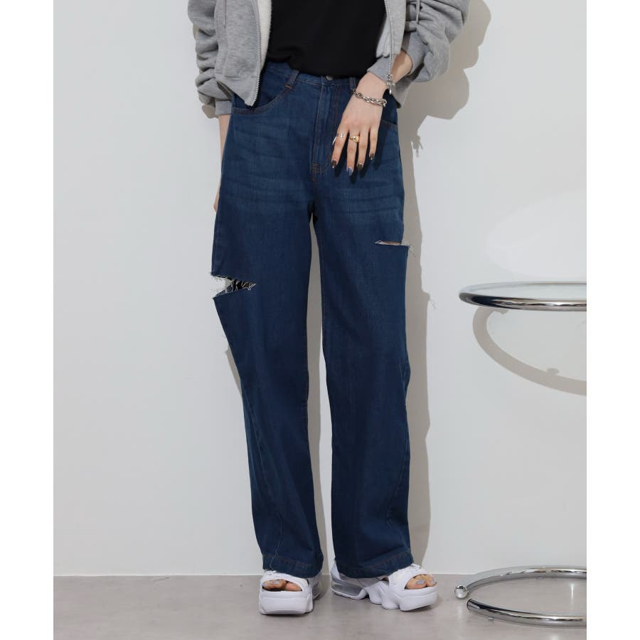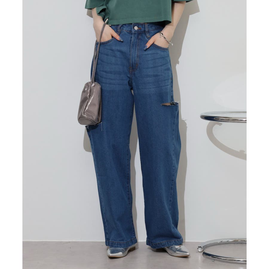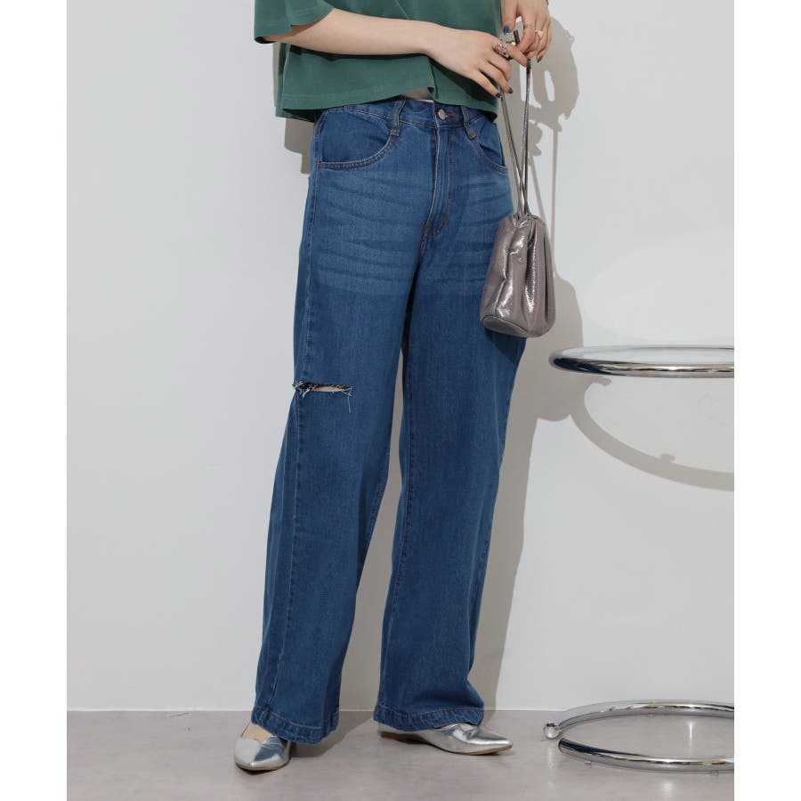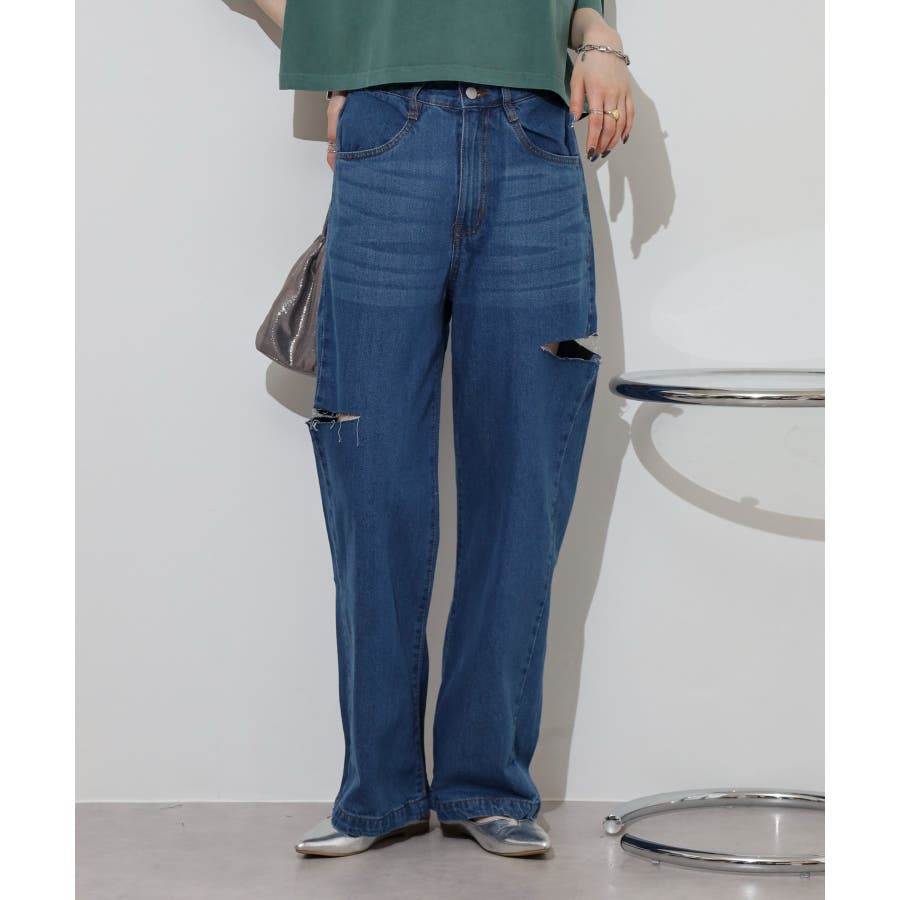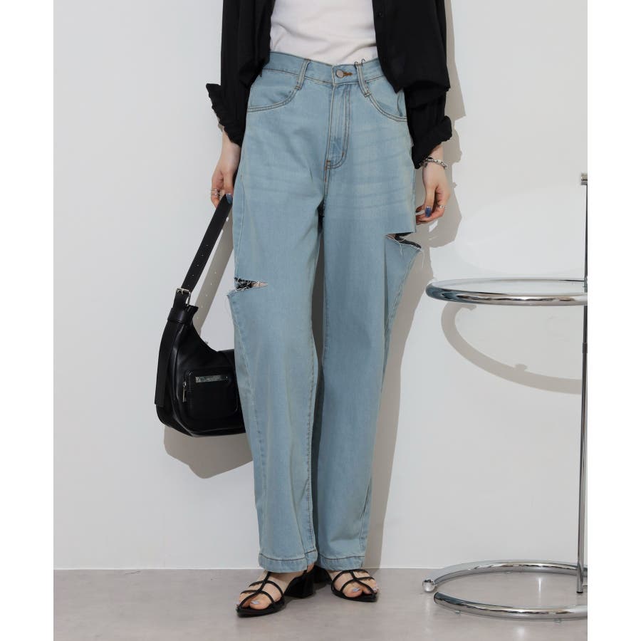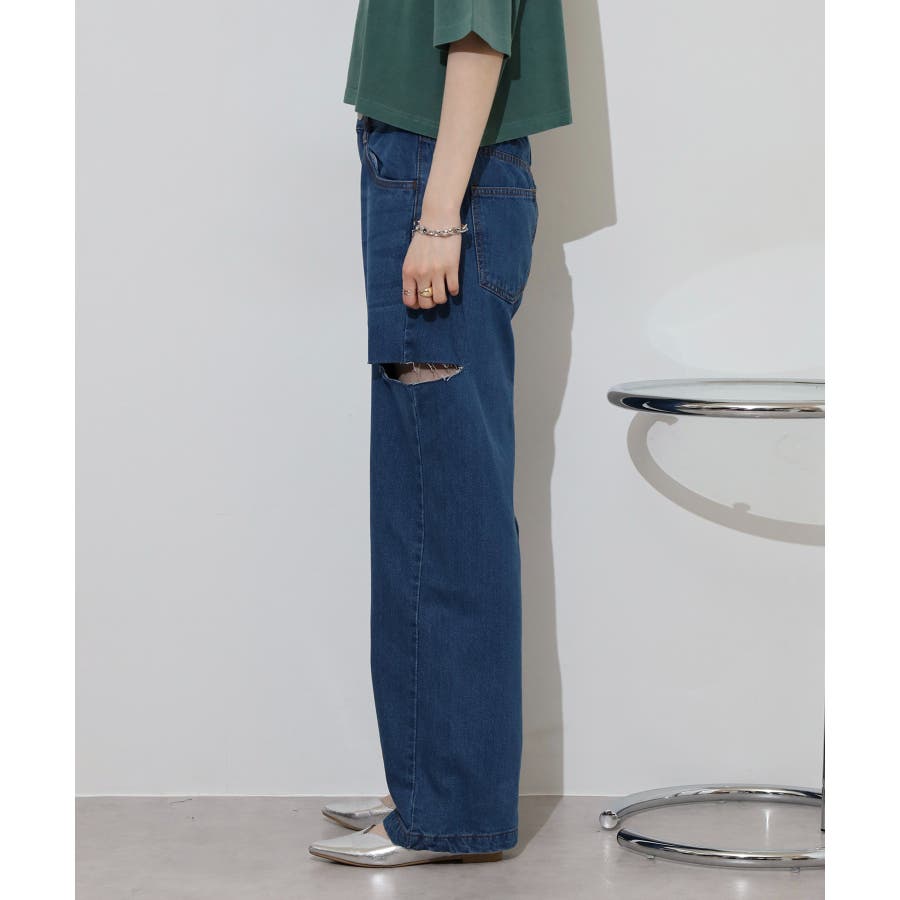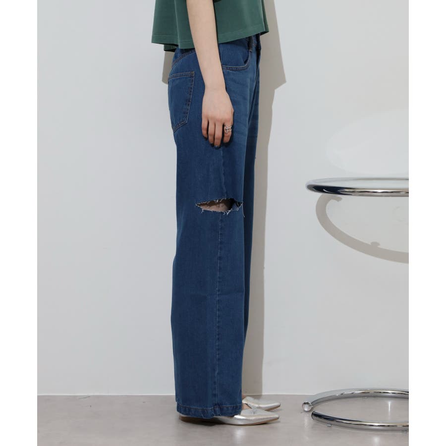 さりげない肌見せが大人の抜け感を演出する「デニムダメージストレートパンツ」。