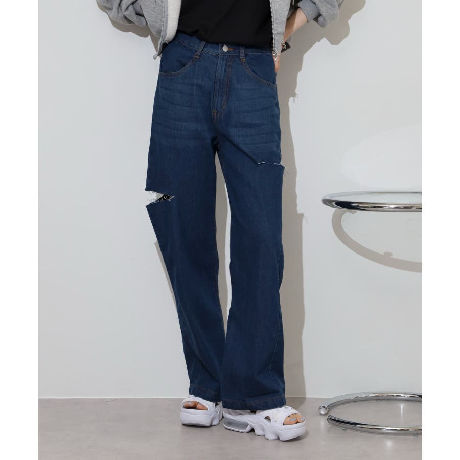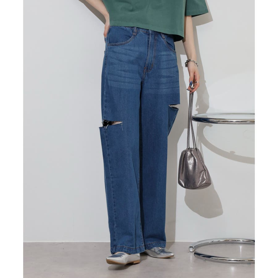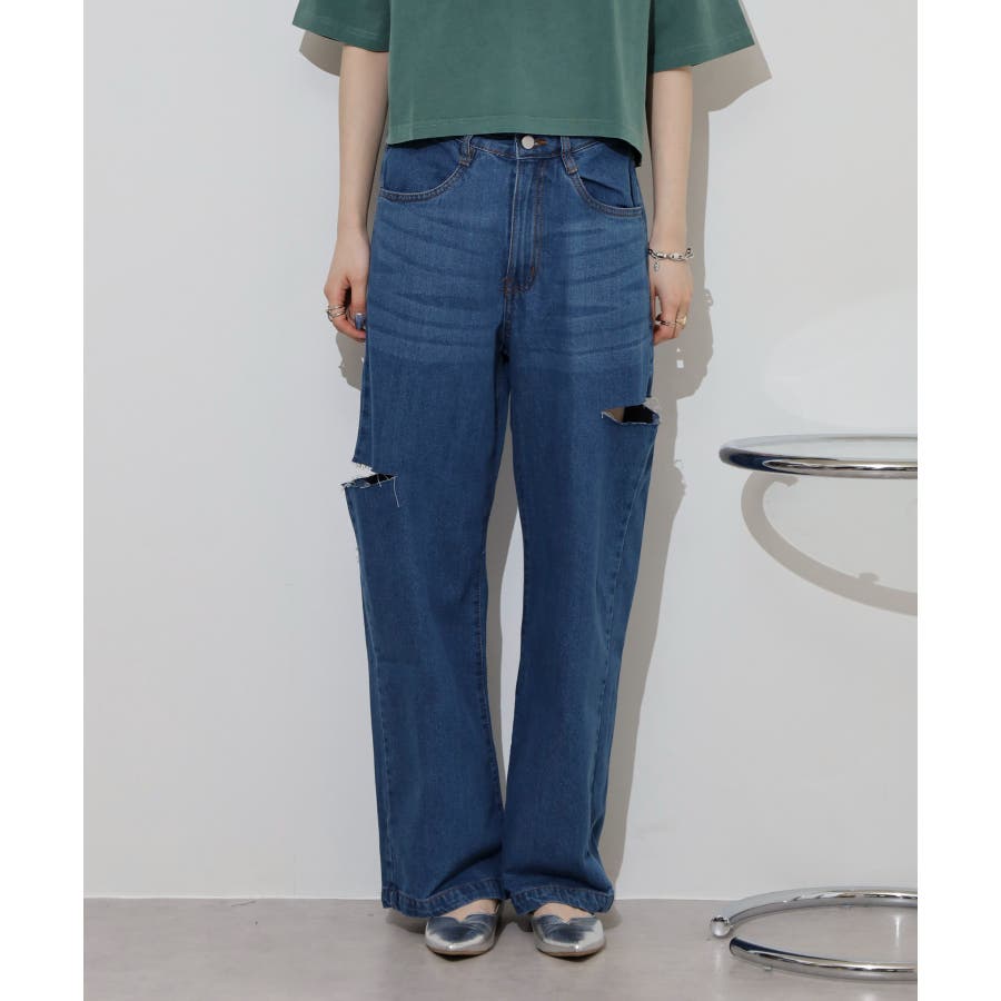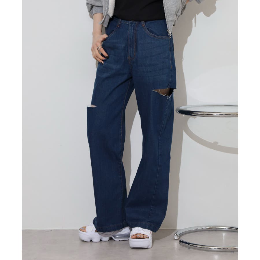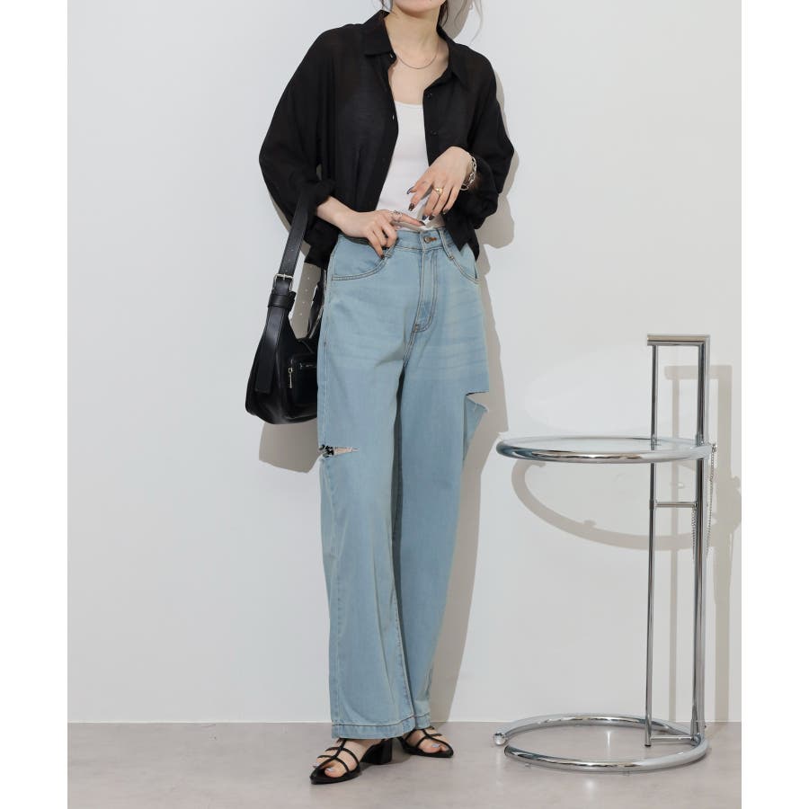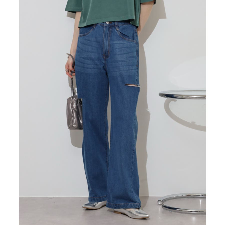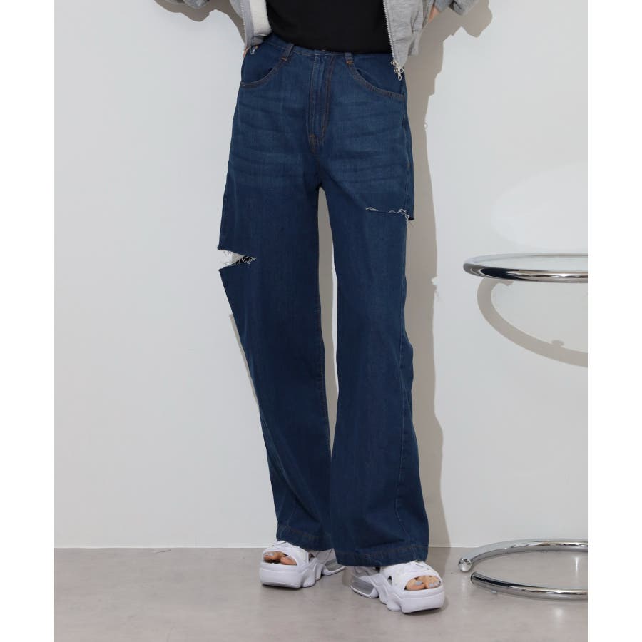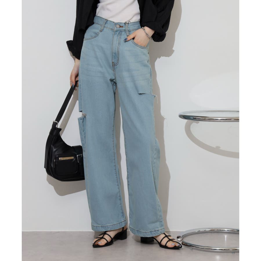 さりげない肌見せが大人の抜け感を演出する「デニムダメージストレートパンツ」。