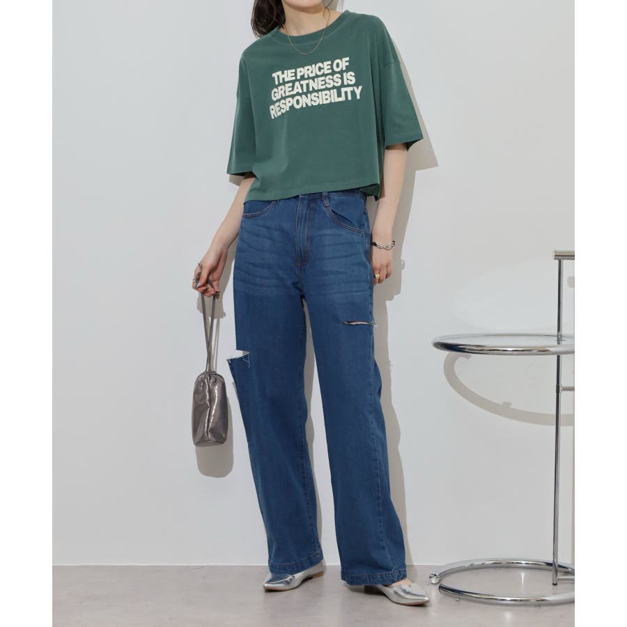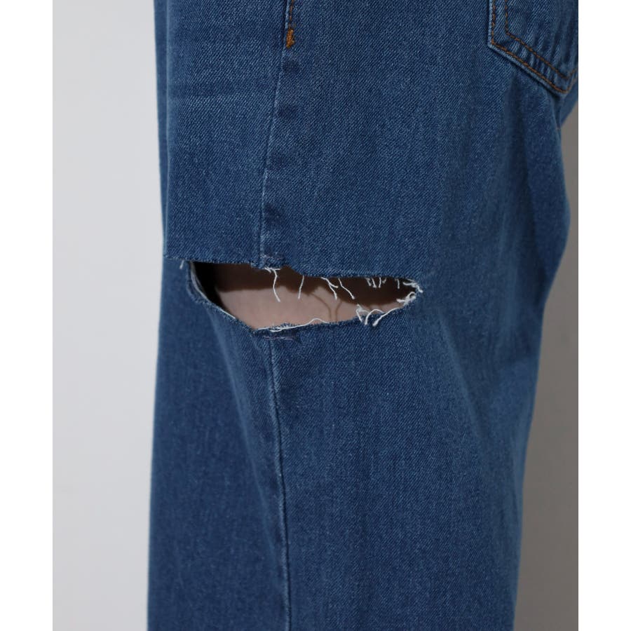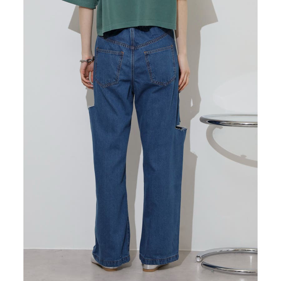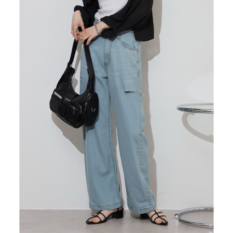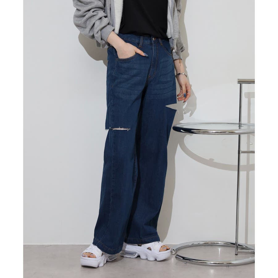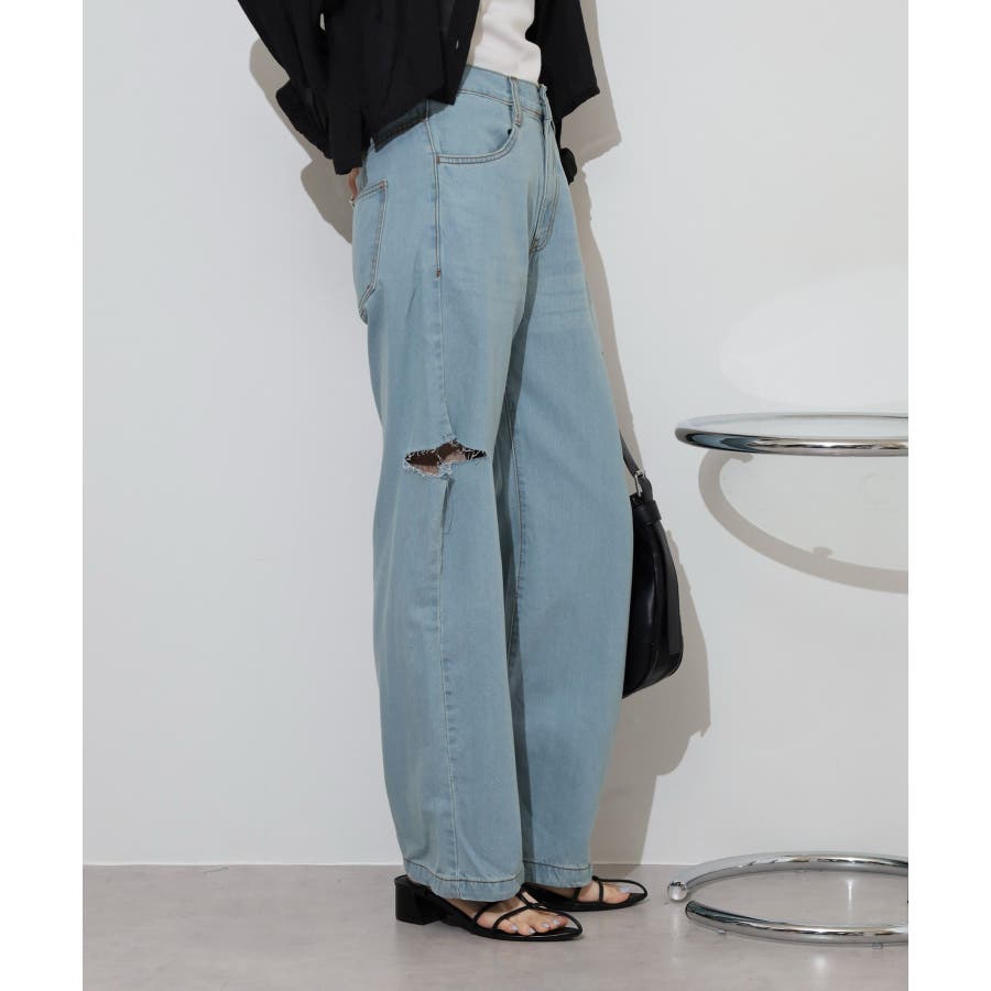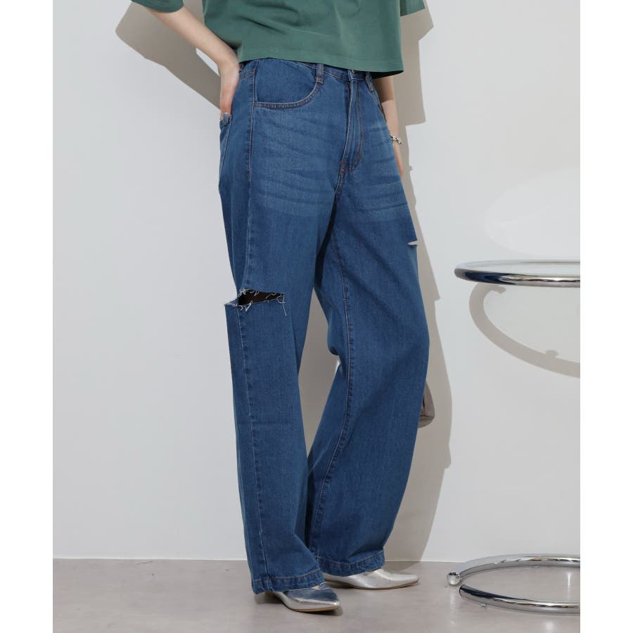 さりげない肌見せが大人の抜け感を演出する「デニムダメージストレートパンツ」。
