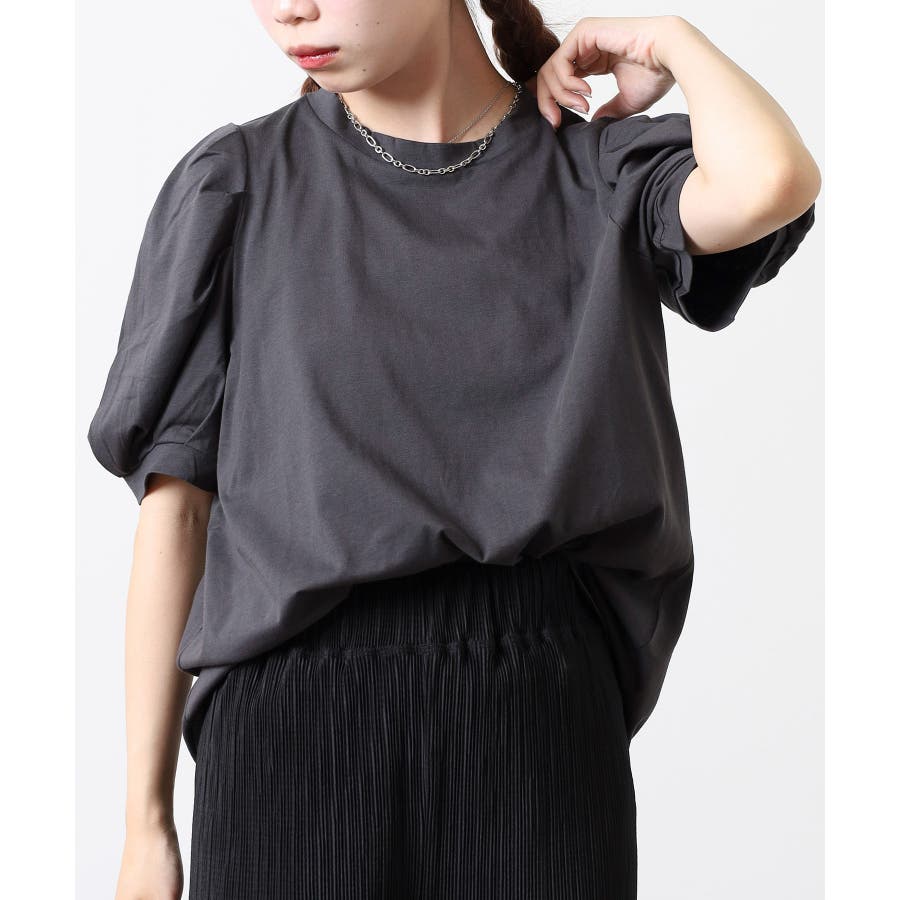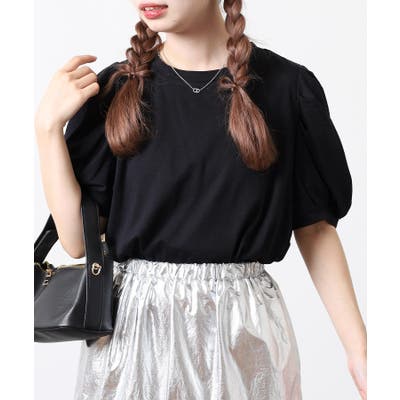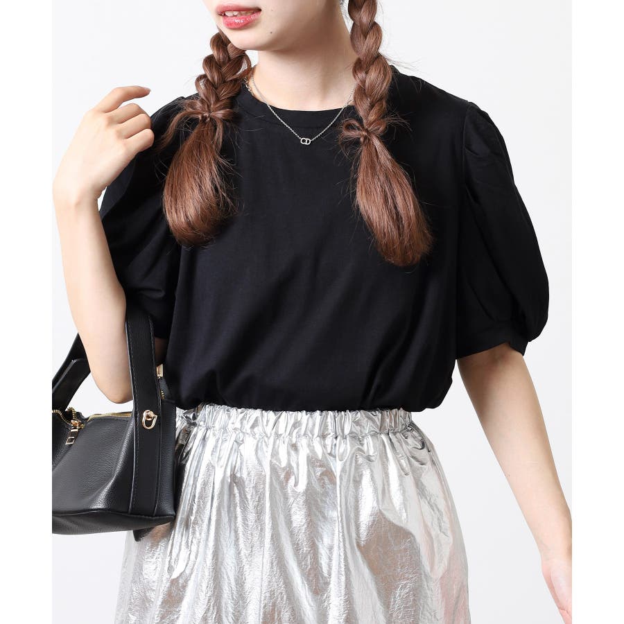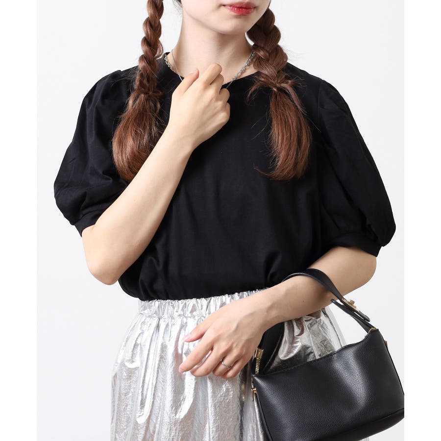ラウンドネックパフスリーブ半袖Tシャツ レディース