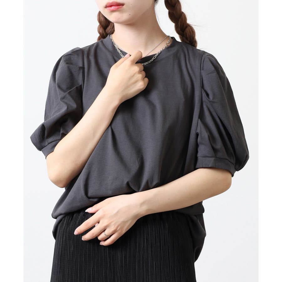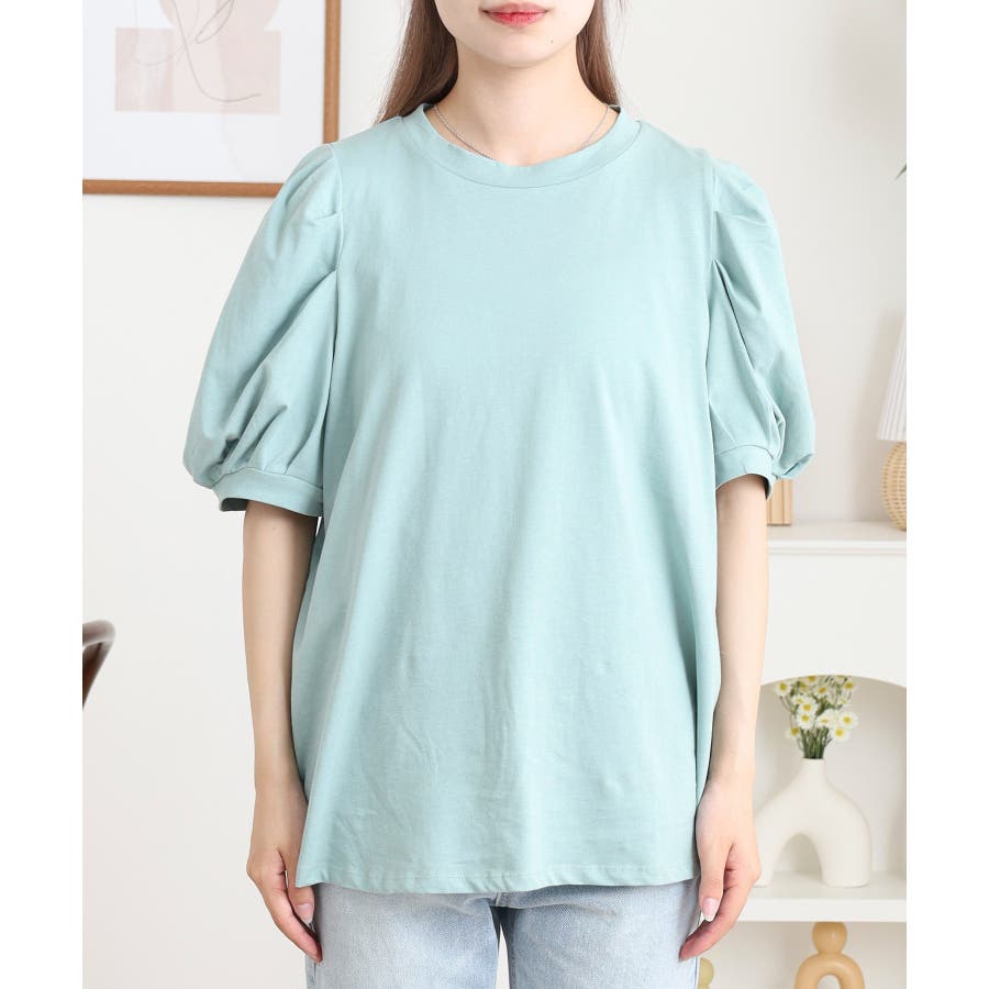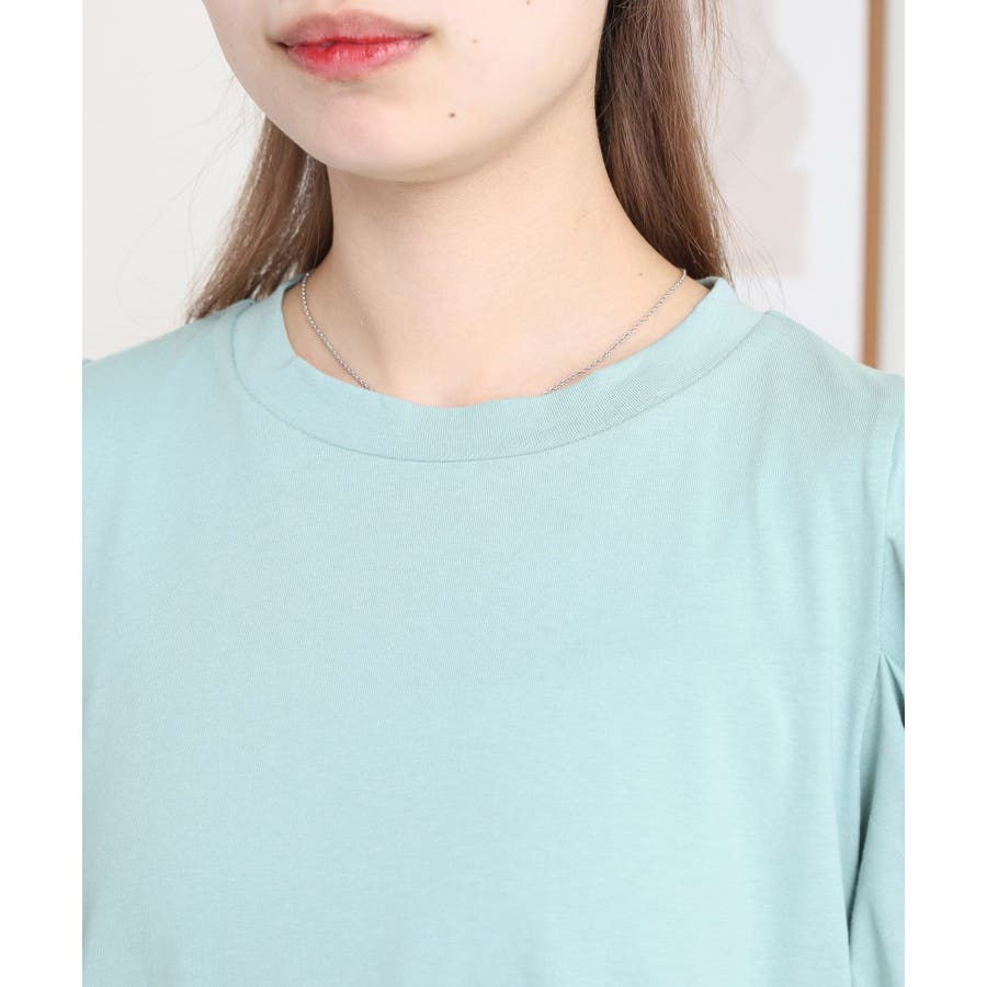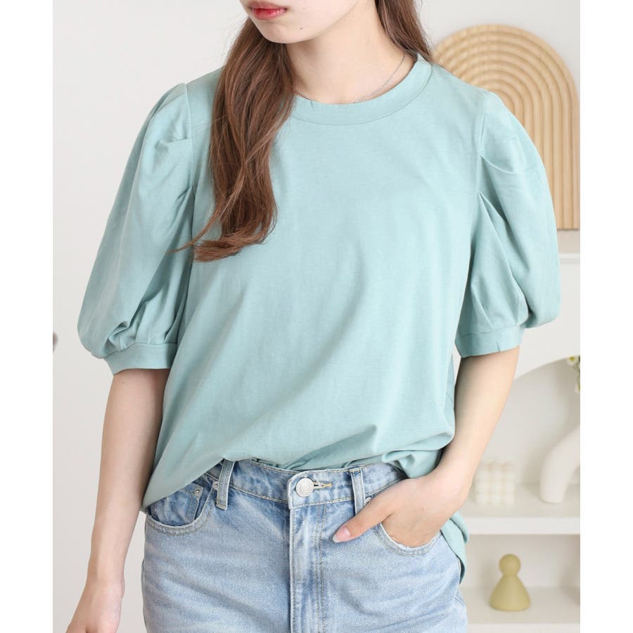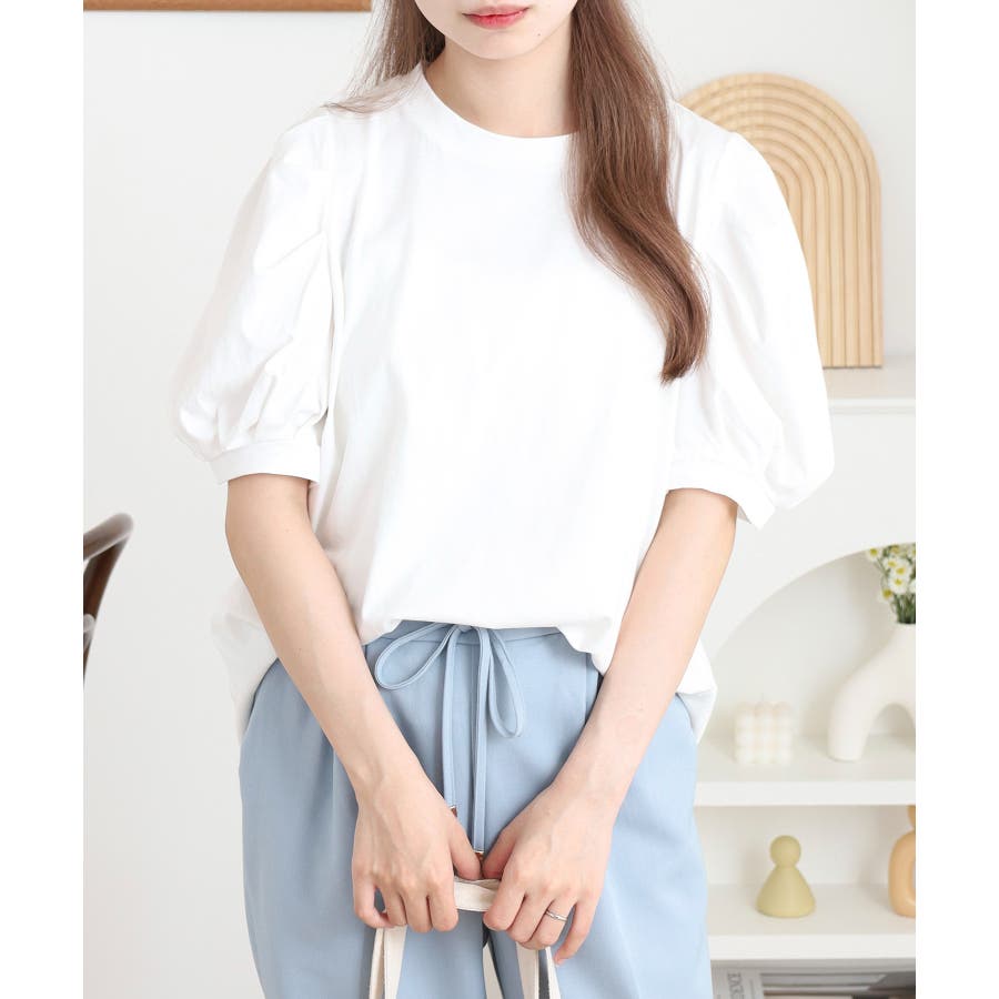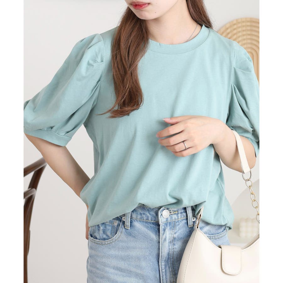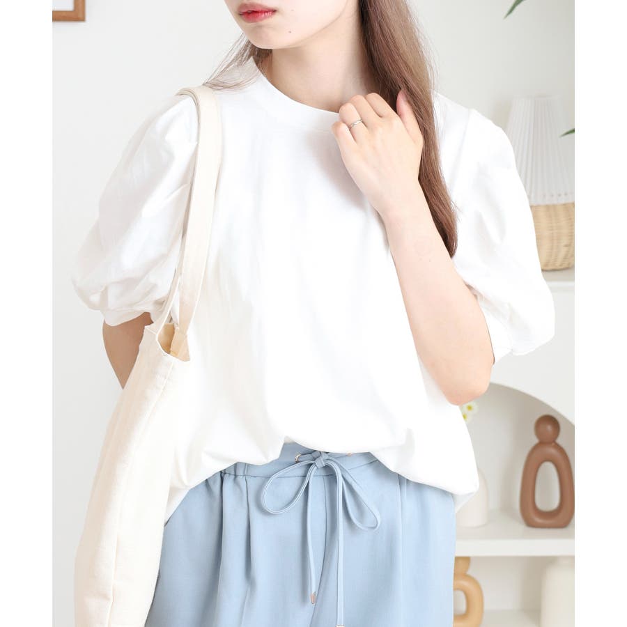 ふんわり袖で大人可愛い印象に仕上がる「ラウンドネックパフスリーブTシャツ」。