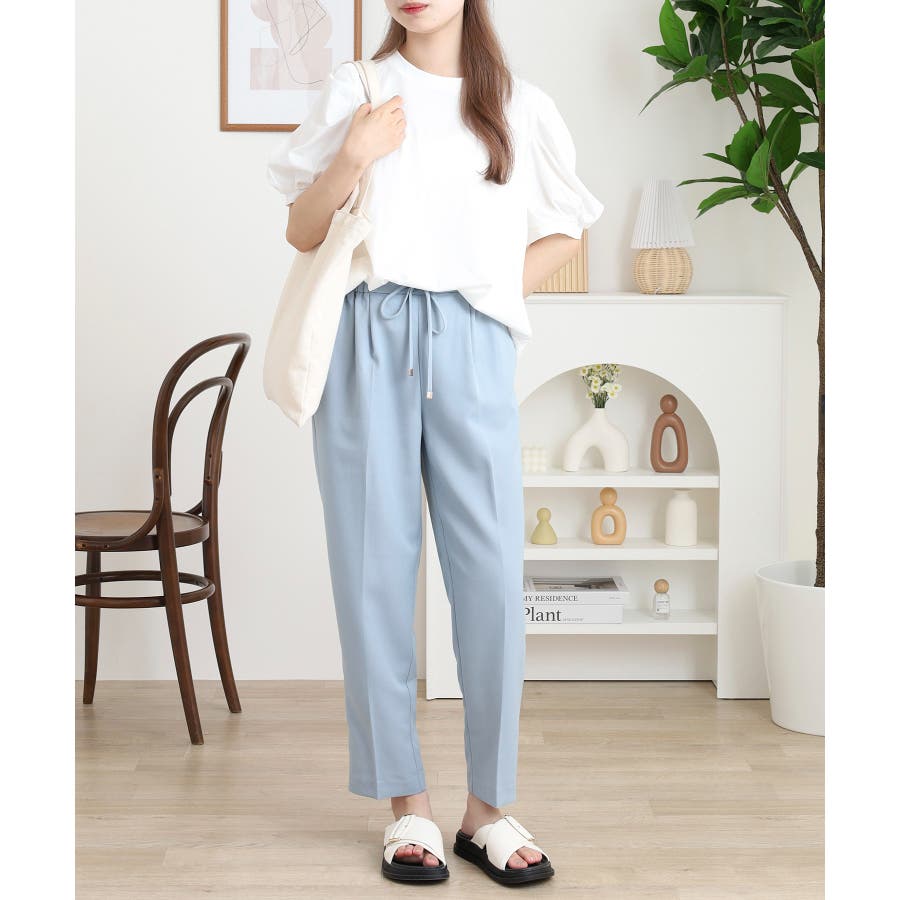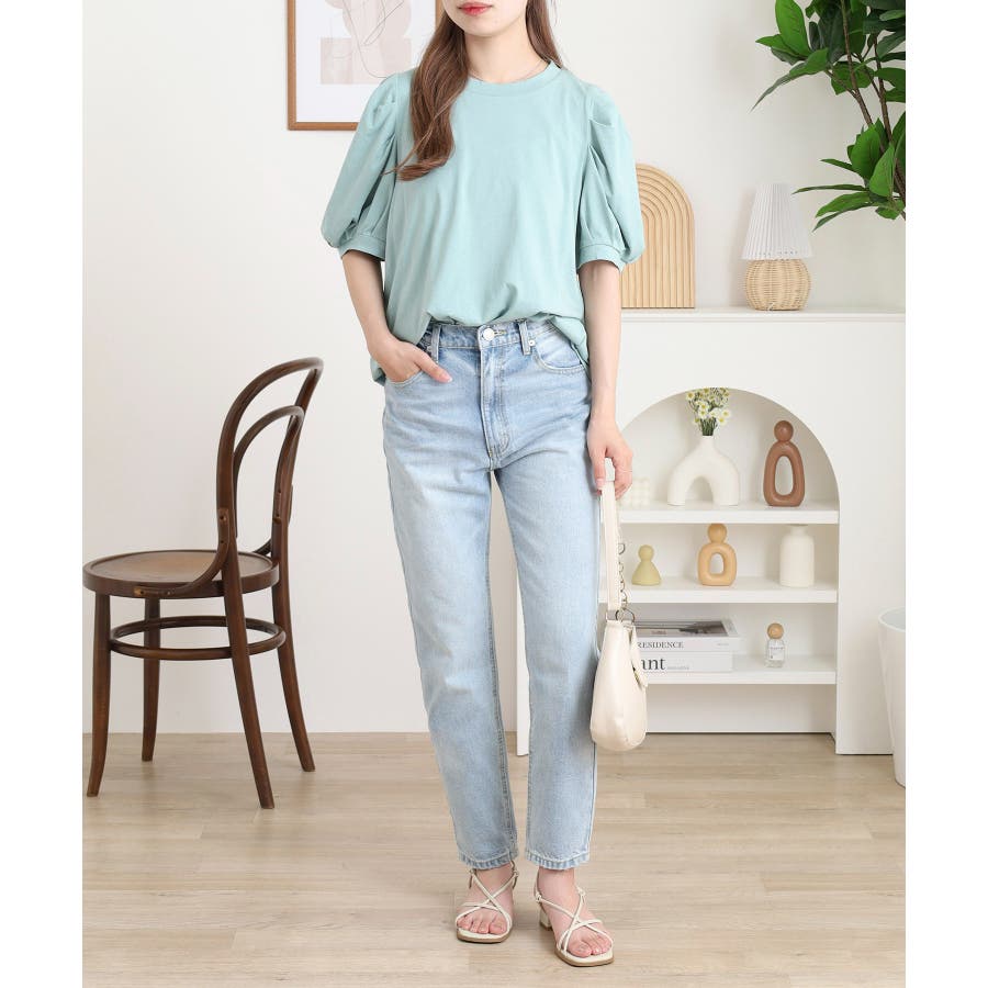 ふんわりとしたパフスリーブがフェミニンなラウンドネックTシャツは、夏から秋にかけて着回せる優秀トップス。