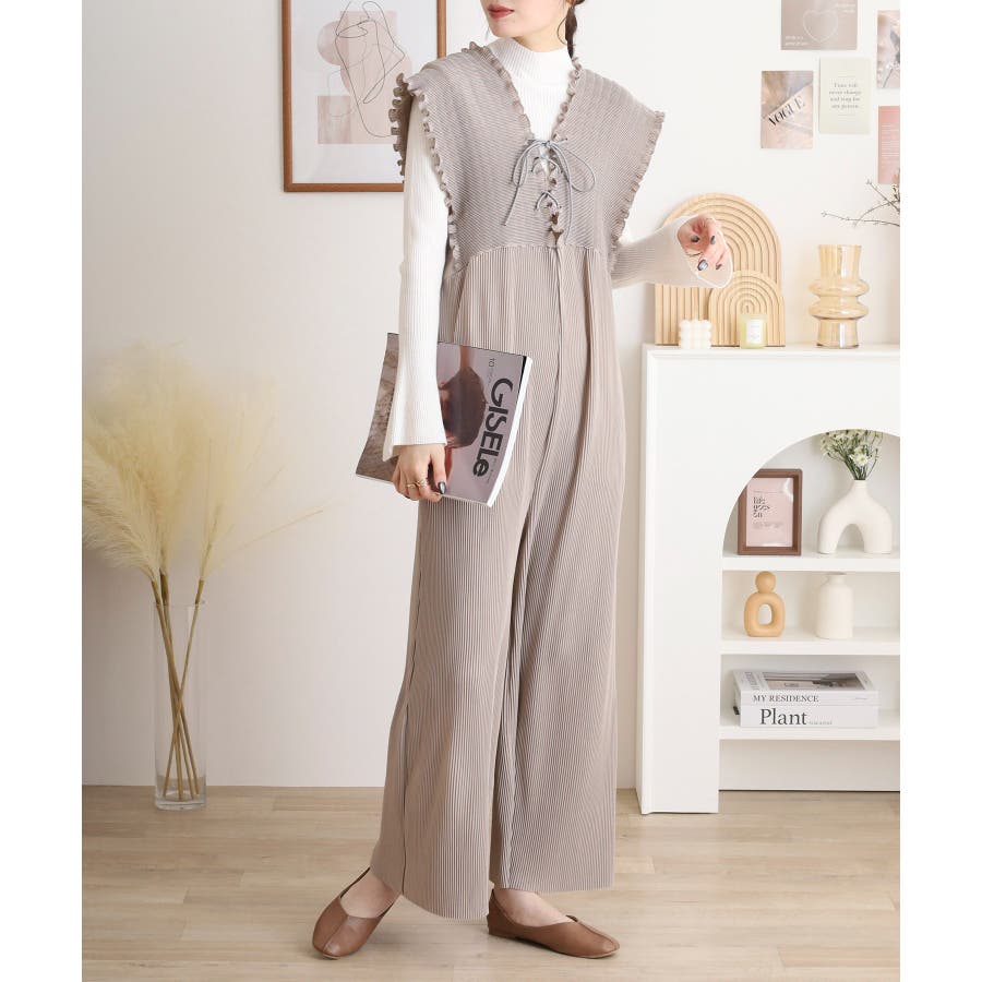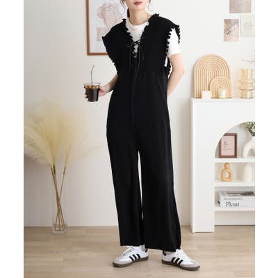 胸元レースアップギャザーオールインワン レディース