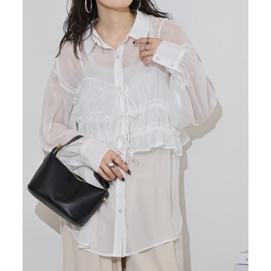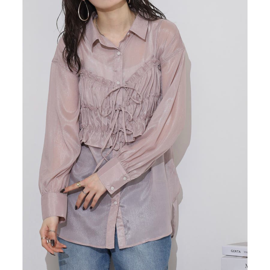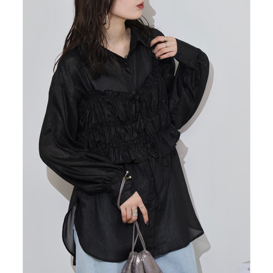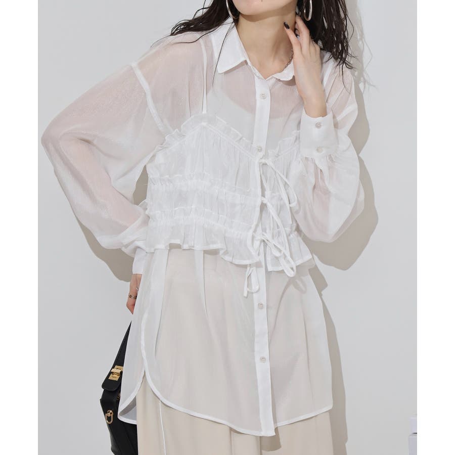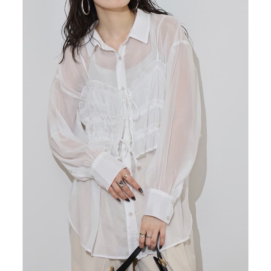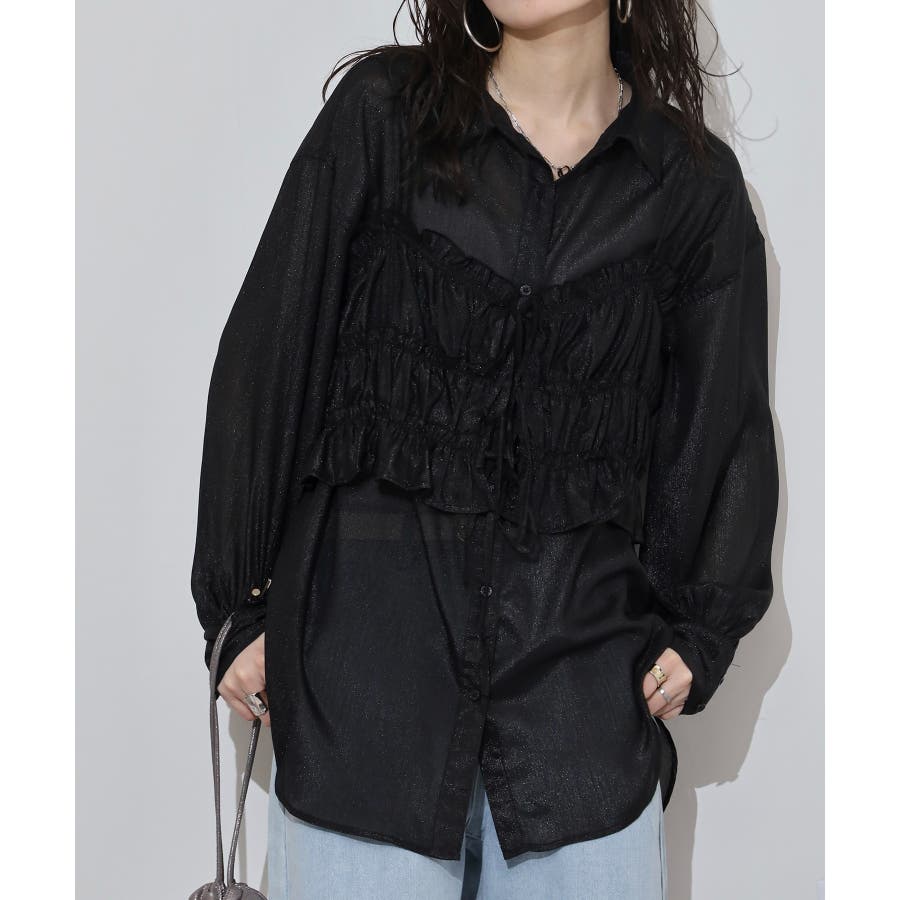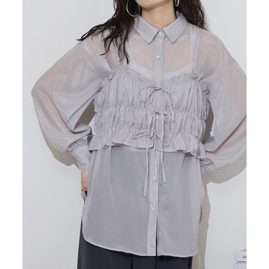 透け感が涼しげなシアー素材のシャツとりぼんギャザービスチェのセットで、こなれ感のあるレイヤードスタイルが簡単に完成する1着が登場。楊柳ならではのナチュラルなクシュっと感に、さりげなく輝く繊細なラメも魅力的な1枚です。ふんわり軽やかなシャツは程よい透け感があり、大人っぽい印象に!ビスチェのギャザーが華やかさをプラスし、ウエストラインを引き締めてくれるのでメリハリのあるシルエットが叶います。それぞれ単品でも着回しができるので、着こなしの幅が広がるアイテムです◎ゆとりのあるビッグサイズなので風通しもよく晩夏の時期や春先にも重宝します。