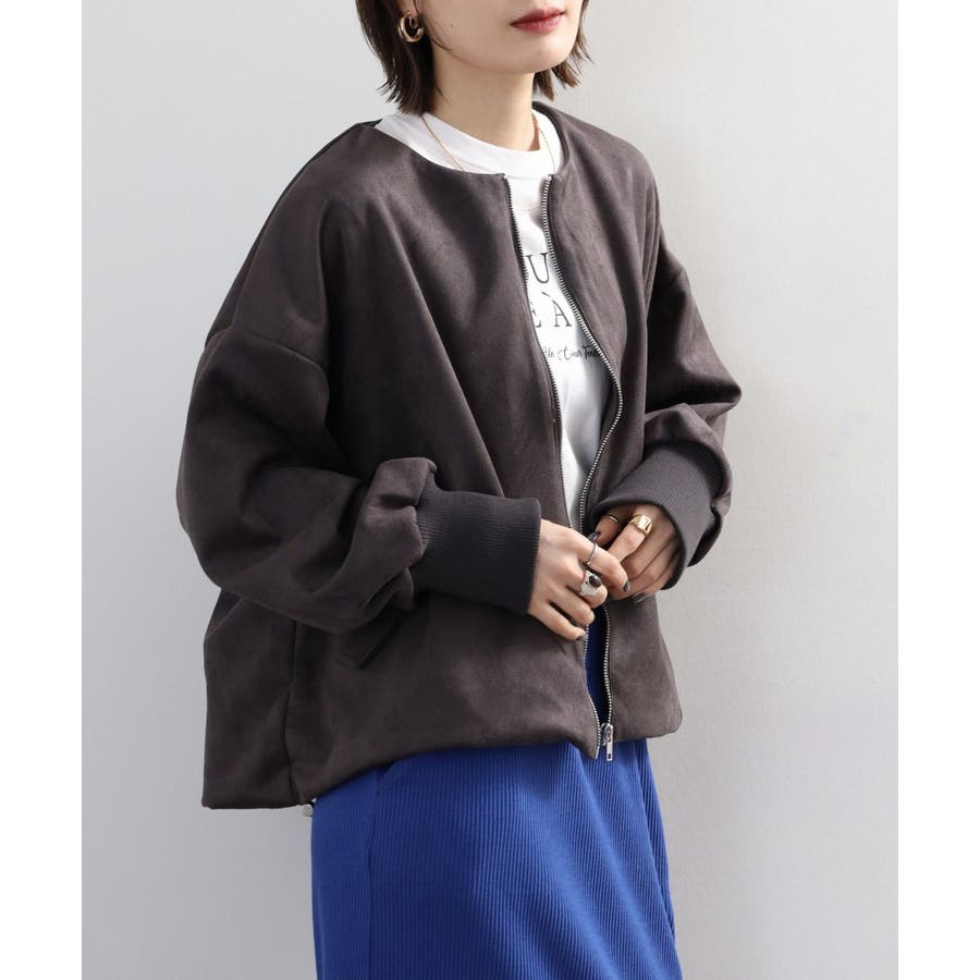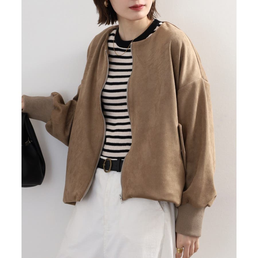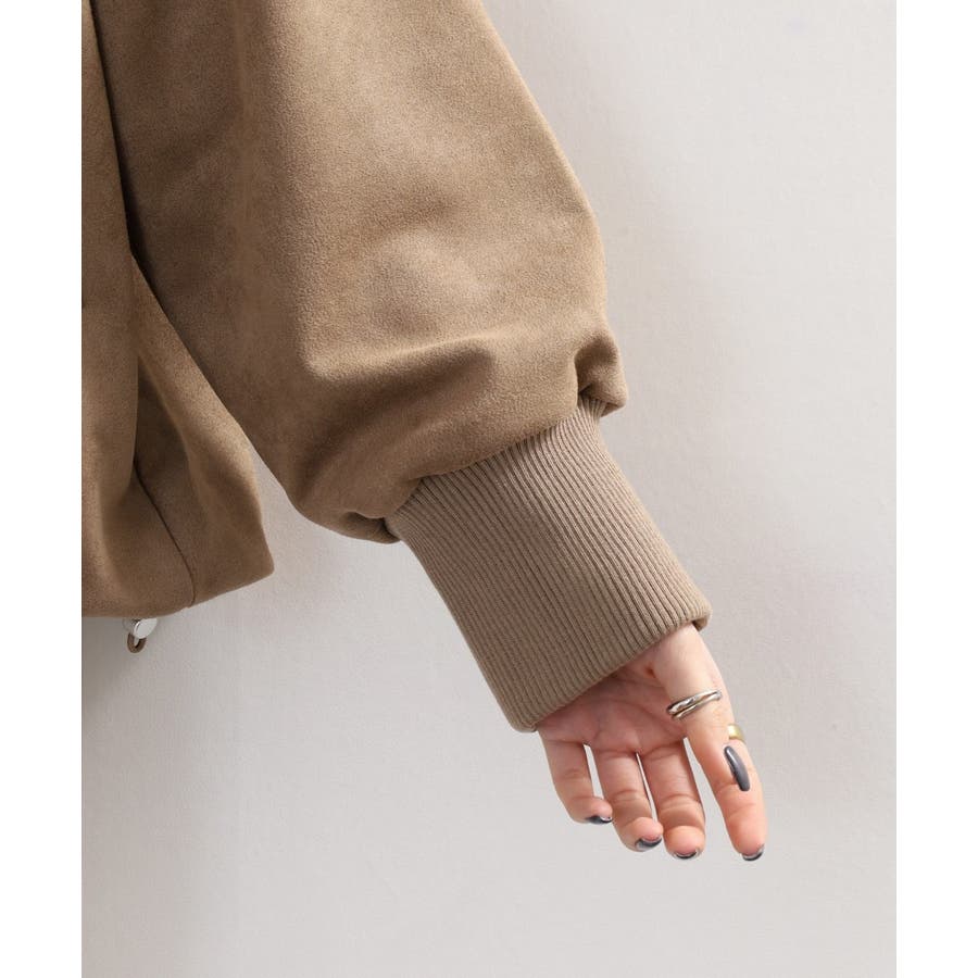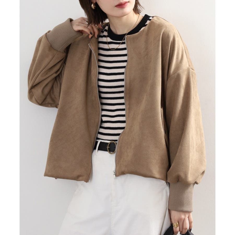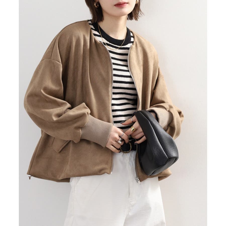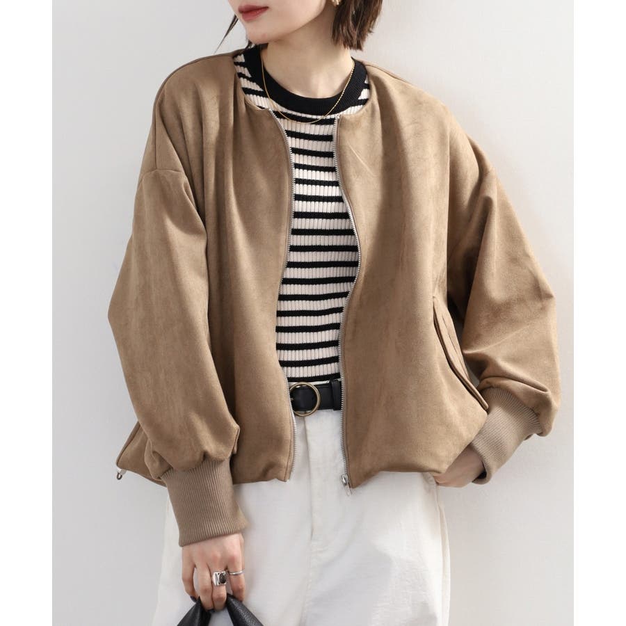 フェイクスエードポンチの上品な質感と軽やかな着心地が魅力で、バルーンシルエットが自然な立体感をつくる万能ブルゾン。