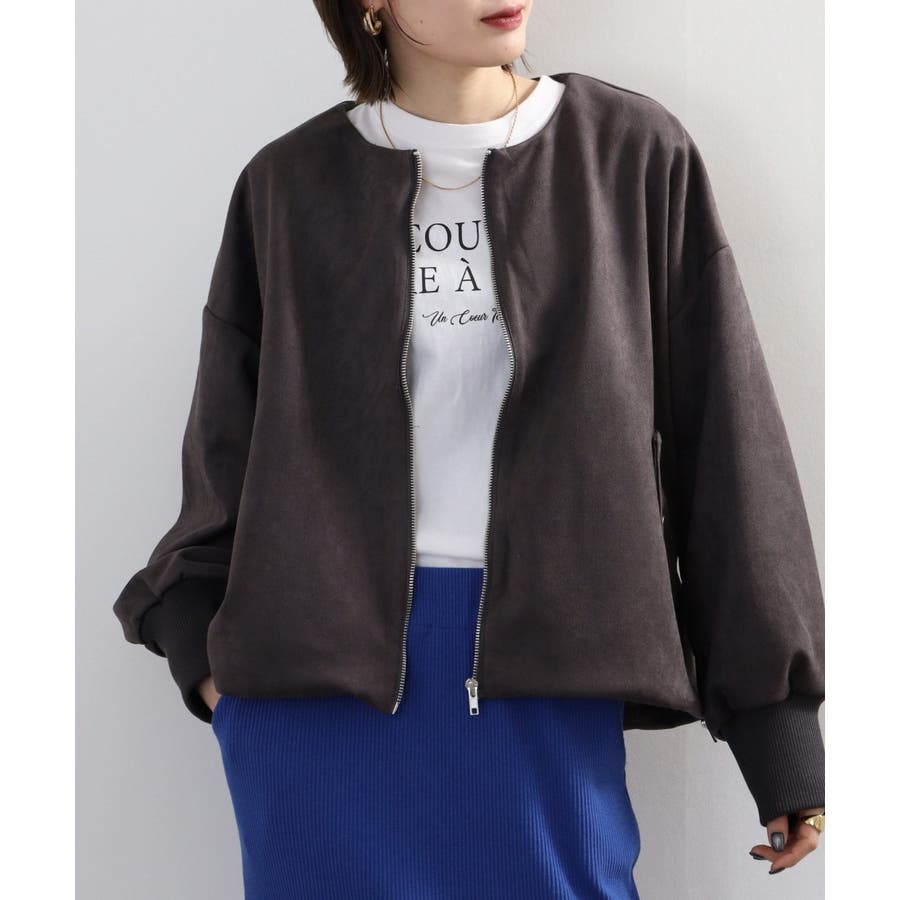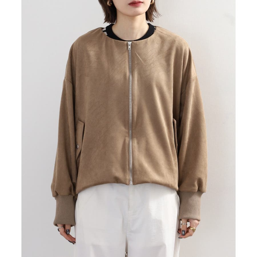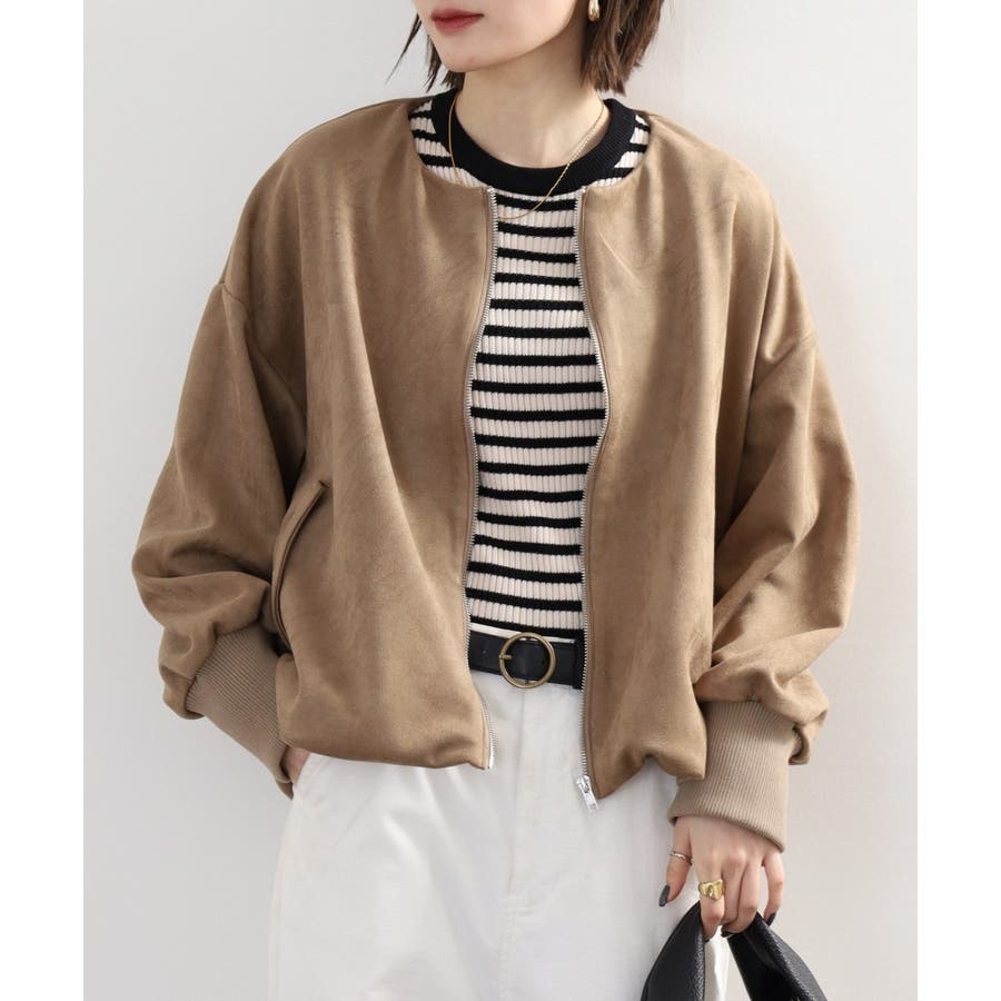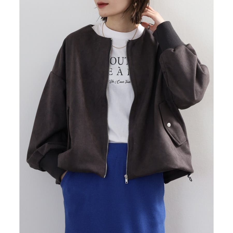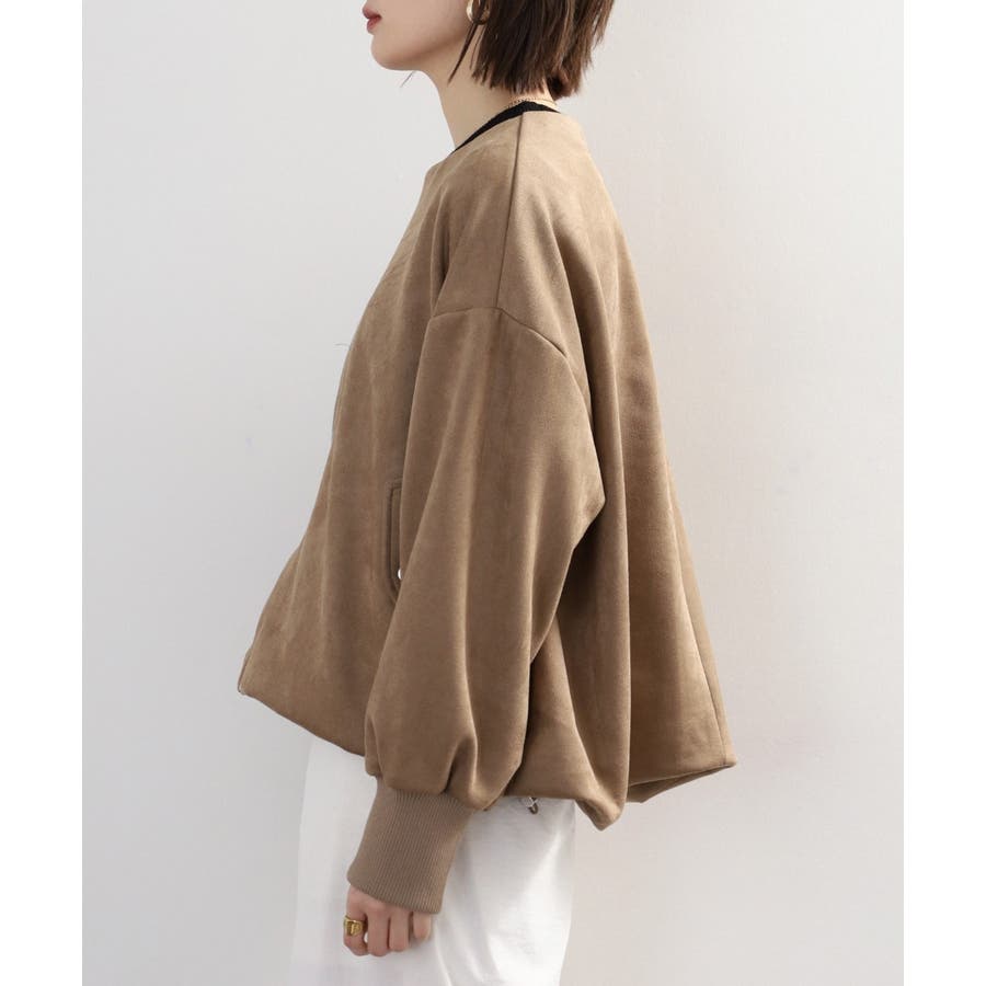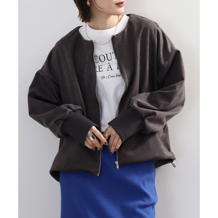 フェイクスエードポンチの上品な質感と軽やかな着心地が魅力で、バルーンシルエットが自然な立体感をつくる万能ブルゾン。