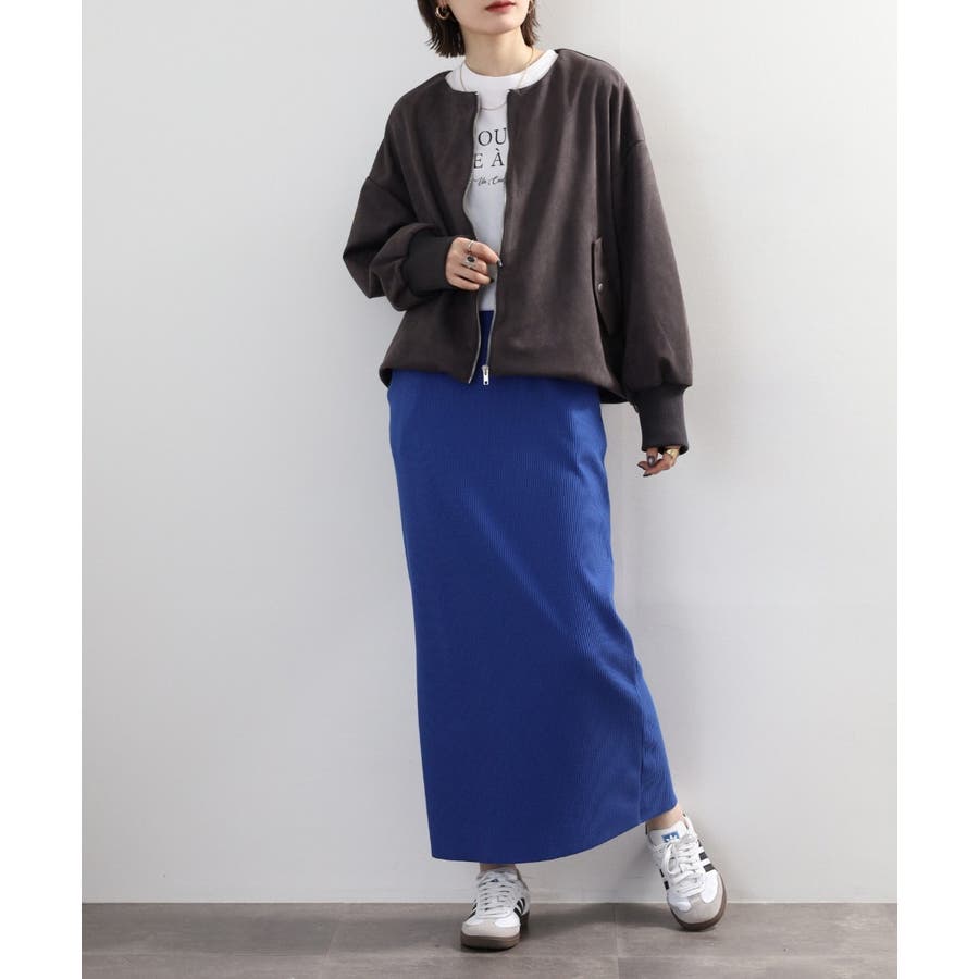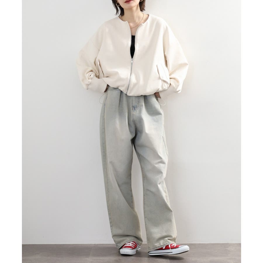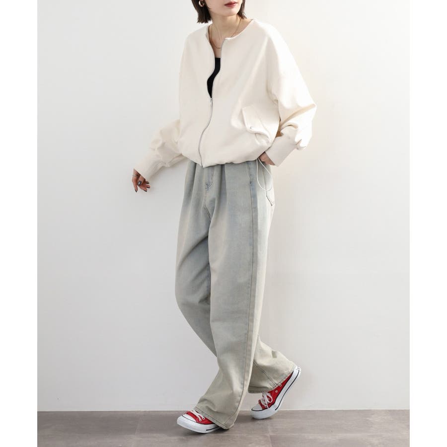 アクセサリーは小ぶりのイヤリングや腕時計を添えると、ブルゾンの丸みと調和した女性らしいスタイリングが完成します。