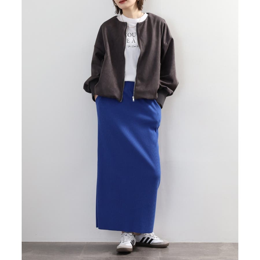 もう少しきれいめに寄せたい日は、リブニットをインナーにして、落ち感のあるサテンワイドパンツを合わせると、フェイクスエードの質感がより引き立ちます。