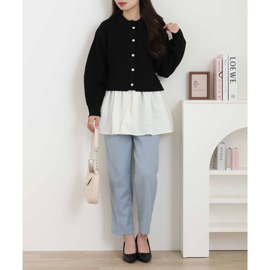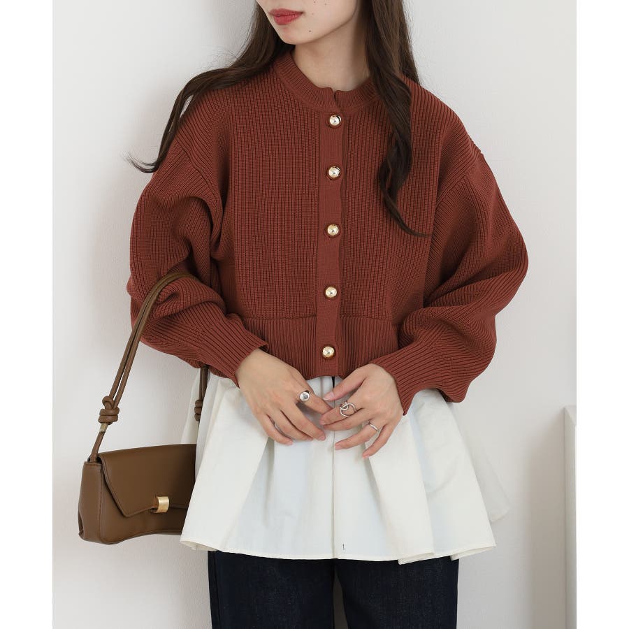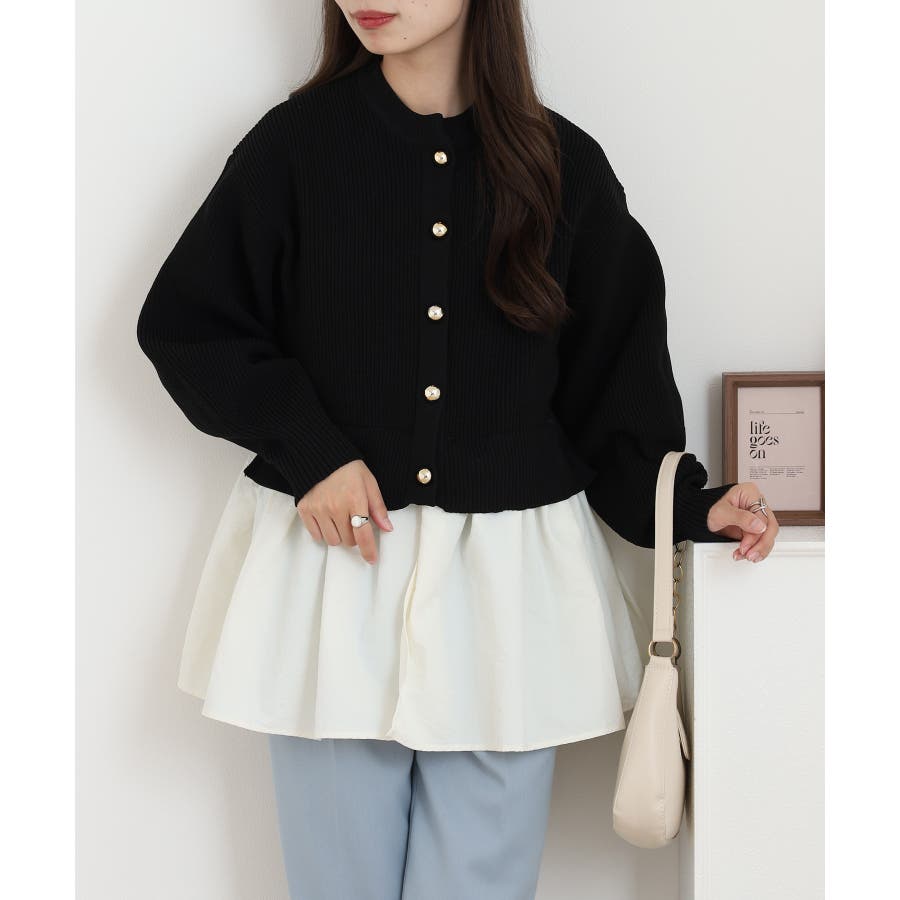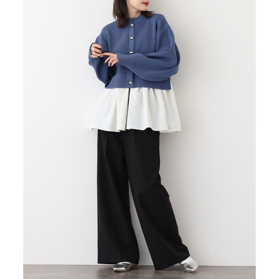 ・立体感のあるニットの風合いと、軽やかなシャツ素材のコントラストが新鮮な印象を演出します。